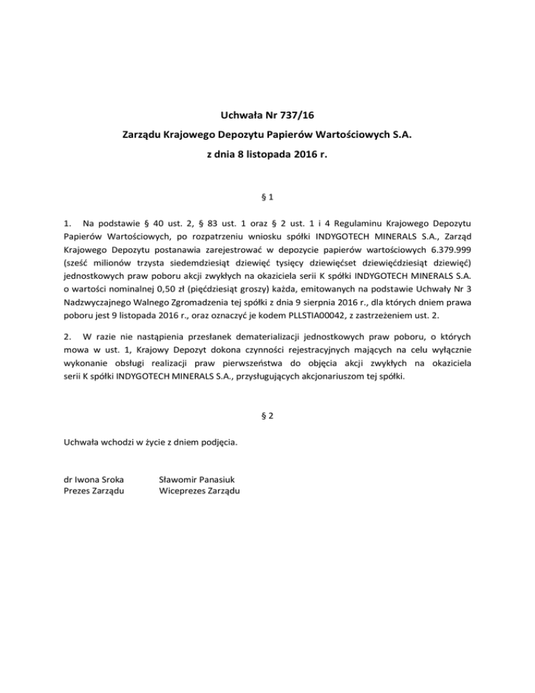 Uchwała Nr 737/16 Zarządu Krajowego Depozytu Papierów Wartościowych S.A. z dnia 8 listopada 2016 r. §1 1. Na podstawie § 40 ust. 2, § 83 ust. 1 oraz § 2 ust. 1 i 4 Regulaminu Krajowego Depozytu Papierów Wartościowych, po rozpatrzeniu wniosku spółki INDYGOTECH MINERALS S.A., Zarząd Krajowego Depozytu postanawia zarejestrowad w depozycie papierów wartościowych 6.379.999 (sześd milionów trzysta siedemdziesiąt dziewięd tysięcy dziewiędset dziewięddziesiąt dziewięd) jednostkowych praw poboru akcji zwykłych na okaziciela serii K spółki INDYGOTECH MINERALS S.A. o wartości nominalnej 0,50 zł (pięddziesiąt groszy) każda, emitowanych na podstawie Uchwały Nr 3 Nadzwyczajnego Walnego Zgromadzenia tej spółki z dnia 9 sierpnia 2016 r., dla których dniem prawa poboru jest 9 listopada 2016 r., oraz oznaczyd je kodem PLLSTIA00042, z zastrzeżeniem ust. 2. 2. W razie nie nastąpienia przesłanek dematerializacji jednostkowych praw poboru, o których mowa w ust. 1, Krajowy Depozyt dokona czynności rejestracyjnych mających na celu wyłącznie wykonanie obsługi realizacji praw pierwszeostwa do objęcia akcji zwykłych na okaziciela serii K spółki INDYGOTECH MINERALS S.A., przysługujących akcjonariuszom tej spółki. §2 Uchwała wchodzi w życie z dniem podjęcia. dr Iwona Sroka Prezes Zarządu Sławomir Panasiuk Wiceprezes Zarządu