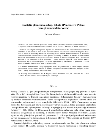 Fragm. Flor. Geobot. Polonica 15(2): 163–170, 2008 Dactylis glomerata subsp. lobata (Poaceae) w Polsce (uwagi nomenklatoryczne) MARTA MIZIANTY MIZIANTY, M. 2008. Dactylis glomerata subsp. lobata (Poaceae) in Poland (nomenclature notes). Fragmenta Floristica et Geobotanica Polonica 15(2): 163–170. Kraków. PL ISSN 1640-629X. ABSTRACT: The subject of the present paper is the determination of the correct nomenclature used in Poland of this taxon on basis of the previous detailed biosystematic studies of the genus Dactylis L. made in Poland by the author. According to the current International Code of Botanical Nomenclature this taxon has two correct epithets (according to the rank in which it is used). When the taxon is determined as a species, the correct name it is Dactylis polygama Horv., whereas in the case of the subspecies it is D. glomerata L. subsp. lobata (Drejer) H. Lindb. Present author recognized that in Poland the genus Dactylis is represented by one species D. glomerata L., with three subspecies. One of them is D. g. subsp. lobata. KEY WORDS: nomenclature, Dactylis polygama Horv., D. glomerata L. γ lobata Drejer, Dactylis glomerata L. subsp. lobata (Drejer) H. Lindb., Dactylis aschersoniana Graebn., Dactylis glomerata L. subsp. aschersoniana (Graebn.) Thell. M. Mizianty, Instytut Botaniki im. W. Szafera, Polska Akademia Nauk, ul. Lubicz 46, PL-31-512 Kraków, Polska; e-mail: [email protected] WSTĘP Rodzaj Dactylis L. jest poliploidalnym kompleksem, składającym się głównie z diploidów (2n = 14) i tetraploidów (2n = 28). Tetraploidy są nieliczne (kilka) ale za to szeroko rozprzestrzenione w Eurazji, natomiast liczniejsze (kilkanaście) diploidy charakteryzują się małym obszarem rozmieszczenia. Teren występowania diploidów stanowi około 5% powierzchni zajmowanej przez tetraploidy (MIZIANTY 1986, 1990). Genetyczne bariery pomiędzy diploidami, jak również pomiędzy tetraploidami, a także pomiędzy diploidami i tetraploidami nie są kompletne i dlatego w sprzyjających warunkach powstają mieszańce (MIZIANTY 1990, 1991a, b). Diploidom i tetraploidom nadawana była różna ranga systematyczna, od gatunku do odmiany, a czasem nawet formy. Obecnie w rodzaju Dactylis wyróżnia się tylko jeden gatunek D. glomerata L. z licznymi podgatunkami, odpowiadającymi poszczególnym tetraploidom i diploidom (TUTIN 1980; LINDLER & GARCIA 1997; AMIROUCHE & MISSET 2007). Spośród diploidów największy obszar rozmieszczenia ma Dactylis glomerata subsp. lobata (Drejer) H. Lindb., rosnąca w liściastych lasach zachodniej i centralnej Europy, 164 Fragm. Flor. Geobot. Polonica 15(2), 2008 południowej Skandynawii, zachodniej części europejskiej Rosji i na Kaukazie (MIZIANTY 1989). W literaturze europejskiej wymieniana jest pod nazwą D. polygama Horv. (PROKUDIN i in. 1977; STACE 1991; CONERT 1994, 2000), D. g. subsp. lobata (Drejer) H. Lindb. (STEFFEN 1940; TSVELEV 1984; DAVIES i in.1985) oraz D. g. subsp. aschersoniana (Graebn.) Thell. (GEORGIEV 1963; HEGI 1965; TUTIN 1980; WETSCHNIG 1984). Ten diploidalny takson występuje również w Polsce, wraz z dwoma tetraploidami: Dactylis glomerata L. subsp. glomerata i D. g. subsp. slovenica (Domin) Domin (MIZIANTY 1988, 1989). W polskiej literaturze spotykamy go pod trzema nazwami: Dactylis polygama Horv. (ZEMANEK 1989; MIREK i in. 1995; KORNAŚ i in. 1996; RUTKOWSKI 1998; TOKARSKAGUZIK 1999; KWIATKOWSKI 2000; SZELĄG 2000; DUBIEL 2003; PACYNA 2004; KWIATKOWSKI 2006; TOWPASZ 2006), Dactylis aschersoniana Graebn. (FALKOWSKI 1982; TOWPASZ 1987; ZAJĄC i in. 1993; KWIATKOWSKI 2001) i Dactylis glomerata subsp. aschersoniana (Graebn.) Thell. (MIZIANTY 1991b). Jak wynika z powyższego zestawienia, nawet ci sami autorzy stosują zamiennie różne nazwy. Jednak w polskiej literaturze nie spotkano się z użyciem epitetu lobata. Sporo komplikacji przysparza nomenklatura taksonu Dactylis polygama. Takson ten był opisywany pod trzema różnymi nazwami.: w 1774 jako nowy gatunek – D. polygama Horvatovsky, w 1838 jako nowa odmiana – D. glomerata γ lobata Drejer, w 1899 po raz drugi jako nowy gatunek – D. aschersoniana Graebner. Celem niniejszej pracy było ustalenie prawidłowej nomenklatury tego taksonu w oparciu o kodeks nomenklatury botanicznej (ICBN 2006)), a także w powiązaniu ze szczegółowymi studiami literaturowymi i zielnikowymi oraz z wynikami wcześniej przeprowadzonych przez autorkę szczegółowych badań taksonomicznych (MIZIANTY 1988, 1991b). Skróty autorów nazw roślin według – BRUMMITT i POWELL (1992). WYNIKI Na podstawie studiów literaturowych, chronologia nazewnictwa taksonu, który jest podmiotem badań w niniejszej pracy przedstawia się następująco: 1774 – Horvatovsky opisał Dactylis polygama. „Dactylis polygama panicula laxa; flosculis binis foemineis sessilibus, medio hermaphrodito, pedicellato. In dumetis in der Bruckau et in sylvis passim” (DOMIN 1943). 1791 – Lumnitzer drugi raz opisuje Dactylis polygama. „Culmus 4 – pedalis, erectus, striatus, glaber; geniculis 4–5 nigricantibus. Folia uncias 6–8 longa, semiunciam lata, striata, vaginis membranaceis. Ligula folii alba, truncate lacera. Panicula palmaris, spithamalis laxa, subsecunda. Pedunculi bini ex geniculis albicantibus. Spiculae lanceolatae. Glumae calycinae glabrae, virides, striatae. Floris hermaphroditi petala ovata, viridian, nitentia; antherae flavae; pistillum longitudine corollae: feminei petala lanceolata; pistillum corolla longius. Stigmata in fila fatiscentia” (DOMIN 1943). M. Mizianty: Dactylis glomerata – uwagi nomenklatoryczne 165 Ryc. 1 (Fig. 1). Dactylis glomerata γ lobata Drejer, leg. I. Vahl 08. 1837. I Skovene ved Kongens Möller z Muzeum Botanicznego w Kopenchadze (Botanical Museum Copenhagen) 166 Fragm. Flor. Geobot. Polonica 15(2), 2008 1838 – Drejer wyróżnia trzy odmiany Dactylis glomerata (adbreviata, diffusa, lobata). Diagnoza tej ostatniej: “γ lobata ramis panic. basi longo spatio nudis, 