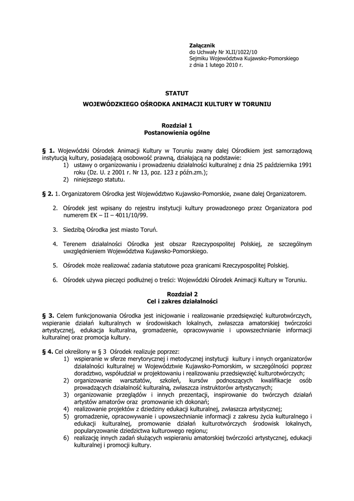 Załącznik do Uchwały Nr XLII/1022/10 Sejmiku Województwa Kujawsko-Pomorskiego z dnia 1 lutego 2010 r. STATUT WOJEWÓDZKIEGO OŚRODKA ANIMACJI KULTURY W TORUNIU Rozdział 1 Postanowienia ogólne § 1. Wojewódzki Ośrodek Animacji Kultury w Toruniu zwany dalej Ośrodkiem jest samorządową instytucją kultury, posiadającą osobowość prawną, działającą na podstawie: 1) ustawy o organizowaniu i prowadzeniu działalności kulturalnej z dnia 25 października 1991 roku (Dz. U. z 2001 r. Nr 13, poz. 123 z późn.zm.); 2) niniejszego statutu. § 2. 1. Organizatorem Ośrodka jest Województwo Kujawsko-Pomorskie, zwane dalej Organizatorem. 2. Ośrodek jest wpisany do rejestru instytucji kultury prowadzonego przez Organizatora pod numerem EK – II – 4011/10/99. 3. Siedzibą Ośrodka jest miasto Toruń. 4. Terenem działalności Ośrodka jest obszar Rzeczypospolitej Polskiej, ze szczególnym uwzględnieniem Województwa Kujawsko-Pomorskiego. 5. Ośrodek moŜe realizować zadania statutowe poza granicami Rzeczypospolitej Polskiej. 6. Ośrodek uŜywa pieczęci podłuŜnej o treści: Wojewódzki Ośrodek Animacji Kultury w Toruniu. Rozdział 2 Cel i zakres działalności § 3. Celem funkcjonowania Ośrodka jest inicjowanie i realizowanie przedsięwzięć kulturotwórczych, wspieranie działań kulturalnych w środowiskach lokalnych, zwłaszcza amatorskiej twórczości artystycznej, edukacja kulturalna, gromadzenie, opracowywanie i upowszechnianie informacji kulturalnej oraz promocja kultury. § 4. Cel określony w § 3 Ośrodek realizuje poprzez: 1) wspieranie w sferze merytorycznej i metodycznej instytucji kultury i innych organizatorów działalności kulturalnej w Województwie Kujawsko-Pomorskim, w szczególności poprzez doradztwo, współudział w projektowaniu i realizowaniu przedsięwzięć kulturotwórczych; 2) organizowanie warsztatów, szkoleń, kursów podnoszących kwalifikacje osób prowadzących działalność kulturalną, zwłaszcza instruktorów artystycznych; 3) organizowanie przeglądów i innych prezentacji, inspirowanie do twórczych działań artystów amatorów oraz promowanie ich dokonań; 4) realizowanie projektów z dziedziny edukacji kulturalnej, zwłaszcza artystycznej; 5) gromadzenie, opracowywanie i upowszechnianie informacji z zakresu Ŝycia kulturalnego i edukacji kulturalnej, promowanie działań kulturotwórczych środowisk lokalnych, popularyzowanie dziedzictwa kulturowego regionu; 6) realizację innych zadań słuŜących wspieraniu amatorskiej twórczości artystycznej, edukacji kulturalnej i promocji kultury. § 5. Zadania wymienione w § 4 Ośrodek realizuje we współpracy z samorządowymi instytucjami kultury, organizacjami pozarządowymi oraz osobami fizycznymi i prawnymi działającymi w sferze kultury, administracją samorządową i państwową, placówkami oświatowymi, uczelniami i mediami. Rozdział 3 Zarządzanie i organizacja § 6. 1. Ośrodkiem kieruje dyrektor, który zarządza instytucją, reprezentuje ją na zewnątrz i jest za nią odpowiedzialny. 2. Do 1) 2) 3) 4) 5) 6) 7) zakresu zadań dyrektora naleŜy w szczególności: kierowanie działalnością statutową; nadzór i dysponowanie mieniem Ośrodka; sporządzanie, zatwierdzanie oraz przedstawianie Organizatorowi planów rzeczowych i finansowych Ośrodka oraz sprawozdań z ich realizacji; wydawanie aktów prawa wewnętrznego, w tym zarządzeń i regulaminów; zawieranie i rozwiązywanie umów o pracę z pracownikami Ośrodka oraz wykonywanie pozostałych uprawnień i obowiązków związanych ze stosunkiem pracy; nadzór nad kontrolą wewnętrzną; składanie w imieniu Ośrodka oświadczeń woli oraz dokonywanie czynności prawnych. 3. Dyrektora powołuje i odwołuje Zarząd Województwa Kujawsko-Pomorskiego na zasadach i w trybie określonym w przepisach odrębnych. 4. Dyrektor moŜe kierować Ośrodkiem przy pomocy zastępcy. 5. Zastępcę dyrektora powołuje i odwołuje dyrektor Ośrodka. § 7. Strukturę wewnętrzną Ośrodka określa regulamin organizacyjny nadawany przez dyrektora Ośrodka na zasadach i w trybie określonym w obowiązujących przepisach. § 8. 1. Dyrektor moŜe powołać w Ośrodku stałe lub doraźne organy doradcze. 2. Tryb i zasady działania organów doradczych Ośrodka. określa regulamin nadany przez dyrektora Rozdział 4 Majątek i finanse § 9. 1. Ośrodek prowadzi gospodarkę finansową na zasadach określonych w ustawie o organizowaniu i prowadzeniu działalności kulturalnej i w innych właściwych przepisach. 2. Podstawą gospodarki finansowej Ośrodka jest roczny plan finansowy, zatwierdzony przez dyrektora, sporządzony w oparciu o wysokość dotacji Organizatora oraz planowane przychody. 3. Plan finansowy jest sporządzany w szczegółowości określonej przez Zarząd Województwa Kujawsko-Pomorskiego. 4. Dyrektor Ośrodka zatwierdza plan finansowy na dany rok w terminie 30 dni od podjęcia przez Sejmik Województwa Kujawsko-Pomorskiego uchwały w sprawie budŜetu Województwa na dany rok. 5. Zatwierdzony przez dyrektora Ośrodka plan finansowy oraz jego zmiany dokonywane w ciągu roku podlegają w trybie nadzoru zaopiniowaniu przez Zarząd Województwa KujawskoPomorskiego. 6. Roczne sprawozdanie finansowe Ośrodka podlega zatwierdzeniu przez Zarząd Województwa Kujawsko-Pomorskiego. § 10. Działalność Ośrodka jest finansowana wpływami z prowadzonej działalności, w tym ze sprzedaŜy składników majątku ruchomego, z wyjątkiem zabytków, oraz wpływami z najmu i dzierŜawy składników majątkowych, dotacjami z budŜetu, środkami otrzymanymi od osób fizycznych i prawnych oraz z innych źródeł. § 11. 1. Ośrodek moŜe prowadzić, jako dodatkową, działalność gospodarczą według zasad określonych w odrębnych przepisach. 2. Środki uzyskiwane z działalności gospodarczej mogą być wykorzystywane wyłącznie w celu finansowania działalności statutowej. Rozdział 5 Postanowienia końcowe § 12. Połączenia, podziału oraz lik