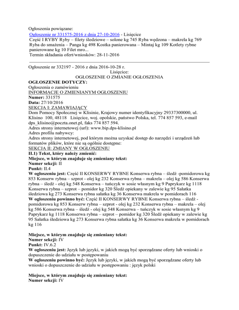 Ogłoszenia powiązane: Ogłoszenie nr 331575-2016 z dnia 27-10-2016 - Lisięcice Część I RYBY Ryby – filety śledziowe – solone kg 745 Ryba wędzona – makrela kg 769 Ryba do smażenia – Panga kg 498 Kostka panierowana – Mintaj kg 109 Kotlety rybne panierowane kg 10 Filet mro... Termin składania ofert/wniosków: 28-11-2016 Ogłoszenie nr 332197 - 2016 z dnia 2016-10-28 r. Lisięcice: OGŁOSZENIE O ZMIANIE OGŁOSZENIA OGŁOSZENIE DOTYCZY: Ogłoszenia o zamówieniu INFORMACJE O ZMIENIANYM OGŁOSZENIU Numer: 331575 Data: 27/10/2016 SEKCJA I: ZAMAWIAJĄCY Dom Pomocy Społecznej w Klisinie, Krajowy numer identyfikacyjny 29337300000, ul. Klisino 100, 48118 Lisięcice, woj. opolskie, państwo Polska, tel. 774 857 593, e-mail [email protected], faks 774 857 594. Adres strony internetowej (url): www.bip.dps-klisino.pl Adres profilu nabywcy: Adres strony internetowej, pod którym można uzyskać dostęp do narzędzi i urządzeń lub formatów plików, które nie są ogólnie dostępne: SEKCJA II: ZMIANY W OGŁOSZENIU II.1) Tekst, który należy zmienić: Miejsce, w którym znajduje się zmieniany tekst: Numer sekcji: II Punkt: II.4 W ogłoszeniu jest: Część II KONSERWY RYBNE Konserwa rybna – śledź -pomidorowa kg 853 Konserw rybna – szprot - olej kg 232 Konserwa rybna – makrela – olej kg 586 Konserwa rybna – śledź - olej kg 548 Konserwa – tuńczyk w sosie własnym kg 9 Paprykarz kg 1118 Konserwa rybna – szprot – pomidor kg 320 Śledź opiekany w zalewie kg 95 Sałatka śledziowa kg 273 Konserwa rybna sałatka kg 36 Konserwa makrela w pomidorach 116 W ogłoszeniu powinno być: Część II KONSERWY RYBNE Konserwa rybna – śledź pomidorowa kg 853 Konserw rybna – szprot - olej kg 232 Konserwa rybna – makrela – olej kg 586 Konserwa rybna – śledź - olej kg 548 Konserwa – tuńczyk w sosie własnym kg 9 Paprykarz kg 1118 Konserwa rybna – szprot – pomidor kg 320 Śledź opiekany w zalewie kg 95 Sałatka śledziowa kg 273 Konserwa rybna sałatka kg 36 Konserwa makrela w pomidorach kg 116 Miejsce, w którym znajduje się zmieniany tekst: Numer sekcji: IV Punkt: IV.6.2 W ogłoszeniu jest: Język lub języki, w jakich mogą być sporządzane oferty lub wnioski o dopuszczenie do udziału w postępowaniu W ogłoszeniu powinno być: Język lub języki, w jakich mogą być sporządzane oferty lub wnioski o dopuszczenie do udziału w postępowaniu : język polski Miejsce, w którym znajduje się zmieniany tekst: Numer sekcji: IV Punkt: IV.6.6 W ogłoszeniu jest: Część nr: 2 Nazwa: KONSERWY RYBNE 1) Krótki opis przedmiotu zamówienia (wielkość, zakres, rodzaj i ilość dostaw, usług lub robót budowlanych lub określenie zapotrzebowania i wymagań) a w przypadku partnerstwa innowacyjnego określenie zapotrzebowania na innowacyjny produkt, usługę lub roboty budowlane:Konserwa rybna – śledź -pomidorowa kg 853 Konserw rybna – szprot - olej kg 232 Konserwa rybna – makrela – olej kg 586 Konserwa rybna – śledź - olej kg 548 Konserwa – tuńczyk w sosie własnym kg 9 Paprykarz kg 1118 Konserwa rybna – szprot – pomidor kg 320 Śledź opiekany w zalewie kg 95 Sałatka śledziowa kg 273 Konserwa rybna sałatka kg 36 Konserwa makrela w pomidorach 116 W ogłoszeniu powinno być: Część nr: 2 Nazwa: KONSERWY RYBNE 1) Krótki opis przedmiotu zamówienia (wielkość, zakres, rodzaj i ilość dostaw, usług lub robót budowlanych lub określenie zapotrzebowania i wymagań) a w przypadku partnerstwa innowacyjnego określenie zapotrzebowania na innowacyjny produkt, usługę lub roboty budowlane:Konserwa rybna – śledź -pomidorowa kg 853 Konserw rybna – szprot - olej kg 232 Konserwa rybna – makrela – olej kg 586 Konserwa rybna – śledź - olej kg 548 Konserwa – tuńczyk w sosie własnym kg 9 Paprykarz kg 1118 Konserwa rybna – szprot – pomidor kg 320 Śledź opiekany w zalewie kg 95 Sałatka śledziowa kg 273 Konserwa rybna sałatka kg 36 Konserwa makrela w pomidorach kg 116