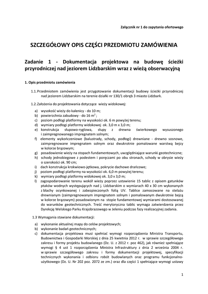Załącznik nr 1 do zapytania ofertowego SZCZEGÓŁOWY OPIS CZĘŚCI PRZEDMIOTU ZAMÓWIENIA Zadanie 1 - Dokumentacja projektowa na budowę ścieżki przyrodniczej nad jeziorem Lidzbarskim wraz z wieżą obserwacyjną 1. Opis przedmiotu zamówienia 1.1. Przedmiotem zamówienia jest przygotowanie dokumentacji budowy ścieżki przyrodniczej nad jeziorem Lidzbarskim na terenie działki nr 130/1 obręb 3 miasto Lidzbark. 1.2. Założenia do projektowania dotyczące wieży widokowej: a) b) c) d) e) f) g) h) i) j) k) l) wysokość wieży do kalenicy - do 10 m; powierzchnia zabudowy - do 16 m2 ; poziom podłogi platformy na wysokości ok. 6 m powyżej terenu; wymiary podłogi platformy widokowej ok. 3,0 m x 3,0 m; konstrukcja słupowo-ryglowa, słupy z drewna świerkowego wysuszonego i zaimpregnowanego impregnatem solnym; elementy wykończeniowe (balustrady, schody, podłogi) drewniane - drewno sosnowe, zaimpregnowane impregnatem solnym oraz dwukrotnie pomalowane warstwą bejcy w kolorze brązowym; posadowienie wieży na stopach fundamentowych, uwzględniające warunki geotechniczne; schody jednobiegowe z podestem i poręczami po obu stronach, schody w obrysie wieży o szerokości ok. 90 cm; dach konstrukcja krokwiowo-jętkowa, pokrycie dachowe drańcowe; poziom podłogi platformy na wysokości ok. 6,0 m powyżej terenu; wymiary podłogi platformy widokowej ok. 3,0 x 3,0 m; zagospodarowanie terenu wokół wieży poprzez ustawienie 15 tablic z opisem gatunków ptaków wodnych występujących nad j. Lidzbarskim o wymiarach 40 x 30 cm wykonanych z blachy ocynkowanej i zabezpieczonych folią UV. Tablice zamocowane na stelażu drewnianym (zaimpregnowanym impregnatem solnym i pomalowanym dwukrotnie bejcą w kolorze brązowym) posadowionym na stopie fundamentowej wymiarami dostosowanej do warunków geotechnicznych. Treść merytoryczna tablic wymaga zatwierdzenia przez Dyrekcję Welskiego Parku Krajobrazowego w Jeleniu podczas fazy realizacyjnej zadania. 1.3 Wymagania stawiane dokumentacji: a) wykonanie aktualnej mapy do celów projektowych; b) wykonanie badań geotechnicznych; c) dokumentacja projektowa musi spełniać wymogi rozporządzenia Ministra Transportu, Budownictwa i Gospodarki Morskiej z dnia 25 kwietnia 2012 r. w sprawie szczegółowego zakresu i formy projektu budowlanego (Dz. U. z 2012 r. poz 462), jak również spełniające wymogi § 4 ust 1 rozporządzenia Ministra Infrastruktury z dnia 2 września 2004 r. w sprawie szczegółowego zakresu i formy dokumentacji projektowej, specyfikacji technicznych wykonania i odbioru robót budowlanych oraz programu funkcjonalnoużytkowego (Dz. U. Nr 202 poz. 2072 ze zm.) oraz dla części 1 spełniające wymogi ustawy 1 z dnia 21 marca 1991 r., o obszarach morskich Rzeczypospolitej Polskiej i administracji morskiej (Dz. U. z 2003 r. Nr 153, poz. 1502, z późn. zm.); d) dokumentacja musi opisywać „cykl życia” przedmiotu opracowania. Przez cykl życia produktu należy rozumieć wszelkie możliwe kolejne lub powiązane fazy istnienia przedmiotu dostawy, usługi lub roboty budowlanej, w szczególności badanie, rozwój, projektowanie przemysłowe, testowanie, produkcję, transport, używanie, naprawę, modernizację, zmianę, utrzymanie przez okres istnienia, logistykę, szkolenie, zużycie, wyburzenie, wycofanie i usuwanie; e) dokumentacja projektowa musi opisywać funkcjonalność, wymagania środowiskowe poprzez odniesienie się w kolejności do preferencji: Polskich Norm przenoszących normy europejskie, norm innych państw członkowskich Europejskiego Obszaru Gospodarczego przenoszących normy europejskie, europejskich ocen technicznych, rozumianych jako udokumentowane oceny działania wyrobu budowlanego względem jego podstawowych cech, zgodnie z odpowiednim europejskim dokumentem oceny, w rozumieniu art. 2 pkt 12 rozporządzenia Parlamentu Europejskiego i Rady (UE) nr 305/2011 z dnia 9 marca 2011 r. ustanawiającego zharmonizowane warunki wprowadzania do obrotu wyrobów budowlanych i uchylającego dyrektywę Rady 89/106/EWG (Dz. Urz. UE L 88 z 04.04.2011, str. 5, z późn. zm.), wspólnych specyfikacji technicznych, rozumianych jako specyfikacje techniczne w dziedzinie produktów teleinformatycznych określone zgodnie z art. 13 i art. 14 rozporządzenia Parlamentu Europejskiego i Rady (UE) nr 1025/2012 z dnia 25 października 2012 r. w sprawie normalizacji europejskiej, zmieniającego dyrektywy Rady 89/686/EWG i 93/15/EWG oraz dyrektywy Parlamentu Europejskiego i Rady 94/9/WE, 94/25/WE, 95/16/WE, 97/23/WE, 98/34/WE, 2004/22/WE, 2007/23/WE, 2009/23/WE i 2009/105/WE oraz uchylającego decyzję Rady 87/95/EWG i decyzję Parlamentu Europejskiego i Rady nr 1673/2006/WE (Dz. Urz. UE L 316 z 14.11.2012, str. 12), norm międzynarodowych, specyfikacji technicznych, których przestrzeganie nie jest obowiązkowe, przyjętych przez instytucję normalizacyjną, wyspecjalizowaną w opracowywaniu specyfikacji technicznych w celu powtarzalnego i stałego stosowania w dziedzinach obronności i bezpieczeństwa, innych systemów referencji technicznych ustanowionych przez europejskie organizacje normalizacyjne; f) opracowanie dokumentacji zawierające plany, rysunki lub inne dokumenty umożliwiające jednoznaczne określenie rodzaju i zakresu robót budowlanych oraz uwarunkowań i dokładnej lokalizacji ich wykonania - 4 egz. oraz na płycie CD wersja elektroniczna w formacie - *.dwg lub w formacie oprogramowania w jakim wykonano projekty i *pdf - 2 egz. Wersja elektroniczna musi odpowiadać wersji papierowej pod względem zawartości (treści) jak i kolejności ułożenia dokumentów oraz rysunków; g) specyfikacji technicznej wykonania i odbioru robót - 4 egz. oraz na płycie CD wersja elektroniczna w formacie - *.dwg lub w formacie oprogramowania w jakim wykonano projekty i *pdf - 2 egz. Wersja elektroniczna musi odpowiadać wersji papierowej pod względem zawartości (treści) jak i kolejności ułożenia dokumentów oraz rysunków; h) wykonanie przedmia