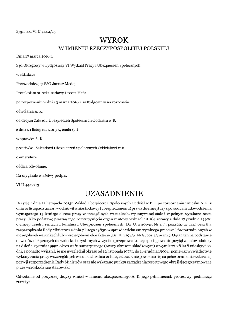 Sygn. akt VI U 4442/13 WYROK W IMIENIU RZECZYPOSPOLITEJ POLSKIEJ Dnia 17 marca 2016 r. Sąd Okręgowy w Bydgoszczy VI Wydział Pracy i Ubezpieczeń Społecznych w składzie: Przewodniczący SSO Janusz Madej Protokolant st. sekr. sądowy Dorota Hańc po rozpoznaniu w dniu 3 marca 2016 r. w Bydgoszczy na rozprawie odwołania A. K. od decyzji Zakładu Ubezpieczeń Społecznych Oddziału w B. z dnia 21 listopada 2013 r., znak: (...) w sprawie: A. K. przeciwko: Zakładowi Ubezpieczeń Społecznych Oddziałowi w B. o emeryturę oddala odwołanie. Na oryginale właściwy podpis. VI U 4442/13 UZASADNIENIE Decyzją z dnia 21 listopada 2013r. Zakład Ubezpieczeń Społecznych Oddział w B. – po rozpoznaniu wniosku A. K. z dnia 15 listopada 2013r. – odmówił wnioskodawcy (ubezpieczonemu) prawa do emerytury z powodu nieudowodnienia wymaganego 15-letniego okresu pracy w szczególnych warunkach, wykonywanej stale i w pełnym wymiarze czasu pracy. Jako podstawę prawną tego rozstrzygnięcia organ rentowy wskazał art.184 ustawy z dnia 17 grudnia 1998r. o emeryturach i rentach z Funduszu Ubezpieczeń Społecznych (Dz. U. z 2009r. Nr 153, poz.1227 ze zm.) oraz § 4 rozporządzenia Rady Ministrów z dnia 7 lutego 1983r. w sprawie wieku emerytalnego pracowników zatrudnionych w szczególnych warunkach lub w szczególnym charakterze (Dz. U. z 1983r. Nr 8, poz.43 ze zm.). Organ ten na podstawie dowodów dołączonych do wniosku i uzyskanych w wyniku przeprowadzonego postępowania przyjął za udowodniony na dzień 1 stycznia 1999r. okres stażu sumarycznego (równy okresom składkowym) w wymiarze 28 lat 8 miesięcy i 22 dni, a ponadto wyjaśnił, że nie uwzględnił okresu od 12 listopada 1973r. do 16 grudnia 1990r., ponieważ w świadectwie wykonywania pracy w szczególnych warunkach z dnia 21 lutego 2002r. nie powołano się na pełne brzmienie wskazanej pozycji rozporządzenia Rady Ministrów oraz nie wskazano punktu zarządzenia resortowego określającego zajmowane przez wnioskodawcę stanowisko. Odwołanie od powyższej decyzji wniósł w imieniu ubezpieczonego A. K. jego pełnomocnik procesowy, podnosząc zarzuty: 1) niezastosowania przepisów rozporządzenia Rady Ministrów z 7 lutego 1983r. w sprawie wieku emerytalnego pracowników zatrudnionych w szczególnych warunkach lub w szczególnym charakterze, w tym przede wszystkim punktu 4 i 24 działu XIV – „Prace różne”, stanowiących, iż „prace narażające na działanie promieniowania jonizującego oraz prace narażające na działanie pól elektromagnetycznych w zakresie od 0,1 do 300-000 MHz w strefie zagrożenia” oraz „kontrola międzyoperacyjna, kontrola jakości produkcji i usług oraz dozór inżynieryjno – techniczny na oddziałach i wydziałach, w których jako podstawowe wykonywane są prace wymienione w wykazie”, a przez to przyjęcie, że przytoczone przepisy prawa nie mogą stanowić samodzielnej podstawy do ustalenia, że odwołujący, który stale i w pełnym wymiarze czasu pracy wykonywał prace narażające na działanie pól elektromagnetycznych w zakresie od 0,1 do 300 MHz w strefie zagrożeń, dokonując jednocześnie kontroli jakości produkcji (praca w klatce Faraday’a), na stanowisku: kontroler jakości, przez okres od 12 listopada 1974r. do 16 grudnia 1990r. w Zakładach Radiowych (...) S.A.; 2) naruszenie przepisu art.87 Konstytucji RP poprzez przyjęcie, iż zarządzenie Ministra Hutnictwa i Przemysłu Maszynowego z 30 marca 1985r. w sprawie stanowisk pracy, na których wykonywane są prace w szczególnych warunkach lub w szczególnym charakterze w zakładach pracy resortu hutnictwa i przemysłu maszynowego (Dz. Urz. MG z 1985r. Nr 1, poz.1) stanowi źródło powszechnie obowiązującego prawa i w związku z tym może być samodzielną podstawą prawną do wydania decyzji o odmowie przyznania emerytury z tytułu pracy w szczególnych warunkach. Wskazując na powyższe zarzuty odwołujący domagał się zmiany przedmiotowej decyzji poprzez ustalenie, że ma on prawo do emerytury od 15 listopada 2013r., t.j. dnia złożenia wniosku o emeryturę z tytułu pracy w warunkach szczególnych w Zakładach Radiowych (...) S.A. w okresie od 12 listopada 1974r. do 16 grudnia 1990r. na stanowisku kontroler jakości. Ponadto ubezpieczony domagał się również stwierdzenia, że organ rentowy ponosi odpowiedzialność za nieustalenie ostatniej okoliczności niezbędnej do wydania decyzji, a także zasądzenia od organu rentowego na swoją rzecz kosztów procesu wraz z kosztami zastępstwa procesowego w wysokości 360 zł. W odpowiedzi na odwołanie organ rentowy wnosił o oddalenie odwołania, powołując argumenty przedstawione w uzasadnieniu zaskarżonej decyzji. Sąd Okręgowy ustalił i rozważył, co następuje: Ubezpieczony A. K. (urodz. (...)) w dniu 15 listopada 2013r. złożył w Zakładzie Ubezpieczeń Społecznych wniosek o emeryturę w obniżonym w stosunku do powszechnego wieku, z tytułu pracy w szczególnych warunkach. Wniosek ten rozpoznany został odmownie zaskarżoną w niniejszej sprawie decyzją. Ubezpieczony nie jest członkiem otwartego funduszu emerytalnego, a na dzień 1 stycznia 1999r. posiada okres zatrudnienia wymagany do uzyskania dochodzonego świadczenia w wymiarze 28 lat 8 miesięcy i 22 dni. (okoliczności niesporne, potwierdzone dowodami z dokumentów zebranymi w aktach emerytalnych i aktach kapitału początkowego) W okresie od 1 września 1969r. do 31 stycznia 1992r. ubezpieczony zatrudniony był w ramach stosunku pracy w Zakładach Radiowych (...) w B. początkowo jako uczeń na podstawie umowy o naukę zawodu radiomechanika, a następnie od 1 lipca 1972r. (po zakończeniu nauki zawodu) w pełnym wymiarze czasu pracy na stanowisku radiomechanika. W okresie od 27 października 1972r. do 14 października 1972r. odbywał on czynną służbę wojskową, a od 12 listopada 1974r. ponownie podjął zatrudnienie u wyżej wskazanego pracodawcy na stanowisku kontrolera tech. wyrobów- po