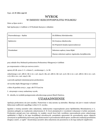 Sygn. akt II AKa 155/16 WYROK W IMIENIU RZECZYPOSPOLITEJ POLSKIEJ Dnia 14 lipca 2016 r. Sąd Apelacyjny w Lublinie w II Wydziale Karnym w składzie: Przewodniczący - Sędzia SA Elżbieta Jóźwiakowska Sędziowie: SA Grażyna Jakubowska SA Wojciech Zaręba (sprawozdawca) Protokolant Sekretarz sądowy Anna Kijak Starszy sekretarz sądowy Agnieszka Jarzębkowska przy udziale Ewy Stelmach prokuratora Prokuratury Okręgowej w Lublinie po rozpoznaniu w dniu 30 czerwca 2016 r. sprawy Z. D. syna J. i I. z domu C., urodzonego (...) w M. oskarżonego z art. 286 § 1 kk w zw. z art. 294 § 1 kk, art. 286 § 1 kk i art. 13 § 1 kk w zw. z art. 286 § 1 kk w zw. z art. 11 § 2 kk w zw. z art. 294 § 1 kk z powodu apelacji wniesionej przez prokuratora od wyroku Sądu Okręgowego w Lublinie z dnia 18 grudnia 2015 r., sygn. akt IV K 90/09 I. utrzymuje w mocy zaskarżony wyrok; II. określa, że wydatki postępowania odwoławczego ponosi Skarb Państwa. UZASADNIENIE Apelacja prokuratora nie jest zasadna. Postawione w niej zarzuty są nietrafne. Skarżący nie jest w stanie wykazać faktycznej wadliwości zapadłego wobec Z. D. wyroku. Zgodnie z treścią zarzutów aktu oskarżenia, niekorzystne rozporządzenie przez Spółdzielnię Mieszkaniową w L. mieniem polegało na wypłaceniu oskarżonemu Z. D. kwot pieniężnych w wysokości wskazanej w tychże zarzutach. Prokurator przyjął przy tym założenie, że wypłaty owych kwot były wynikiem wprowadzenia przez oskarżonego spółdzielni w błąd co do jego kwalifikacji zawodowych, posiadania uprawnień do prowadzenia spraw objętych zawartymi ze spółdzielnią umowami, jego skuteczności w prowadzeniu takich spraw, możliwości realizacji przedmiotu drugiej z umów „w ogóle”. Konstrukcja zarzutów aktu oskarżenia nie pozostawia co do tego żadnych wątpliwości. Założenie oskarżyciela publicznego jest błędne i wynika z uproszczenia zaistniałej sytuacji faktycznej. Wypłacone oskarżonemu przez uznaną za pokrzywdzoną spółdzielnię wynagrodzenie należne było bowiem dopiero za wykonanie zawartych między spółdzielnią a oskarżonym umów (nawet w tej części, która płatna była z góry), nie zaś za samo ich tylko zawarcie. Tymczasem te elementy, które prokurator uznał po stronie oskarżonego za wprowadzenie w błąd, przed chwilą wskazane, skutkowały jedynie zawarciem umów (skłoniły do tego spółdzielnię). Kwestia sposobu wykonania umów przez oskarżonego natomiast nie została w zarzutach aktu oskarżenia ujęta. Ergo, prokurator- niezależnie od tego, jak wykonanie tych umów ocenia w uzasadnieniu swej apelacji- nie uznaje jednak, aby oskarżony już w chwili zawierania umów bądź to w ogóle nie miał zamiaru wywiązania się z nałożonych nimi obowiązków, bądź zamierzał realizować je w sposób nieprawidłowy. Jak zresztą wynika z materiału dowodowego, sama spółdzielniaprzed zmianami w jej władzach- wykonaniem umów przez oskarżonego była usatysfakcjonowana i w żadnym razie nie czuła się pokrzywdzona. W tym stanie rzeczy nie ma powiązania między tym, co prokurator uznał za wprowadzenie przez oskarżonego spółdzielni w błąd (niezależnie od tego, czy uznawane przez niego za nieprawdziwe okoliczności rzeczywiście były nieprawdziwe), a samym faktem rozporządzenia przez spółdzielnię mieniem. Powtórzyć należy- wypłata wynagrodzenia związana była z wykonaniem umów przez oskarżonego, a nie tylko z samym faktem ich zawarcia. Tymczasem nie zarzucono oskarżonemu braku zamiaru realizacji umów, czy zamiaru realizacji niewłaściwej. W tej sytuacji czyny zarzucone oskarżonemu nie wyczerpują znamion przestępstwa z art. 286 § 1 kk, ani też jakiegokolwiek innego przestępstwa. Zatem Sąd Okręgowy w pełni zasadnie uniewinnił oskarżonego od obu postawionych mu zarzutów (kwestia, w jaki sposób to uargumentował, gdy uwzględnić realia niniejszej sprawy, nie ma znaczenia). Słuszność tego rozstrzygnięcia skutkuje utrzymaniem w mocy zaskarżonego wyroku przez sąd ad quem. Z powyższych przyczyn Sąd Apelacyjny orzekł, jak w części dyspozytywnej swego wyroku. Rozstrzygnięcie o wydatkach postępowania odwoławczego uzasadnia art. 632 pkt. 2 kpk.