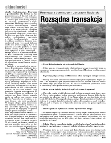 aktualnoci strefy funkcjonalne. Pierwsza o powierzchni ok. 3,6 ha ma byæ przeznaczona na 5 dzia³ek pod zabudowê mieszkaniow¹ jednorodzinn¹ i 1 dzia³kê pod teren us³ug, turystyki, rekreacji, gastronomii z dopuszczeniem zabudowy mieszkaniowej i obs³ugê komunikacyjn¹. Ochrona tego terenu przewidywana jest poprzez m.in. dopuszczenie zabudowy tylko we frontowej czêci dzia³ek do linii rzêdnej zalewowej, zakaz niwelacji terenu poza lini¹ zalewow¹, jednolit¹ architekturê budynków o dwóch kondygnacjach parter i poddasze u¿ytkowe, dachach mansardowych przy wysokoci kalenicy dachu nie przekraczaj¹cej 8,5 m od poziomu posadzki parteru, a tak¿e bardzo istotny nakaz budowy ogrodzeñ wy³¹cznie w pe³ni a¿urowych. Druga strefa o powierzchni ok. 13 ha stanowi¹ca pozosta³¹ czêæ nieruchomoci, ma stanowiæ teren publiczny zieleni krajobrazowej i wód powierzchniowych o funkcji rekreacji, chroniony szczegó³owymi zapisami planu. Zgodnie z porozumieniem zawartym z Burmistrzem, w³aciciel terenu wyrazi³ zgodê na sprzeda¿ Miastu w³anie tej drugiej strefy zajmuj¹cej ok. 80% powierzchni ca³ego terenu za cenê 400 tysiêcy z³otych w zamian za umieszczenie w opracowywanym planie zagospodarowania przytoczonych wy¿ej propozycji dotycz¹cych mo¿liwoci zabudowy terenu oraz pomoc w realizacji infrastruktury technicznej na kwotê ok. 150 tysiêcy z³otych. Z uwagi na korzystne warunki porozumienia i szanse przeznaczenia 13 ha obszaru Zakola na publiczne cele rekreacyjne, Rada Miasta wyrazi³a zgodê na zakup tego gruntu przez Miasto Puszczykowo. Uwa¿am, ¿e temat Zakola nie jest zamkniêty. W drugim etapie, przy korzystniejszej sytuacji finansowej Miasta i takiej potrzebie spo³ecznej, mo¿liwy jest powrót do negocjacji w sprawie zakupu pozosta³ej czêci terenu. Plan zagospodarowania terenów Zakola jest ci¹gle jeszcze w opracowaniu. Uwzglêdnienie w nim opisanych wczeniej ustaleñ daje mo¿liwoæ wywa¿onego rozstrzygniêcia tematu. W tej sytuacji spróbujmy znaleæ pozytywne aspekty tam, gdzie na dzisiaj inne rozwi¹zania s¹ ograniczone. Janusz Szafarkiewicz Wiceprzewodnicz¹cy Rady Miasta Puszczykowa cz³onek Komisji £adu Przestrzennego, Urbanistyki i Architektury Rady Miasta 3 Rozmowa z burmistrzem Januszem Napiera³¹ Rozs¹dna transakcja Czêæ Zakola stanie siê w³asnoci¹ Miasta. Uda³o nam siê wynegocjowaæ z w³acicielem warunki transakcji, które s¹ rozs¹dnym kompromisem pomiêdzy mo¿liwociami Miasta, a oczekiwaniami w³aciciela. Pojawiaj¹ siê zarzuty, ¿e Miasto nie chce wykupiæ ca³ego terenu. Miêdzy chceniem, a mo¿liwociami istnieje ogromna przepaæ. Kupno ponad 13 ha najcenniejszych przyrodniczo i widokowo, sprawi, ¿e nasze Miasto nie utraci tego piêknego obszaru. W rêkach w³aciciela pozostanie teren w niewielkiej czêci przeznaczony pod zabudowê. Mo¿e warto by³oby jednak kupiæ tak¿e ten fragment? Wszystko zale¿y w jakich kategoriach bêdziemy rozpatrywaæ s³owo warto. To, co najcenniejsze, bêdzie obszarem publicznym. Jeszcze kilka lat temu mówi³o siê o kupnie choæ 4 6 ha. Teraz uda³o siê pozyskaæ du¿o wiêcej, bo ok. 80% Zakola. W przypadku kupna ca³ego Zakola mówi siê o 2 milionach z³otych. O tym, jak du¿a to kwota dla bud¿etu Puszczykowa, niech wiadczy fakt, ¿e jest to wiêcej, ni¿ w tym roku mo¿emy wydaæ na pomoc spo³eczn¹ i socjaln¹. Trzeba jednak bêdzie na Zakolu wybudowaæ drogê. W trakcie negocjacji ustalone zosta³y zasady kupna Zakola przez Miasto sporz¹dzenie planu zagospodarowania, zap³ata 400 tys. z³ w gotówce oraz partycypowanie przy budowie drogi i infrastruktury technicznej. Na ten ostatni cel przeznaczymy ok. 150 tysiêcy z³. S¹ to zadania, które gmina i tak musia³aby wykonaæ. Gdyby Miasto pozyska³o tak¿e czêæ ,,budowlan¹, mia³oby gdzie postawiæ np. halê sportow¹, p³ywalniê lub inne obiekty sportowe. Uwa¿am, ¿e to nie jest obszar pod du¿e obiekty, które przes³oni¹ widok Zakola, jak równie¿ spowoduj¹ zwiêkszenie ruchu samochodów na tym terenie. Zgodnie z zapisami w projekcie planu, mog¹ tam stan¹æ domy jednorodzinne i to nie za du¿e. Miasto bêdzie mia³o pe³n¹ kontrolê nad tym, co tam powstanie. Red