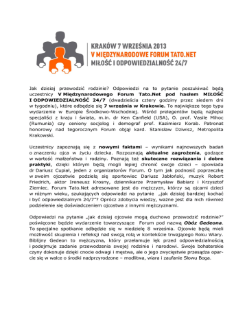 Jak dzisiaj przewodzić rodzinie? Odpowiedzi na to pytanie poszukiwać będą uczestnicy V Międzynarodowego Forum Tato.Net pod hasłem MIŁOŚĆ I ODPOWIEDZIALNOŚĆ 24/7 (dwadzieścia cztery godziny przez siedem dni w tygodniu), które odbędzie się 7 września w Krakowie. To największe tego typu wydarzenie w Europie Środkowo-Wschodniej. Wśród prelegentów będą najlepsi specjaliści z kraju i świata, m.in. dr Ken Canfield (USA), O. prof. Vasile Mihoc (Rumunia) czy ceniony socjolog i demograf prof. Kazimierz Korab. Patronat honorowy nad tegorocznym Forum objął kard. Stanisław Dziwisz, Metropolita Krakowski. Uczestnicy zapoznają się z nowymi faktami – wynikami najnowszych badań o znaczeniu ojca w życiu dziecka. Rozpoznają aktualne zagrożenia, godzące w wartość małżeństwa i rodziny. Poznają też skuteczne rozwiązania i dobre praktyki, dzięki którym będą mogli lepiej chronić swoje dzieci – opowiada dr Dariusz Cupiał, jeden z organizatorów Forum. O tym jak podnosić poprzeczkę w swoim ojcostwie podzielą się sportowiec Dariusz Jabłoński, muzyk Robert Friedrich, aktor Ireneusz Krosny, dziennikarze Przemysław Babiarz i Krzysztof Ziemiec. Forum Tato.Net adresowane jest do mężczyzn, którzy są ojcami dzieci w różnym wieku, szukających odpowiedzi na pytanie „jak dzisiaj bardziej kochać i być odpowiedzialnym 24/7”? Oprócz zdobycia wiedzy, ważne jest dla nich również podzielenie się doświadczeniem ojcostwa z innymi mężczyznami. Odpowiedzi na pytanie „jak dzisiaj ojcowie mogą duchowo przewodzić rodzinie?” poświęcone będzie wydarzenie towarzyszące Forum pod nazwą Obóz Gedeona. To specjalne spotkanie odbędzie się w niedzielę 8 września. Ojcowie będą mieli możliwość skupienia i refleksji nad swoją rolą w kontekście trwającego Roku Wiary. Biblijny Gedeon to mężczyzna, który przełamuje lęk przed odpowiedzialnością i podejmuje zadanie przewodzenia swojej rodzinie i narodowi. Swoje bohaterskie czyny dokonuje dzięki cnocie odwagi i męstwa, ale o jego zwycięstwie przesądza oparcie się w walce o środki nadprzyrodzone – modlitwa, wiara i zaufanie Słowu Boga. Kiedy? 7.09.2013 (sobota), godz. 10-18 8.09.2013 (niedziela), godz. 9-14 V Międzynarodowe Forum Tato.Net Obóz Gedeona Gdzie? Centrum Hotelowo-Konferencyjne "Witek" Modlniczka, ul. Handlowców 14, Modlnica-Kraków Kto jest organizatorem? Fundacja Cyryla i Metodego, zwracając uwagę na niezastąpioną i niedocenianą rolę ojca w rodzinie, podjęła w 2004 roku Inicjatywę Tato.Net, której celem jest pomaganie mężczyznom w odkrywaniu świadomego i odpowiedzialnego ojcostwa, oraz tworzenie klimatu społecznego sprzyjającego zaangażowaniu ojców w rodzinie. Fundacja podejmuje następujące działania: organizuje warsztaty, seminaria i konferencje dla ojców; prowadzi serwis internetowy www.tato.net; przeprowadza badania i sondaże; wydaje publikacje na temat ojcostwa. Tato.Net to także sieć współpracy ojców, inspirujących się wzajemnie doświadczeniem, wiedzą i umiejętnościami. Poprzednie Fora Tato.Net odbywały się w Lublinie (2004), Głogowie (2005), Lwowie (2006) oraz Warszawie (2010). Wśród prelegentów znajdą się m.in.: Dr Ken Canfield (USA) – założyciel National Center for Fathering i członek Międzynarodowej Rady Programowej Tato.Net, specjalista w problematyce rodziny, autor bestsellerowych książek na temat ojcostwa, uhonorowany w 2010 r. Krzyżem Kawalerskim Orderu Zasługi Rzeczypospolitej Polskiej. Ojciec pięciorga dzieci. O. prof. Vasile Mihoc (Rumunia) – Prawosławny duchowny, biblista, studiował w Bukareszcie i Jerozolimie. Od 1974 r. wykłada Nowy Testament w Sibiu, w Rumunii. Jest członkiem Towarzystwa Naukowego Biblistów Prawosławnych. Moderator Lords Army – znaczącego ruchu odnowy wśród rumuńskich prawosławnych chrześcijan. Pracuje również dla organizacji World Vision. Z żoną Octavią mają trzynaścioro dzieci. prof. Kazimierz Korab – socjolog i demograf, rektor Szkoły Wyższej im. Bogdana Jańskiego. Prowadzi m. in. wykłady z demografii społecznej, jest prezesem Konwentu Chrześcijan dla Europy oraz członkiem Rady Programowej Tato.Net. Kontakt: Dariusz Cupiał, tel. 81 527 99 13, e-mail: [email protected]