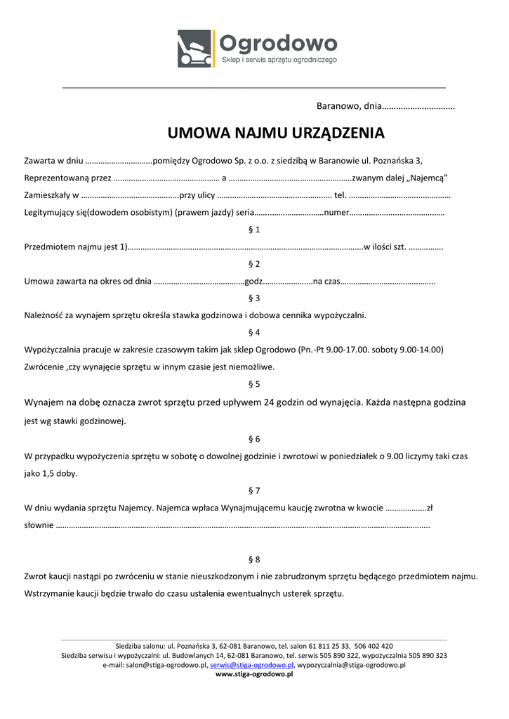__________________________________________________________________________________ Baranowo, dnia…………………………. UMOWA NAJMU URZĄDZENIA Zawarta w dniu ………………………….pomiędzy Ogrodowo Sp. z o.o. z siedzibą w Baranowie ul. Poznańska 3, Reprezentowaną przez ……….………………………………… a …………………………………………………zwanym dalej „Najemcą” Zamieszkały w ……………….……………………..przy ulicy …………………………………………….. tel. ….………………………….………… Legitymujący się(dowodem osobistym) (prawem jazdy) seria……..……………………numer…………………..………………… §1 Przedmiotem najmu jest 1)……………………………………………………………………………………………….w ilości szt. ……………. §2 Umowa zawarta na okres od dnia ……………………………………godz.………………….na czas…………………………………….. §3 Należność za wynajem sprzętu określa stawka godzinowa i dobowa cennika wypożyczalni. §4 Wypożyczalnia pracuje w zakresie czasowym takim jak sklep Ogrodowo (Pn.-Pt 9.00-17.00. soboty 9.00-14.00) Zwrócenie ,czy wynajęcie sprzętu w innym czasie jest niemożliwe. §5 Wynajem na dobę oznacza zwrot sprzętu przed upływem 24 godzin od wynajęcia. Każda następna godzina jest wg stawki godzinowej. §6 W przypadku wypożyczenia sprzętu w sobotę o dowolnej godzinie i zwrotowi w poniedziałek o 9.00 liczymy taki czas jako 1,5 doby. §7 W dniu wydania sprzętu Najemcy. Najemca wpłaca Wynajmującemu kaucję zwrotna w kwocie ……………….zł słownie ……………………………………………………………………………………………………………………………………………………….. §8 Zwrot kaucji nastąpi po zwróceniu w stanie nieuszkodzonym i nie zabrudzonym sprzętu będącego przedmiotem najmu. Wstrzymanie kaucji będzie trwało do czasu ustalenia ewentualnych usterek sprzętu. _____________________________________________________________________________________________________ Siedziba salonu: ul. Poznańska 3, 62-081 Baranowo, tel. salon 61 811 25 33, 506 402 420 Siedziba serwisu i wypożyczalni: ul. Budowlanych 14, 62-081 Baranowo, tel. serwis 505 890 322, wypożyczalnia 505 890 323 e-mail: [email protected], [email protected], [email protected] www.stiga-ogrodowo.pl __________________________________________________________________________________ §9 W przypadku nie zwrócenia, zniszczenia lub uszkodzenia wypożyczonego sprzętu Najemca obowiązuje się pokryć pełne koszty odkupienia sprzętu według aktualnych cen rynkowych, lub tez pełne koszty jego naprawy, na podstawie rachunku przedłożonego przez Wynajmującego. § 10 Najemca oświadcza, iż zapoznał się z treścią umowy, ze sposobem eksploatacji wypożyczonego sprzętu, Jego stanem technicznym i zasadami BHP. Najemca podpisując niniejsza umowę kwituje odbiór i nie zgłasza zastrzeżeń do jego stanu technicznego. § 11 Wszelkie spory wynikłe z realizacji niniejszej umowy będą rozstrzygane przez właściwy sąd dla miasta Poznań Umowę sporządzono w dwóch jednobrzmiących egzemplarzem po jednym dla każdej ze stron. § 12 Wynajmujący zobowiązuje się do przestrzegania zasad ustawy o danych osobowych. WYNAJMUJĄCY …..………………………………………….. NAJEMCA ……………………………………….. _____________________________________________________________________________________________________ Siedziba salonu: ul. Poznańska 3, 62-081 Baranowo, tel. salon 61 811 25 33, 506 402 420 Siedziba serwisu i wypożyczalni: ul. Budowlanych 14, 62-081 Baranowo, tel. serwis 505 890 322, wypożyczalnia 505 890 323 e-mail: [email protected], [email protected], [email protected] www.stiga-ogrodowo.pl