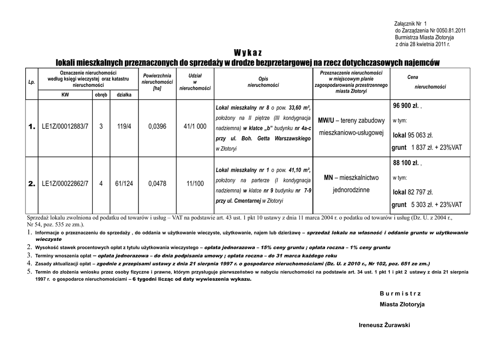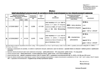 Załącznik Nr 1 do Zarządzenia Nr 0050.81.2011 Burmistrza Miasta Złotoryja z dnia 28 kwietnia 2011 r. Wykaz lokali mieszkalnych przeznaczonych do sprzedaży w drodze bezprzetargowej na rzecz dotychczasowych najemców Lp. Oznaczenie nieruchomości według księgi wieczystej oraz katastru nieruchomości KW obręb Powierzchnia nieruchomości [ha] Udział w nieruchomości Opis nieruchomości działka Przeznaczenie nieruchomości w miejscowym planie zagospodarowania przestrzennego miasta Złotoryi 1. LE1Z/00012883/7 3 119/4 0,0396 41/1 000 nadziemna) w klatce „b” budynku nr 4a-c przy ul. Boh. Getta Warszawskiego MW/U – tereny zabudowy w tym: mieszkaniowo-usługowej lokal 95 063 zł. grunt 1 837 zł. + 23%VAT w Złotoryi 88 100 zł. , Lokal mieszkalny nr 1 o pow. 41,10 m², 2. LE1Z/00022862/7 4 61/124 0,0478 11/100 nieruchomości 96 900 zł. , Lokal mieszkalny nr 8 o pow. 33,60 m², położony na II piętrze (III kondygnacja Cena położony na parterze (I kondygnacja MN – mieszkalnictwo nadziemna) w klatce nr 9 budynku nr 7-9 jednorodzinne w tym: lokal 82 797 zł. przy ul. Cmentarnej w Złotoryi grunt 5 303 zł. + 23%VAT Sprzedaż lokalu zwolniona od podatku od towarów i usług – VAT na podstawie art. 43 ust. 1 pkt 10 ustawy z dnia 11 marca 2004 r. o podatku od towarów i usług (Dz. U. z 2004 r., Nr 54, poz. 535 ze zm.). 1. Informacje o przeznaczeniu do sprzedaży , do oddania w użytkowanie wieczyste, użytkowanie, najem lub dzierżawę – sprzedaż lokalu na własność i oddanie gruntu w użytkowanie wieczyste 2. 3. 4. 5. Wysokość stawek procentowych opłat z tytułu użytkowania wieczystego – opłata jednorazowa – 15% ceny gruntu ; opłata roczna – 1% ceny gruntu Terminy wnoszenia opłat – opłata jednorazowa – do dnia podpisania umowy ; opłata roczna – do 31 marca każdego roku Zasady aktualizacji opłat – zgodnie z przepisami ustawy z dnia 21 sierpnia 1997 r. o gospodarce nieruchomościami (Dz. U. z 2010 r., Nr 102, poz. 651 ze zm.) Termin do złożenia wniosku przez osoby fizyczne i prawne, którym przysługuje pierwszeństwo w nabyciu nieruchomości na podstawie art. 34 ust. 1 pkt 1 i pkt 2 ustawy z dnia 21 sierpnia 1997 r. o gospodarce nieruchomościami – 6 tygodni licząc od daty wywieszenia wykazu. Burmistrz Miasta Złotoryja Ireneusz Żurawski Wykaz lokali mieszkalnych przeznaczonych do sprzedaży w drodze bezprzetargowej na rzecz dotychczasowych najemców Lp. Oznaczenie nieruchomości według księgi wieczystej oraz katastru nieruchomości KW obręb Powierzchnia nieruchomości [ha] Udział w nieruchomości Opis nieruchomości działka Przeznaczenie nieruchomości w miejscowym planie zagospodarowania przestrzennego miasta Złotoryi 8 68/2 0,0949 15/1 000 o pow. 49,50 m², położony na III piętrze MW – mieszkalnictwo (IV kondygnacja nadziemna) w klatce „b” wielorodzinne w tym: lokal 132 728 zł. budynku nr 3ab przy ul. Hożej w Złotoryi grunt 3 106/15 0,0167 56/1 000 972 zł. + 23%VAT 95 900 zł. , Lokal mieszkalny nr 6 o pow. 33,70 m², 4. LE1Z/00025401/9 nieruchomości 133 700 zł. , Lokal mieszkalny nr 31 (z balkonem) 3. LE1Z/00011510/5 Cena położony na I piętrze (II kondygnacja MW/U – tereny zabudowy w tym: nadziemna) w budynku nr 21 przy mieszkaniowo-usługowej lokal 94 957 zł. ul. A. Mickiewicza w Złotoryi grunt 943 zł. + 23%VAT Sprzedaż lokalu zwolniona od podatku od towarów i usług – VAT na podstawie art. 43 ust. 1 pkt 10 ustawy z dnia 11 marca 2004 r. o podatku od towarów i usług (Dz. U. z 2004 r., Nr 54, poz. 535 ze zm.). 1. Informacje o przeznaczeniu do sprzedaży , do oddania w użytkowanie wieczyste, użytkowanie, najem lub dzierżawę – sprzedaż lokalu na własność i oddanie gruntu w użytkowanie wieczyste 2. 3. 4. 5. Wysokość stawek procentowych opłat z tytułu użytkowania wieczystego – opłata jednorazowa – 15% ceny gruntu ; opłata roczna – 1% ceny gruntu Terminy wnoszenia opłat – opłata jednorazowa – do dnia podpisania umowy ; opłata roczna – do 31 marca każdego roku Zasady aktualizacji opłat – zgodnie z przepisami ustawy z dnia 21 sierpnia 1997 r. o gospodarce nieruchomościami (Dz. U. z 2010 r., Nr 102, poz. 651 ze zm.) Termin do złożenia wniosku przez osoby fizyczne i prawne, którym przysługuje pierwszeństwo w nabyciu nieruchomości na podstawie art. 34 ust. 1 pkt 1 i pkt 2 ustawy z dnia 21 sierpnia 1997 r. o gospodarce nieruchomościami – 6 tygodni licząc od daty wywieszenia wykazu. Burmistrz Miasta Złotoryja Ireneusz Żurawski Wykaz lokali mieszkalnych przeznaczonych do sprzedaży w drodze bezprzetargowej na rzecz dotychczasowych najemców Lp. Oznaczenie nieruchomości według księgi wieczystej oraz katastru nieruchomości KW obręb Powierzchnia nieruchomości [ha] Udział w nieruchomości Opis nieruchomości działka Przeznaczenie nieruchomości w miejscowym planie zagospodarowania przestrzennego miasta Złotoryi 3 154/4 0,0305 64/1 000 nieruchomości 138 500 zł. , Lokal mieszkalny nr 10 o pow. 50,10 m², 5. LE1Z/00012376/0 Cena położony na II piętrze (III kondygnacja MW/U – tereny zabudowy w tym: nadziemna) w budynku nr 24 przy mieszkaniowo-usługowej lokal 136 292 zł. ul. Rynek w Złotoryi grunt 2 208 zł. + 23%VAT Sprzedaż lokalu zwolniona od podatku od towarów i usług – VAT na podstawie art. 43 ust. 1 pkt 10 ustawy z dnia 11 marca 2004 r. o podatku od towarów i usług (Dz. U. z 2004 r., Nr 54, poz. 535 ze zm.). 1. Informacje o przeznaczeniu do sprzedaży , do oddania w użytkowanie wieczyste, użytkowanie, najem lub dzierżawę – sprzedaż lokalu na własność i oddanie gruntu w użytkowanie wieczyste 2. 3. 4. 5. Wysokość stawek procentowych opłat z tytułu użytkowania wieczystego – opłata jednorazowa – 15% ceny gruntu ; opłata roczna – 1% ceny gruntu Terminy wnoszenia opłat – opłata jednorazowa – do dnia podpisania umowy ; opłata roczna – do 31 marca każdego roku Zasady aktualizacji opłat – zgodnie z przepisami ustawy 