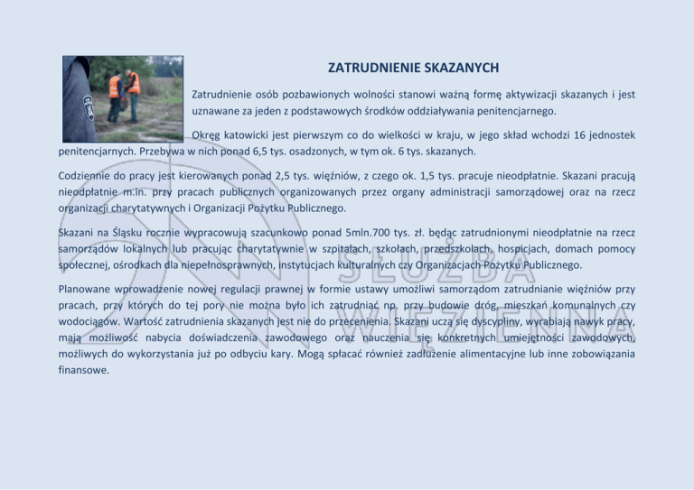 ZATRUDNIENIE SKAZANYCH Zatrudnienie osób pozbawionych wolności stanowi ważną formę aktywizacji skazanych i jest uznawane za jeden z podstawowych środków oddziaływania penitencjarnego. Okręg katowicki jest pierwszym co do wielkości w kraju, w jego skład wchodzi 16 jednostek penitencjarnych. Przebywa w nich ponad 6,5 tys. osadzonych, w tym ok. 6 tys. skazanych. Codziennie do pracy jest kierowanych ponad 2,5 tys. więźniów, z czego ok. 1,5 tys. pracuje nieodpłatnie. Skazani pracują nieodpłatnie m.in. przy pracach publicznych organizowanych przez organy administracji samorządowej oraz na rzecz organizacji charytatywnych i Organizacji Pożytku Publicznego. Skazani na Śląsku rocznie wypracowują szacunkowo ponad 5mln.700 tys. zł. będąc zatrudnionymi nieodpłatnie na rzecz samorządów lokalnych lub pracując charytatywnie w szpitalach, szkołach, przedszkolach, hospicjach, domach pomocy społecznej, ośrodkach dla niepełnosprawnych, instytucjach kulturalnych czy Organizacjach Pożytku Publicznego. Planowane wprowadzenie nowej regulacji prawnej w formie ustawy umożliwi samorządom zatrudnianie więźniów przy pracach, przy których do tej pory nie można było ich zatrudniać np. przy budowie dróg, mieszkań komunalnych czy wodociągów. Wartość zatrudnienia skazanych jest nie do przecenienia. Skazani uczą się dyscypliny, wyrabiają nawyk pracy, mają możliwość nabycia doświadczenia zawodowego oraz nauczenia się konkretnych umiejętności zawodowych, możliwych do wykorzystania już po odbyciu kary. Mogą spłacać również zadłużenie alimentacyjne lub inne zobowiązania finansowe. RZĄDOWY PROGRAM PRACA WIĘŹNIÓW szansa dla więźniów ulgi dla pracodawców Program oparty jest na trzech filarach i dotyczy: budowy min. 40 hal produkcyjnych przy zakładach karnych i aresztach śledczych, rozszerzenia zakresu możliwości nieodpłatnej pracy więźniów na rzecz samorządów oraz wprowadzenia ulg dla przedsiębiorców zatrudniających więźniów. Ulga ta obecnie funkcjonuje jako ryczałt dla przedsiębiorcy i finansowana jest ze środków Funduszu Aktywizacji Zawodowej Skazanych oraz Rozwoju Przywięziennych Zakładów Pracy. Dziś przedsiębiorca zatrudniający osadzonego odpłatnie może uzyskać zwrot w formie ryczałtu w wysokości 20% wynagrodzenia skazanego brutto (zgodnie z projektem zmian w Kodeksie karnym wykonawczym przedsiębiorcom przysługiwać będzie ryczałt wzrośnie do 40%). Przedsiębiorca zatrudniający skazanego odpłatnie ma możliwość uzyskania dofinansowania działań prowadzących do tworzenia nowych miejsc pracy dla skazanych oraz ochronę istniejących ze środków Fundusz Aktywizacji Zawodowej Skazanych oraz Rozwoju Przywięziennych Zakładów Pracy w formie nieoprocentowanej pożyczki, bezzwrotnej dotacji (Rozporządzenie Ministra Sprawiedliwości z dnia 23 stycznia 2012 r. w sprawie Funduszu Aktywizacji Zawodowej Skazanych oraz Rozwoju Przywięziennych Zakładów Pracy (Dz. U. z 2014 r. poz. 53). Skazany przed skierowaniem do pracy przechodzi szczegółową procedurę polegającą na ocenie jego kwalifikacji zawodowych, stanu zdrowia, charakteru przestępstwa i stopnia zagrożenia społecznego. W pierwszej kolejności do pracy kierowani są skazani posiadający zadłużenia alimentacyjne, komornicze i inne zobowiązania finansowe. HALE PRODUKCYJNE W okręgu katowickim pozyskano lokalizację pod budowę 6 hal produkcyjnych, w których mogą być zatrudnieni więźniowie. Mogą one powstać na terenie: ZK Zabrze, pow. 750m2, 35 miejsc pracy ZK Wojkowice, dwie hale o łącznej pow. 1000m2, 50 miejsc pracy ZK Wojkowice, OZ Ciągowice, pow. 430 m2, 22 miejsca pracy ZK Jastrzębie – Zdrój, pow. 1200m2, 60 miejsc pracy AŚ Sosnowiec, pow. 420m2, 22 miejsca pracy Środki na budowę hal pochodzą z potrąceń z wynagrodzeń więźniów zgromadzonych w Funduszu Aktywizacji Zawodowej Skazanych oraz Rozwoju Przywięziennych Zakładów Pracy. Jest to państwowy fundusz celowy, funkcjonujący jako wydzielony rachunek bankowy. Dysponentem tych środków jest Dyrektor Generalny Służby Więziennej. Wniosek o dofinansowanie z FAZS sporządza dyrektor jednostki. Przed złożeniem wniosku kontrahent zawiera z odpowiednim dyrektorem umowę przedwstępną, w której określa m.in. rodzaj produkcji, liczbę skazanych, których zatrudni oraz deklarowany czas trwania umowy. Przedsiębiorca, który uruchomi produkcję na terenie zakładu karnego poza ulgami przysługującymi w związku z zatrudnianiem więźniów, korzysta z darmowej ochrony obiektów produkcyjnych. KORZYŚCI DLA PRZEDSIĘBIORCÓW Dotychczasowa współpraca Służby Więziennej z kontrahentami zatrudniającymi więźniów wskazuje, że niejednokrotnie skazani po opuszczeniu zakładów karnych znajdują zatrudnienie u wcześniejszych pracodawców, którzy cenią sobie sprawdzonego, przeszkolonego pracownika. - Skazany zatrudniany jest na podstawie skierowania do pracy; nie stosuje się przepisów prawa pracy, z wyjątkiem przepisów dotyczących czasu pracy oraz BHP. Umowę o zatrudnieniu skazanych podpisuje pracodawca z dyrektorem jednostki penitencjarnej; - osobie pozbawionej wolności zatrudnionej w pełnym wymiarze godzin przysługuje wynagrodzenie zapewniające osiągnięcie co najmniej minimalnego wynagrodzenia za pracę, przy czym wynagrodzenie naliczane jest proporcjonalnie do faktycznie przepracowanych godzin, bez względu na przyczyny nieobecności w pracy - pracodawca jest zwolniony z obowiązku odprowadzania składki zdrowotnej za zatrudnienie osoby pozbawionej wolności, - zatrudniający ma prawo wnioskowania o zmianę miejsca i rodzaju pracy lub o wycofanie osoby pozbawionej wolności z zatrudnienia bez zachowania formy i terminów przewidzianych w prawie pracy, - osoby pozbawione wolności nie są objęte obowiązkowym ubezpieczeniem chorobowym, nie ma potrzeby wypłacania zasiłku chorobowego za okres przebywania skazanego na zwolnieniu lekarskim - możliwość sz