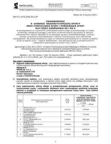 Projekt współfinansowany przez Unię Europejską w ramach Europejskiego Funduszu Społecznego Radom, dn. 4 stycznia 2013 r. BZP.271.2076,2096.2012.AP ZAWIADOMIENIE O WYBORZE NAJKORZYSTNIEJSZEJ OFERTY ORAZ STRESZCZENIE OCENY I PORÓWNANIA OFERT DLA CZĘŚCI ZAMÓWIENIA OD I DO V w p os tę po w a ni u o udzi el e ni e za m ó wi e ni a p ub li c z n eg o pr o w adz o n e g o w t r ybi e pr ze ta r g u ni e o g ra ni c z o ne g o o w a rt oś c i p r ze k rac zaj ąc ej w y ra ż on ą w z ł ot yc h r ów n o wa r to ś ć k w ot y 2 0 0.0 0 0 € n a d os ta w ę s pr zę t u m u lti m edi al n e g o: r zu t ni ki , ek r a ny , p roj e kt o r y m u l ti m edi al n e i t ab li c e i nt e ra kt y w ne o ra z mo ni t o r ów ni e zb ęd n yc h d o p rz ep r ow ad z eni a z aj ęć w s z ko ł ac h gi m na zj a l n yc h w ra m ac h p roj e kt u „K r o k w l eps ze j ut r o – zaj ęc i a do da tk o w e i w y ró w n awc z e d la uc z ni ó w /uc ze n ni c ra d om s ki c h gi mn azj ó w w l at ac h 2 0 1 1- 2 0 1 3” ogłoszonego w dniu 30.11.2012r. na tablicy informacyjnej Urzędu Miejskiego w Radomiu, na stronie internetowej www.bip.radom.pl oraz w Biuletynie Zamówień Publicznych na stronie: http://www.portal.uzp.gov.pl (numer ogłoszenia 483712-2012) Zgodnie z art. 92 ustawy z dnia 29 stycznia 2004r. - Prawo zamówień publicznych (tekst jednolity Dz. U. nr 113 z 2010r., poz. 759 z późn. zm.) zawiadamiamy o: Dla części I zamówienia: 1. Wyborze najkorzystniejszej oferty - jako najkorzystniejszą w oparciu o przyjęte kryterium ceny (100%) wybrano ofertę złożoną przez następującego wykonawcę: oferta nr 5 MAXID Sp. z o. o. ul. Cieślewskich 27D 03-017 Warszawa z ceną: 2 342,00 zł brutto 2. Uzasadnienie wyboru: w/w wykonawca spełnia wszystkie określone przez zamawiającego warunki udziału w postępowaniu, a złożona przez niego oferta nie podlega odrzuceniu i jest najkorzystniejsza w oparciu o przyjęte kryterium ceny (100%). 3. Lista wykonawców, którzy złożyli w przedmiotowym postępowaniu oferty, wraz ze streszczeniem oceny i porównania złożonych ofert zawierającym punktację przyznaną ofertom w przyjętym w niniejszym postępowaniu kryterium oceny ofert – cena (100%) i łączną punktację: Numer oferty Cena brutto w zł Firma (nazwa) lub nazwisko oraz adres wykonawcy Liczba punktów w kryterium – cena (100 %) przy zastosowaniu wzoru (zgodnie z pkt XX.2. SIWZ): C= 1 2 3 4 5 6 Phoenics Sp. z o. o. ul. Staszica 15/1 60-526 Poznań PHPU ZUBER Andrzej Zuber ul. Krakowska 29C 50-424 Wrocław MicroComp Sp. z o. o. ul. M. C. Skłodowskiej 12/2 26-600 Radom Alkop Sp. z o. o. ul. Pamięci Katynia 12a lok. 5 26-600 Radom MAXID Sp. z o. o. ul. Cieślewskich 27D 03-017 Warszawa Forti.pl ul. M. C. Skłodowskiej 18/210 26-600 Radom 1 C min Cb × 100 pkt 3 161,26 74,08 pkt 3 195,54 73,29 pkt 2 640,00 88,71 pkt 2 400,00 97,58 pkt 2 342,00 100,00 pkt 2 720,00 86,10 pkt Dla części II zamówienia: 1. Wyborze najkorzystniejszej oferty - jako najkorzystniejszą w oparciu o przyjęte kryterium ceny (100%) wybrano ofertę złożoną przez następującego wykonawcę: oferta nr 3 AV MULTIMEDIA Małysz, Woźniak Sp. J. ul. Głowackiego 7/7 25-368 Kielce z ceną: 1 348,08 zł brutto 2. Uzasadnienie wyboru: w/w wykonawca spełnia wszystkie określone przez zamawiającego warunki udziału w postępowaniu, a złożona przez niego oferta nie podlega odrzuceniu i jest najkorzystniejsza w oparciu o przyjęte kryterium ceny (100%). 3. Lista wykonawców, którzy złożyli w przedmiotowym postępowaniu oferty, wraz ze streszczeniem oceny i porównania złożonych ofert zawierającym punktację przyznaną ofertom w przyjętym w niniejszym postępowaniu kryterium oceny ofert – cena (100%) i łączną punktację: Numer oferty Cena brutto w zł Firma (nazwa) lub nazwisko oraz adres wykonawcy Liczba punktów w kryterium – cena (100 %) przy zastosowaniu wzoru (zgodnie z pkt XX.2. SIWZ): C= 1 2 3 4 5 6 7 EMATECH TRADE Sp. z o. o. ul. Obrzeżna Północna 17 41-400 Mysłowice Phoenics Sp. z o. o. ul. Staszica 15/1 60-526 Poznań AV MULTIMEDIA Małysz, Woźniak Sp. J. ul. Głowackiego 7/7 25-368 Kielce MicroComp Sp. z o. o. ul. M. C. Skłodowskiej 12/2 26-600 Radom Alkop Sp. z o. o. ul. Pamięci Katynia 12a lok. 5 26-600 Radom MAXID Sp. z o. o. ul. Cieślewskich 27D 03-017 Warszawa Forti.pl ul. M. C. Skłodowskiej 18/210 26-600 Radom C min Cb × 100 pkt 1 805,64 74,66 pkt 2 538,72 53,10 pkt 1 348,08 100,00 pkt 2 600,00 51,85 pkt 1 460,00 92,33 pkt 1 370,40 98,37 pkt 1 880,00 71,71 pkt Dla części III zamówienia: 1. Wyborze najkorzystniejszej oferty - jako najkorzystniejszą w oparciu o przyjęte kryterium ceny (100%) wybrano ofertę złożoną przez następującego wykonawcę: oferta nr 4 MicroComp Sp. z o. o. ul. M. C. Skłodowskiej 12/2 26-600 Radom z ceną: 14 160,00 zł brutto 2. Uzasadnienie wyboru: w/w wykonawca spełnia wszystkie określone przez zamawiającego warunki udziału w postępowaniu, a złożona przez niego oferta nie podlega odrzuceniu i jest najkorzystniejsza w oparciu o przyjęte kryterium ceny (100%). 3. Lista wykonawców, którzy złożyli w przedmiotowym postępowaniu oferty, wraz ze streszczeniem oceny i porównania złożonych ofert zawierającym punktację przyznaną ofertom w przyjętym w niniejszym postępowaniu kryterium oceny ofert – cena (100%) i łączną punktację: 2 Numer oferty Cena brutto w zł Firma (nazwa) lub nazwisko oraz adres wykonawcy Liczba punktów w kryterium – cena (100 %) przy zastosowaniu wzoru (zgodnie z pkt XX.2. SIWZ): C= 1 2 3 4 5 6 7 8 EMATECH TRADE Sp. z o. o. ul. Obrzeżna Północna 17 41-400 Mysłowice Phoenics Sp. z o. o. ul. Staszica 15/1 60-526 Poznań PHPU ZUBER Andrzej Zuber ul. Krakowska 29C 50-424 Wrocław MicroComp Sp. z o. o. ul. M. C. Skłodowskiej 12/2 26-600 Radom Alkop Sp. z o. o. ul. Pamięci Katynia 12a lok. 5 26-600 Radom „LUK-NET” Łukasz Drab Kuczki-Kolonia 24 26-634 Gózd MAXID Sp. z o. o. ul. Cieślew