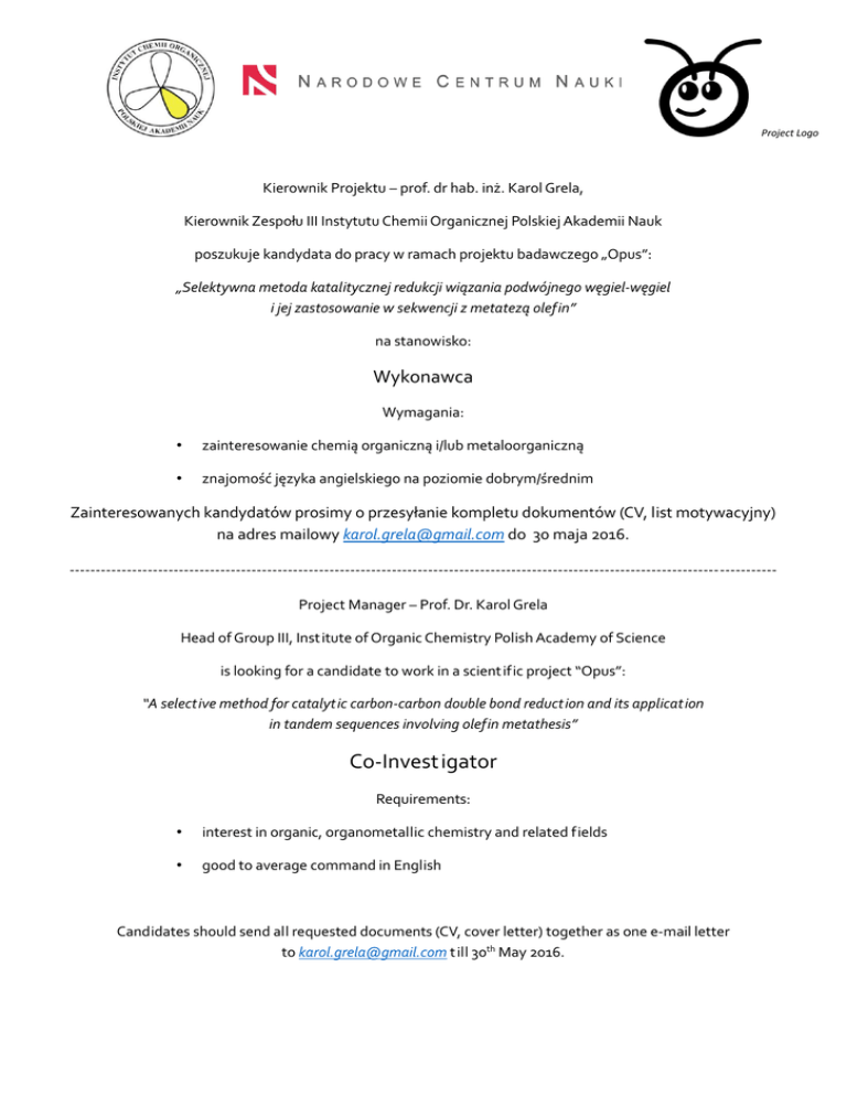 Project Logo Kierownik Projektu – prof. dr hab. inż. Karol Grela, Kierownik Zespołu III Instytutu Chemii Organicznej Polskiej Akademii Nauk poszukuje kandydata do pracy w ramach projektu badawczego „Opus”: „Selektywna metoda katalitycznej redukcji wiązania podwójnego węgiel-węgiel i jej zastosowanie w sekwencji z metatezą olefin” na stanowisko: Wykonawca Wymagania: • zainteresowanie chemią organiczną i/lub metaloorganiczną • znajomość języka angielskiego na poziomie dobrym/średnim Zainteresowanych kandydatów prosimy o przesyłanie kompletu dokumentów (CV, list motywacyjny) na adres mailowy [email protected] do 30 maja 2016. ---------------------------------------------------------------------------------------------------------------------------------------Project Manager – Prof. Dr. Karol Grela Head of Group III, Institute of Organic Chemistry Polish Academy of Science is looking for a candidate to work in a scientific project “Opus”: “A selective method for catalytic carbon-carbon double bond reduction and its application in tandem sequences involving olefin metathesis” Co-Investigator Requirements: • interest in organic, organometallic chemistry and related fields • good to average command in English Candidates should send all requested documents (CV, cover letter) together as one e-mail letter to [email protected] till 30th May 2016.