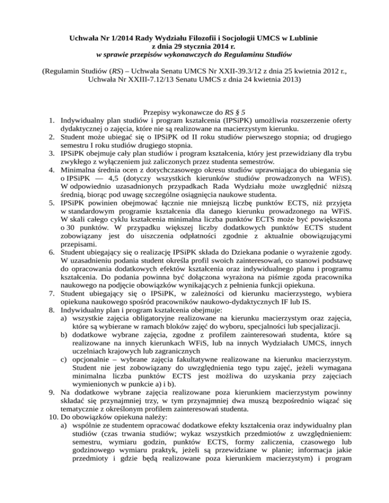 Uchwała Nr 1/2014 Rady Wydziału Filozofii i Socjologii UMCS w Lublinie z dnia 29 stycznia 2014 r. w sprawie przepisów wykonawczych do Regulaminu Studiów (Regulamin Studiów (RS) – Uchwała Senatu UMCS Nr XXII-39.3/12 z dnia 25 kwietnia 2012 r., Uchwała Nr XXIII-7.12/13 Senatu UMCS z dnia 24 kwietnia 2013) Przepisy wykonawcze do RS § 5 1. Indywidualny plan studiów i program kształcenia (IPSiPK) umożliwia rozszerzenie oferty dydaktycznej o zajęcia, które nie są realizowane na macierzystym kierunku. 2. Student może ubiegać się o IPSiPK od II roku studiów pierwszego stopnia; od drugiego semestru I roku studiów drugiego stopnia. 3. IPSiPK obejmuje cały plan studiów i program kształcenia, który jest przewidziany dla trybu zwykłego z wyłączeniem już zaliczonych przez studenta semestrów. 4. Minimalna średnia ocen z dotychczasowego okresu studiów uprawniająca do ubiegania się o IPSiPK — 4,5 (dotyczy wszystkich kierunków studiów prowadzonych na WFiS). W odpowiednio uzasadnionych przypadkach Rada Wydziału może uwzględnić niższą średnią, biorąc pod uwagę szczególne osiągnięcia naukowe studenta. 5. IPSiPK powinien obejmować łącznie nie mniejszą liczbę punktów ECTS, niż przyjęta w standardowym programie kształcenia dla danego kierunku prowadzonego na WFiS. W skali całego cyklu kształcenia minimalna liczba punktów ECTS może być powiększona o 30 punktów. W przypadku większej liczby dodatkowych punktów ECTS student zobowiązany jest do uiszczenia odpłatności zgodnie z aktualnie obowiązującymi przepisami. 6. Student ubiegający się o realizację IPSiPK składa do Dziekana podanie o wyrażenie zgody. W uzasadnieniu podania student określa profil swoich zainteresowań, co stanowi podstawę do opracowania dodatkowych efektów kształcenia oraz indywidualnego planu i programu kształcenia. Do podania powinna być dołączona wyrażona na piśmie zgoda pracownika naukowego na podjęcie obowiązków wynikających z pełnienia funkcji opiekuna. 7. Student ubiegający się o IPSiPK, w zależności od kierunku macierzystego, wybiera opiekuna naukowego spośród pracowników naukowo-dydaktycznych IF lub IS. 8. Indywidualny plan i program kształcenia obejmuje: a) wszystkie zajęcia obligatoryjne realizowane na kierunku macierzystym oraz zajęcia, które są wybierane w ramach bloków zajęć do wyboru, specjalności lub specjalizacji. b) dodatkowe wybrane zajęcia, zgodne z profilem zainteresowań studenta, które są realizowane na innych kierunkach WFiS, lub na innych Wydziałach UMCS, innych uczelniach krajowych lub zagranicznych c) opcjonalnie – wybrane zajęcia fakultatywne realizowane na kierunku macierzystym. Student nie jest zobowiązany do uwzględnienia tego typu zajęć, jeżeli wymagana minimalna liczba punktów ECTS jest możliwa do uzyskania przy zajęciach wymienionych w punkcie a) i b). 9. Na dodatkowe wybrane zajęcia realizowane poza kierunkiem macierzystym powinny składać się przynajmniej trzy, w tym przynajmniej dwa muszą bezpośrednio wiązać się tematycznie z określonym profilem zainteresowań studenta. 10. Do obowiązków opiekuna należy: a) wspólnie ze studentem opracować dodatkowe efekty kształcenia oraz indywidualny plan studiów (czas trwania studiów; wykaz wszystkich przedmiotów z uwzględnieniem: semestru, wymiaru godzin, punktów ECTS, formy zaliczenia, czasowego lub godzinowego wymiaru praktyk, jeżeli są przewidziane w planie; informacja jakie przedmioty i gdzie będą realizowane poza kierunkiem macierzystym) i program kształcenia (opis określonych dla danego kierunku studiów spójnych efektów kształcenia przy uwzględnieniu dodatkowych efektów kształcenia wynikających z rozszerzonego programu kształcenia) oraz opis procesu kształcenia, prowadzącego do osiągnięcia tych efektów, wraz z przypisanymi do poszczególnych modułów (przedmiotów) tego procesu punktami ECTS. b) przekazać do właściwego dziekanatu niezbędne informacje i dokumenty potrzebne do obsługi administracyjnej studenta. c) nadzorować realizację IPSiPK. 11. W celu opracowania IPSiPK student występuje z podaniem o zgodę na uczęszczanie na dodatkowe wybrane zajęcia oraz ich zaliczenie do Dziekana, na którego Wydziale zajęcia te są w ofercie dydaktycznej. Podanie powinno być zaopiniowane przez Dziekana kierunku macierzystego. 12. Opracowany IPSiPK powinien być zaopiniowany przez Wydziałowy Zespół ds. Jakości Kształcenia. 13. Student, za pośrednictwem Dziekana, występuje z wnioskiem do Rady Wydziału Filozofii i Socjologii o powołanie opiekuna naukowego oraz z wnioskiem o zatwierdzenie indywidualnego planu studiów i programu kształcenia wraz z harmonogramem jego realizacji. 14. Wnioski powinny być zaakceptowane przez Radę Wydziału Filozofii i Socjologii nie później niż na Radzie odbywającej się w listopadzie dla semestru zimowego i w marcu dla semestru letniego. 15. Student realizujący IPSiPK może ubiegać się o Indywidualną Organizację Studiów (IOS). 16. Zgoda Rady Wydziału Filozofii i Socjologii na IPSiPN nie zwalnia studenta od zaliczania przedmiotów i zdawania egzaminów w terminach określonych przez Regulamin Studiów /§ 26/ oraz ustaloną przez Rektora Organizację roku akademickiego. Student, składając wniosek do Rady Wydziału o zatwierdzenie IPSiPK, może ubiegać się o przyznanie rocznego systemu zaliczania indywidualnego programu kształcenia. 1. 2. 3. 4. 5. 6. 8. Przepisy wykonawcze do RS § 6 Student może ubiegać się o Indywidualną Organizację Studiów (IOS) na każdym roku studiów, na okres jednego lub dwóch semestrów w obrębie danego roku akademickiego. Student ma prawo wielokrotnie korzystać z IOS. Student przedstawia podanie do Dziekana o IOS. Na podaniu powinna być informacja o średniej ocen z dotychczasowego okresu studiów (nie dotyczy studentów składających podanie ze względu na wypadki losowe), potwierdzona przez pracownika dziekanatu. Do