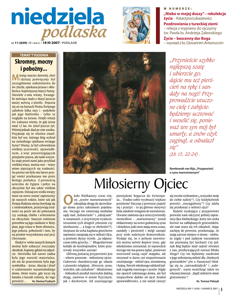 niedziela nr podlaska 11 (639) • K • rok L • 18 III 2007 • Podlasie w numerze: „Niebo w mojej duszy” – rekolekcje życia – Katarzyna Łukaszewicz Pozdrowienia z tureckiej ziemi – relacja z wyprawy do ojczyzny św. Pawła ks. Andrzeja Zalewskiego Życie – bezcenny dar Boga – wywiad z ks. Giovannim Antonuccim Temat tygodnia „Przynieście szybko najlepszą szatę i ubierzcie go; dajcie mu też pierścień na rękę i sandały na nogi! Przyprowadźcie utuczone cielę i zabijcie: będziemy ucztować i weselić się, ponieważ ten syn mój był umarły, a znów ożył; zaginął, a odnalazł się” Skromny, mocny i pobożny... M iesiąc marzec dawniej, choć i dzisiaj poświęcony był szczególnemu nabożeństwu do św. Józefa, opiekuna Jezusa i oblubieńca Najświętszej Maryi Panny. Niewiele o nim wiemy. Ewangelie mówiące mało o Maryi jeszcze mniej mówią o Józefie. Pojawia się on na kartach Pisma Świętego zaledwie kilka razy i – podobnie jak jego Małżonka – tylko ze względu na Jezusa. Dzięki relacji św. Łukasza wiemy, że gdy Jezus miał 12 lat, św. Józef jeszcze żył. Później jednak ślad po nim zanika. Przyjmuje się że wkrótce zmarł. Kim był ten, którego Bóg wybrał na ziemskiego opiekuna swojego Syna? Wiemy, że był człowiekiem wielkiej uczciwości, sprawiedliwym, a więc przestrzegającym przepisów prawa, ale nade wszystko staje przed nami jako przykład wielkiej wiary, można rzec – wiary mimo piętrzących się trudności. Na pewno nie było mu łatwo przyjąć wieści przekazane mu przez Bożego posłańca. Z pewnością ucieczka do Egiptu i pobyt na obczyźnie był mu także wielkim ciężarem. Dzisiaj ten wielki święty musi na nowo zostać zaproszony do naszych rodzin, które tak jak Święta Rodzina nieraz borykają się z niedostatkiem, przeżywają trudności na pozór nie do pokonania czy szukają chleba i schronienia na obczyźnie. Naszym rodzinom potrzebne są jego zaufanie w Boży plan, jego wiara w Boże obietnice, jego pokora, pobożność i moc, by na przekór wszystkiemu stać przy Chrystusie. Kiedyś w wielu naszych domach można było zobaczyć zwyczajny oleodruk, kupiony gdzieś na odpuście. Niewielka lub nawet żadna była jego wartość materialna, ale nie do przecenienia była jego symbolika – Jezus, Maryja i Józef w codzienności nazaretańskiego domu. Może warto, gdy toczy się batalia o kształt rodziny, do tego Ks. Dariusz Frydrych powrócić… (Łk 15, 22-24) . Rembrandt van Rijn, „Przypowieść o synu marnotrawnym” O Miłosierny Ojciec koło Wielkanocy coraz więcej „synów marnotrawnych” odnajduje drogę do ojcowskiego domu przez sakrament pojednania. Niczego nie zmieniają medialne sądy nad „bohaterami” i „zdrajcami” w sutannach, z oczywistym wyakcentowaniem tych drugich (słusznie czy niesłusznie..., a kogo to obchodzi?!). Szeptane do ucha kapłana grzechowe tajemnice zatapiają się w miłości Ojca, a penitent słyszy wyrok: „Ja odpuszczam tobie grzechy...”. Błogosławione kolejki do konfesjonałów, które przetrwały wszystkie ustroje! Główną postacią przypowieści jest – wbrew pozorom – miłosierny ojciec. Cudownie charakteryzuje go zdanie z piosenki religijnej: „Wreszcie, synu; wróciłeś, tak czekałem!”. Młodzieniec – lekkoduch przebył niezwykle daleką drogę, zarówno w sensie fizycznym, jak i duchowym. Od szastającego pieniędzmi bogacza do świniopasa... Trudno sobie wyobrazić większe poniżenie! Decyzja o powrocie (najeść się i przeżyć – to jej główne motywy) była zaledwie wstępem do nawrócenia. Otwarte ramiona ojca urzeczywistniły niemożliwe – „marnotrawny” został obdarowany na nowo godnością syna i dziedzica (taki sens mają nowa szata, sandały i pierścień) i mógł zasiąść przy stole należnym domownikom. Wydaje się, że o pełnym nawróceniu można mówić dopiero teraz, gdy młodzieniec zrozumiał, że wprawdzie niczego nie ma prawa żądać, ponieważ roztrwonił swoją część majątku, ale otrzymał w darze coś nieporównanie cenniejszego – miłość ojca, niezmienną i hojną. Powrót młodszego odsłonił jednak tragedię starszego z synów. Nigdy nie opuścił rodzinnego domu, ale był rozpaczliwie daleko od ojca! Szukał sprawiedliwości, a nie umiał cieszyć się swoim wybraniem („wszystko moje do ciebie należy”). Czy kiedykolwiek powróci „niezagubiony”? Czy zdoła się przekonać o miłości ojca? Radość tryskająca z przypowieści pozwala nam odczytać pełniej tajemnicę Ojca Niebieskiego, który nie czeka biernie na zabłąkanych grzeszników, ale sam stara się ich odnaleźć, dając zachętę do powrotu, przekonując, że mają zawsze miejsce w domu – niebie, że nigdy i pod żadnym warunkiem nie przestaną być kochani! Czy jednak Bóg będzie miał radość również z nas, przebywających zawsze blisko Niego? Czy nie będziemy zazdrośni o jego miłosierną miłość dla „biednych grzeszników” (św. s. Faustyna)? Modląc się za „zatwardziałych” i „nałogowych”, warto westchnąć także we własnej intencji: „Bądź miłościw mnie grzesznemu”! Ks. Tomasz Pełszyk NIEDZIELA NR 11 (639) • 18 marcA 2007 I niedziela podlaska Jak zaradzić problemom młodzieżowym? Jednym Zdaniem Drohiczyn Hajnówka Ojciec Święty Jan Paweł II, by zwrócić uwagę na osoby chore i cierpiące ogłosił 11 lutego Światowym Dniem Chorego – jest to dzień liturgicznego wspomnienia Matki Bożej z Lourdes. Choroba jest przykrym stanem, zniewala i podporządkowuje sobie, odbiera siły, sprawia, iż stajemy się bezbronni. Jesteśmy wtedy zdani na drugiego człowieka, na jego obecność, gest pomocy, ten jednorazowy, ale i ten wielokrotny. 11 lutego panie działające w Caritas przy parafii pw. Podwyższenia Krzyża Świętego w Hajnówce wraz z ks. Jarosławem Kuźmickim, kapelanem miejscowego szpitala, odwiedziły oddział pielęgnacyjno-opiekuńczy. Miałyśmy tro