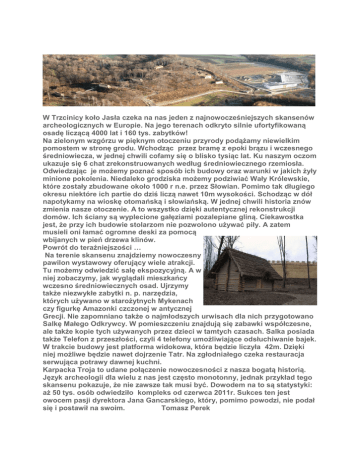 W Trzcinicy koło Jasła czeka na nas jeden z najnowocześniejszych skansenów archeologicznych w Europie. Na jego terenach odkryto silnie ufortyfikowaną osadę liczącą 4000 lat i 160 tys. zabytków! Na zielonym wzgórzu w pięknym otoczeniu przyrody podążamy niewielkim pomostem w stronę grodu. Wchodząc przez bramę z epoki brązu i wczesnego średniowiecza, w jednej chwili cofamy się o blisko tysiąc lat. Ku naszym oczom ukazuje się 6 chat zrekonstruowanych według średniowiecznego rzemiosła. Odwiedzając je możemy poznać sposób ich budowy oraz warunki w jakich żyły minione pokolenia. Niedaleko grodziska możemy podziwiać Wały Królewskie, które zostały zbudowane około 1000 r n.e. przez Słowian. Pomimo tak długiego okresu niektóre ich partie do dziś liczą nawet 10m wysokości. Schodząc w dół napotykamy na wioskę otomańską i słowiańską. W jednej chwili historia znów zmienia nasze otoczenie. A to wszystko dzięki autentycznej rekonstrukcji domów. Ich ściany są wyplecione gałęziami pozalepiane gliną. Ciekawostka jest, że przy ich budowie stolarzom nie pozwolono używać piły. A zatem musieli oni łamać ogromne deski za pomocą wbijanych w pień drzewa klinów. Powrót do teraźniejszości … Na terenie skansenu znajdziemy nowoczesny pawilon wystawowy oferujący wiele atrakcji. Tu możemy odwiedzić salę ekspozycyjną. A w niej zobaczymy, jak wyglądali mieszkańcy wczesno średniowiecznych osad. Ujrzymy także niezwykłe zabytki n. p. narzędzia, których używano w starożytnych Mykenach czy figurkę Amazonki czczonej w antycznej Grecji. Nie zapomniano także o najmłodszych urwisach dla nich przygotowano Salkę Małego Odkrywcy. W pomieszczeniu znajdują się zabawki współczesne, ale także kopie tych używanych przez dzieci w tamtych czasach. Salka posiada także Telefon z przeszłości, czyli 4 telefony umożliwiające odsłuchiwanie bajek. W trakcie budowy jest platforma widokowa, która będzie liczyła 42m. Dzięki niej możliwe będzie nawet dojrzenie Tatr. Na zgłodniałego czeka restauracja serwująca potrawy dawnej kuchni. Karpacka Troja to udane połączenie nowoczesności z nasza bogatą historią. Język archeologii dla wielu z nas jest często monotonny, jednak przykład tego skansenu pokazuje, że nie zawsze tak musi być. Dowodem na to są statystyki: aż 50 tys. osób odwiedziło kompleks od czerwca 2011r. Sukces ten jest owocem pasji dyrektora Jana Gancarskiego, który, pomimo powodzi, nie podał się i postawił na swoim. Tomasz Perek