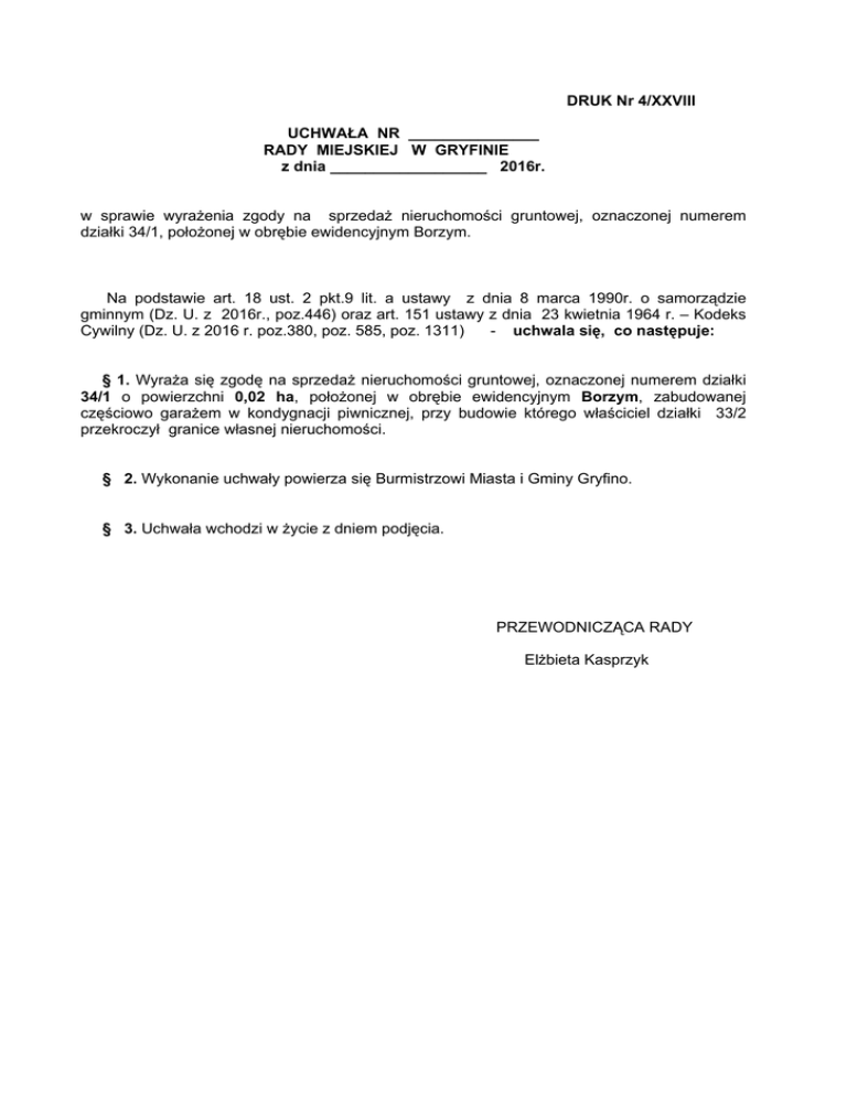 DRUK Nr 4/XXVIII UCHWAŁA NR _______________ RADY MIEJSKIEJ W GRYFINIE z dnia __________________ 2016r. w sprawie wyrażenia zgody na sprzedaż nieruchomości gruntowej, oznaczonej numerem działki 34/1, położonej w obrębie ewidencyjnym Borzym. Na podstawie art. 18 ust. 2 pkt.9 lit. a ustawy z dnia 8 marca 1990r. o samorządzie gminnym (Dz. U. z 2016r., poz.446) oraz art. 151 ustawy z dnia 23 kwietnia 1964 r. – Kodeks Cywilny (Dz. U. z 2016 r. poz.380, poz. 585, poz. 1311) - uchwala się, co następuje: § 1. Wyraża się zgodę na sprzedaż nieruchomości gruntowej, oznaczonej numerem działki 34/1 o powierzchni 0,02 ha, położonej w obrębie ewidencyjnym Borzym, zabudowanej częściowo garażem w kondygnacji piwnicznej, przy budowie którego właściciel działki 33/2 przekroczył granice własnej nieruchomości. § 2. Wykonanie uchwały powierza się Burmistrzowi Miasta i Gminy Gryfino. § 3. Uchwała wchodzi w życie z dniem podjęcia. PRZEWODNICZĄCA RADY Elżbieta Kasprzyk Uzasadnienie Gmina Gryfino jest właścicielem nieruchomości gruntowej, oznaczonej numerem działki 34/1 o powierzchni 0,02 ha, położonej w obrębie ewidencyjnym Borzym. Działka bezpośrednio przylega do nieruchomości nr 33/2 o powierzchni 0,06 ha , stanowiącej własność osoby fizycznej, zabudowanej budynkiem mieszkalnym. Dla terenu ww działek brak jest obowiązującego planu miejscowego. Na wniosek właściciela działki nr 33/2, wydana została dnia 5 maja 2016 r. decyzja nr 39/2016 o warunkach zabudowy dla inwestycji na działkach nr 33/2 i 34/1, położonych w obrębie ewidencyjnym Borzym, polegającej na rozbudowie z nadbudową i przebudowie budynku mieszkalnego. Właściciel działki nr 33/2 wystąpił z wnioskiem o nabycie od Gminy Gryfino nieruchomości gruntowej nr 34/1. Z załącznika graficznego do ww decyzji w postaci mapy wynika, że wnioskowana do nabycia działka nr 34/1 zabudowana jest częścią garażu w kondygnacji piwnicznej, podczas budowy którego wnioskodawca przekroczył granice swojej działki nr 33/2. Działka gminna nr 34/1 ze względu na powierzchnię oraz kształt, w świetle przepisów ustawy o gospodarce nieruchomościami nie stanowi działki budowlanej. W związku z powyższym istnieje możliwość uregulowania stanu prawnego przedmiotowej nieruchomości zgodnie ze stanem faktycznym zaistniałym na gruncie. W tym przypadku zasadne jest zastosowanie przepisu art. 151 Kodeksu Cywilnego, który stanowi : „ Jeżeli przy wznoszeniu budynku lub innego urządzenia przekroczono bez winy umyślnej granice sąsiedniego gruntu, właściciel tego gruntu nie może żądać przywrócenia stanu poprzedniego, chyba że bez nieuzasadnionej zwłoki sprzeciwił się przekroczeniu granicy albo że grozi mu niewspółmiernie wielka szkoda. Może on żądać albo stosownego wynagrodzenia w zamian za ustanowienie odpowiedniej służebności gruntowej, albo wykupienia zajętej części gruntu, jak również tej części, która na skutek budowy straciła dla niego znaczenie gospodarcze”. Zgoda Rady Miejskiej umożliwi przeniesienie własności działki nr 34/1 na rzecz właściciela działki nr 33/2, a uzyskane ze sprzedaży środki finansowe zwiększą dochody Gminy . Sporządziła: Helena Pasztaleniec