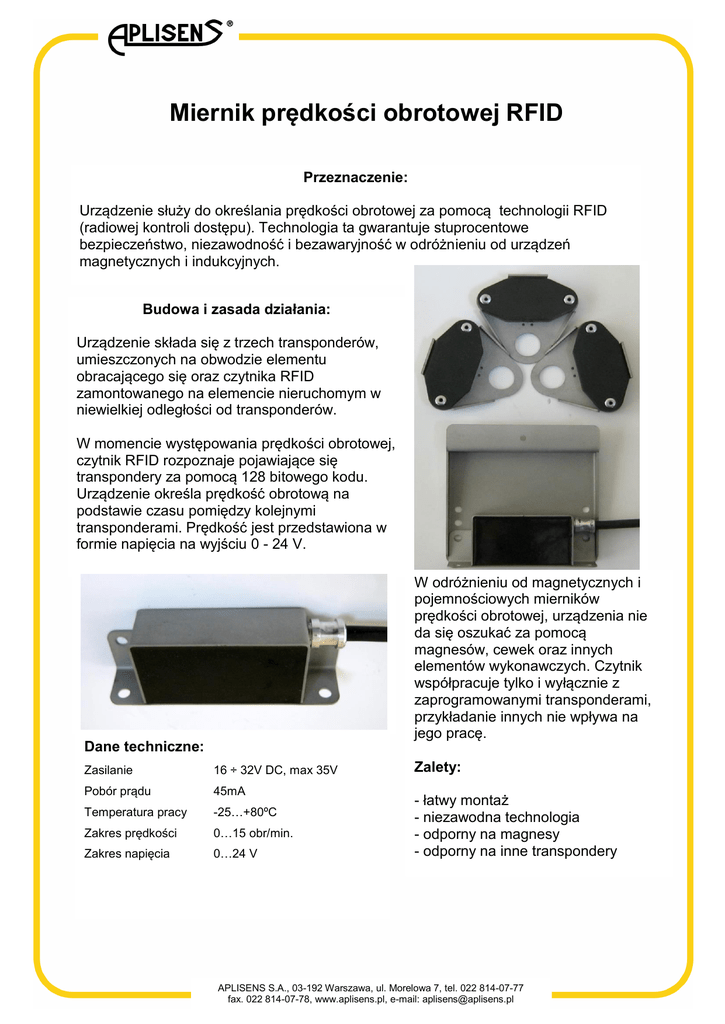 Miernik prędkości obrotowej RFID Przeznaczenie: Urządzenie służy do określania prędkości obrotowej za pomocą technologii RFID (radiowej kontroli dostępu). Technologia ta gwarantuje stuprocentowe bezpieczeństwo, niezawodność i bezawaryjność w odróżnieniu od urządzeń magnetycznych i indukcyjnych. Budowa i zasada działania: Urządzenie składa się z trzech transponderów, umieszczonych na obwodzie elementu obracającego się oraz czytnika RFID zamontowanego na elemencie nieruchomym w niewielkiej odległości od transponderów. W momencie występowania prędkości obrotowej, czytnik RFID rozpoznaje pojawiające się transpondery za pomocą 128 bitowego kodu. Urządzenie określa prędkość obrotową na podstawie czasu pomiędzy kolejnymi transponderami. Prędkość jest przedstawiona w formie napięcia na wyjściu 0 - 24 V. W odróżnieniu od magnetycznych i pojemnościowych mierników prędkości obrotowej, urządzenia nie da się oszukać za pomocą magnesów, cewek oraz innych elementów wykonawczych. Czytnik współpracuje tylko i wyłącznie z zaprogramowanymi transponderami, przykładanie innych nie wpływa na jego pracę. Dane techniczne: Zasilanie 16 ÷ 32V DC, max 35V Zalety: Pobór prądu 45mA Temperatura pracy -25…+80ºC Zakres prędkości 0…15 obr/min. Zakres napięcia 0…24 V - łatwy montaż - niezawodna technologia - odporny na magnesy - odporny na inne transpondery APLISENS S.A., 03-192 Warszawa, ul. Morelowa 7, tel. 022 814-07-77 fax. 022 814-07-78, www.aplisens.pl, e-mail: [email protected]