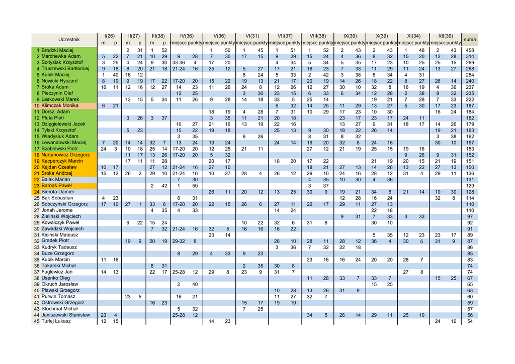 Uczestnik 1 2 3 4 5 6 7 8 9 10 11 12 13 14 15 16 17 18 19 20 21 22 23 24 25 26 27 28 29 30 31 32 33 34 35 36 37 38 39 40 41 42 43 44 45 Brodzki Maciej Marchewka Adam Sołtysiak Krzysztof Truszewski Bartłomiej Kubik Maciej Nowicki Ryszard Sroka Adam Pieczynin Olaf Laskowski Marek Klimczak Monika Dorsz Adam Pluta Piotr Dzięgielewski Jacek Tylski Krzysztof Władysiuk Adam Lewandowski Maciej Szablewski Piotr Nartanowicz Grzegorz Kacperczyk Marcin Kajdan Czesław Sroka Andrzej Balak Marian Barnaś Paweł Sierota Damiel Bąk Sebastian Sobczyński Grzegorz Jonah Jerome Zieliński Wojciech Kowalczyk Paweł Zawadzki Wojciech Kiciński Mateusz Gradek Piotr Kudryk Tadeusz Buze Grzegorz Kubik Marcin Tokarski Michał Fuglewicz Jan Usenko Oleg Okruch Jarosław Pławski Grzegorz Purwin Tomasz Ostrowski Grzegorz Stochmal Michał Janiszewski Stanisław Turlej Łukasz I(26) m p II(27) m p III(38) IV(36) V(36) VI(31) VII(37) VIII(38) IX(39) X(39) XI(34) XII(39) suma m p miejsce punkty miejsce punkty miejsce punkty miejsce punkty miejsce punktymiejscepunktymiejscepunktymiejscepunktymiejscepunkty 5 3 9 1 8 16 22 25 18 40 19 11 2 7 4 8 16 9 12 31 21 24 20 12 19 16 1 10 9 21 52 29 30 18 17 12 22 27 13 15 5 34 6 21 3 7 24 10 15 4 17 20 3 17 12 23 10 5 23 14 10 11 17 14 18 17 11 26 2 14 3 17-20 14 12 11 20 23 25 26 37 32 25 13 11 27 29 7 14 26 28 12 10 2 10 15 3 13 17-20 17-20 27 22 35 24 20 20 42 21-24 21-24 7 1 16 16 30 50 6 17-20 4 31 20 33 1 33 4 6 35 6 22 15 7 24 32 21-24 16 20 19 29-32 8 8 29 9 1 7 17 25 50 30 20 12 15 11 22 26 9 28 18 3 21 19 19 35 16 18 13 12 5 20 27 10 24 25 32 17 10 27 26 22 32 23 4 1 17 45 15 5 8 19 24 3 14 27 24 13 8 30 18 4 11 13 28 21 19 6 26 21 11 1 9 4 17 5 21 12 23 33 6 7 20 22 25 51 29 34 21 33 17 26 15 5 32 31 18 16 13 24 14 18 20 8 22 13 5 16 4 15 31 17 25-28 12 2 40 16 21 5 25-28 32 12 29 52 24 34 23 42 19 27 33 14 25 29 9 8 19 27 30 31 20 12 17 18 29 4 3 30 22 21 10 35 37 9 21 14 28 4 19 26 12 36 34 16 27 22 7 30 6 24 13 18 33 10 21 14 3 33 5 36 35 4 12 30 23 5 28 7 27 8 24 20 20 11 28 33 7 33 15 7 25 13 32 26 7 31 9 34 5 26 14 29 11 11 24 22 17 10 16 22 16 32 16 6 22 31 8 28 3 10 36 28 7 30 31 8 7 23 16 26 15 22 4 16 27 14 17 25 19 9 20 13 31 16 6 15 7 16 15 23 26 28 27 19 24 25 12 18 15 10 11 19 11 17 28 22 25 8 24 18 11 32 13 35 9 48 20 25 24 31 27 19 38 28 30 31 12 2 23 1 15 10 11 4 8 16 2 7 5 9 20 23 29 23 17 27 22 32 8 19 43 32 23 29 34 22 8 28 21 27 30 17 31 14 21 28 11 11 9 11 17 23 13 18 8 32 21 2 8 17 11 6 18 32 12 19 13 10 23 9 26 19 12 29 12 33 43 36 35 33 38 26 10 34 13 16 30 26 5 14 2 4 5 7 3 14 30 6 27 24 10 4 23 14 1 15 5 16 2 20 12 6 25 14 10 28 16 23 23 12 28 4 16 27 19 11 26 9 33-36 21-24 25 2 12 25 13 43 28 15 27 26 4 8 7 17 16 14 36 32 33 23 24 14 19 3 30 26 21 38 10 9 21 27 29 31 19 13 11 10 32 30 8 23 31 17 9 15 25 24 16 10 458 314 269 268 254 240 237 235 222 187 184 182 179 163 162 157 153 152 151 150 136 131 129 128 114 110 110 97 92 91 89 87 86 85 83 74 74 67 65 63 60 59 57 56 54 46 47 48 49 50 51 52 53 54 55 56 57 58 59 60 61 62 63 64 65 66 67 68 69 70 71 72 73 74 75 76 77 78 79 80 81 82 83 84 85 86 87 88 89 90 91 92 93 Świerczek Damian Borkowicz Krzysztof Kozieł Paweł Ziemiański Wiktor Baran Robert Tkaczyk Ewelina Kaczanowski Stanisław Borkowska Sylwia Beziuk Elżbieta Lebrecht Bartosz Fernandez Juan Sieczak Grzegorz Wiśniewski Tomasz Łączyński Marcin Mazek Mateusz Czuryłowicz Krzysztof Szczepański Mateusz Kisiel Jacek Wiszniewski Paweł Werecki Mikołaj Wolff Paweł Sudoł Piotr Jabłoński Zenon Postek Arkadiusz Pietrzykowski Maciej Naperty Łukasz Klonowski Grzegorz Melich Krzysztof Soszyński Artur Soszyński Filip Szczepański_Marcin Gryziak Tomasz Zakrzewski Marek Tuszyński Piotr Bitner Piotr Kupisiński Krzysztof Czernecki Robert Kiciński_Mikołaj Stankiewicz Kamil Rudnik Małgorzata Suchański Kacper Składanek Paweł Gorczyca Bogusław Mirgos Daniel Kurowski Patryk Przesmycka Magdalena Adamus Tomasz Szczucki Krzysztof 6 33 12 20 1 53 20 20 1 18 1 10 19 26 20 13 25-28 35 2 8 29 12 24 15 29-32 8 23 16 25-28 12 24 25 7 27 18 5 14 21 37 13 13 25 9 14 2 22 6 20 8 15 13 28 11 29-32 8 2 40 28 9 36 18 2 38 3 7 31 8 14 30 25 9 29-32 36 4 15 25 3 12 18 29 6 20 5 20 35 15 17 18 6 34 6 29 11 29 37 21 24 35 15 4 26 13 39 3 14 21 35 5 23 12 34 6 26 9 33 7 36 37 4 3 1 37 3 23 21 22 8 5 30 8 16 10 7 33 6 38 2 22 29 33-36 33-36 4 4 30 31 7 6 33 4 3 29 4 1 35 35 4 34 5 13 9 31 24 21 28 22 31 15 26 22 53 30 8 19 22 38 3 32 18 1 21 6 20 5 2 41 25 2 35 33 41 2 18 18 2 53 3 6 34 6 9 53 53 53 53 53 52 52 50 43 41 41 41 40 39 38 38 37 35 34 34 33 31 30 30 29 29 26 26 25 25 25 23 22 21 17 15 13 13 12 11 10 9 8 8 7 6 6 5 94 95 96 97 98 99 100 101 102 103 104 105 106 107 108 109 Grabarski Adam Lepianka Marek Wardak Krzysztof Janiszewski Piotr Murawski Paweł Undra Grzegorz Gaworek Piotr Chyliński Krzysztof Pigłowski Remigiusz Bąba Radosław Łężak Dominik Michalczuk Piotr Soszyński Jan Jankowski Rafał Sztuka Rafał Perzyna Zbigniew 35 33-36 36 25 5 4 34 4 37 1 36 2 3 3 34 3 30 37 31 36 38 2 2 1 1 1 38 1 39 1 34 1 39 1 38 2 5 4 4 3 3 3 3 3 2 2 1 1 1 1 1 1
