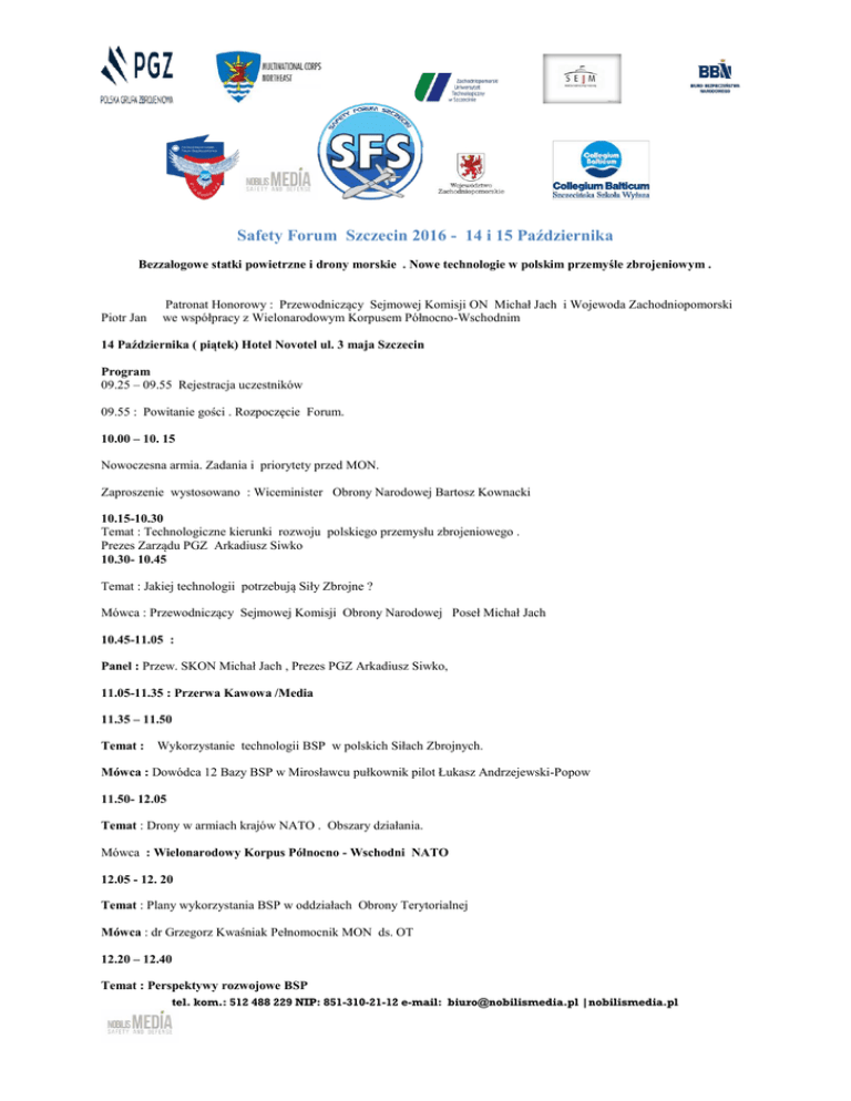 Safety Forum Szczecin 2016 - 14 i 15 Października Bezzałogowe statki powietrzne i drony morskie . Nowe technologie w polskim przemyśle zbrojeniowym . Piotr Jan Patronat Honorowy : Przewodniczący Sejmowej Komisji ON Michał Jach i Wojewoda Zachodniopomorski we współpracy z Wielonarodowym Korpusem Północno-Wschodnim 14 Października ( piątek) Hotel Novotel ul. 3 maja Szczecin Program 09.25 – 09.55 Rejestracja uczestników 09.55 : Powitanie gości . Rozpoczęcie Forum. 10.00 – 10. 15 Nowoczesna armia. Zadania i priorytety przed MON. Zaproszenie wystosowano : Wiceminister Obrony Narodowej Bartosz Kownacki 10.15-10.30 Temat : Technologiczne kierunki rozwoju polskiego przemysłu zbrojeniowego . Prezes Zarządu PGZ Arkadiusz Siwko 10.30- 10.45 Temat : Jakiej technologii potrzebują Siły Zbrojne ? Mówca : Przewodniczący Sejmowej Komisji Obrony Narodowej Poseł Michał Jach 10.45-11.05 : Panel : Przew. SKON Michał Jach , Prezes PGZ Arkadiusz Siwko, 11.05-11.35 : Przerwa Kawowa /Media 11.35 – 11.50 Temat : Wykorzystanie technologii BSP w polskich Siłach Zbrojnych. Mówca : Dowódca 12 Bazy BSP w Mirosławcu pułkownik pilot Łukasz Andrzejewski-Popow 11.50- 12.05 Temat : Drony w armiach krajów NATO . Obszary działania. Mówca : Wielonarodowy Korpus Północno - Wschodni NATO 12.05 - 12. 20 Temat : Plany wykorzystania BSP w oddziałach Obrony Terytorialnej Mówca : dr Grzegorz Kwaśniak Pełnomocnik MON ds. OT 12.20 – 12.40 Temat : Perspektywy rozwojowe BSP tel. kom.: 512 488 229 NIP: 851-310-21-12 e-mail: [email protected] |nobilismedia.pl Mówca : Płk dr inż. Tomasz Gugała Dyr. Programów bezzałogowych PGZ 12.40-12.55 Panel : Dowódca 12 Bazy Bezzałogowych Statków Powietrznych Popow, dr Grzegorz Kwaśniak , 12 BZ w Mirosławcu pułkownik pilot Łukasz Andrzejewski- Lunch 12.55 - 13.40 Drony Morskie 13.40- 13.55 Temat:. Drony podwodne . Obszary zastosowań Mówca : Polska Grupa Zbrojeniowa . Dyr. Joanna Sztiller Biuro Platform Morskich . 13.55 – 14.10 Temat : Możliwe obszary wykorzystywania dronów morskich i powietrznych w MW . Mówca: szef Inspektoratu MW kontradmirał Mirosław Mordel 14.10-14.25 Temat: Zabezpieczenia obiektów strategicznych z użyciem dronów. Mówca - Adam Pawlak , Zarząd Portów Szczecin i Świnoujście wiceprezes Azoty Police ds. bezpieczeństwa Rafał Kuźmiczonek 14.25 – 14.40 : Panel : Inspektorat MW , Terminal Gazu LNG Świnoujście , WKPW NATO 15.00- 15.15 Temat : Możliwości zastosowania polskiej technologii w dronach. Systemy antykolizyjne. Mówca : prof. Krzysztof Okarma Zachodniopomorski Uniwersytet Technologiczny 15.15- 15.30 Temat : Regulacje prawne dotyczące używania BSP . Ubezpieczenia dronów. Odpowiedzialność cywilna. Mówca : Kancelaria Prawna 15. 30- 15. 45 Temat : Szkolenia. Jak zostać operatorem BSP ( 12 BZ) Mówca : Nobilis Media /12 BZ 15.45-16.00 Panel : Kancelaria Prawna , Nobilis Media 16.00 : Podsumowanie Safety Forum Szczecin tel. kom.: 512 488 229 NIP: 851-310-21-12 e-mail: [email protected] |nobilismedia.pl DronFest Elite 15 października ( sobota) Jasne Błonia Szczecin ( otwarte dla publiczności) . Zapoznanie z nowoczesną technologią wykorzystywaną przez siły Zbrojne oraz inne służby zespolone. Prezentacje statyczne (punkty demonstracyjno-informacyjne): Stanowisk dowodzenia Dronami 12 Brygada Zmechanizowana ; 12 Baza Bezzałogowych Statków Powietrznych z Mirosławca, Wielonarodowy Korpus Północno–Wschodni NATO , Policja, Straży Graniczna, Państwowa Straż Pożarna, Wojewódzki Sztab Wojskowy Szczecin, 5 Pułk Inżynieryjny Zarząd Portów Morskich Szczecin i Świnoujście Polska Grupa Zbrojeniowa 10.00 - 16.00 10.00-10.10 - Otwarcie prezentacji statycznej Bezzałogowych Statków Powietrznych w służbie Polskiej Armii i NATO Stanowiska i Prezentacje Firm produkujących i wykorzystujących drony 10.10-10.45 – prezentacje: działania 12 Bazy Statków Powietrznych - dowódca 12 BSP z Mirosławca (telebim) wykorzystania BSP w działaniach bojowych i rozpoznawczych (12 BZ), WB Electronics, Wielonarodowy Korpus Północno-Wschodni NATO (telebim) koncert wojskowej orkiestry garnizonowej pokaz działania organizacji pro obronnej – Gwardia Narodowa 10.45- 11.15 – Musztra Paradna 12 BZ 11.15- 11.45 – Pokazy walki wręcz Combat 12 BZ 11.45- 12.00 – „Wojskowe formacje OT nową siłą ochrony społeczności lokalnej i obrony terytorium RP” – prezentacja WSzW Szczecin (telebim) 12.00 - 13.00 – Prezentacja na telebimie obrazu z lotu BSP nad Jasnymi Błoniami Demonstracja umiejętności szwadronów ułańskich. 13.00 - 14.00 – Defilada klas mundurowych oraz konkurs piosenki marszowej 14.00 - 15.00 – Policja i PSP w działaniach praktycznych (pokazy dynamiczne) 15.30 – Zakończenie Dodatkowo rozstawione stacjonarnie stoiska demonstracyjno-informacyjne nowych technologii będących na wyposażeniu SZ RP, służb zespolonych oraz innych zaproszonych podmiotów. *Niektóre elementy programu mogą ulec zmianie. tel. kom.: 512 488 229 NIP: 851-310-21-12 e-mail: [email protected] |nobilismedia.pl