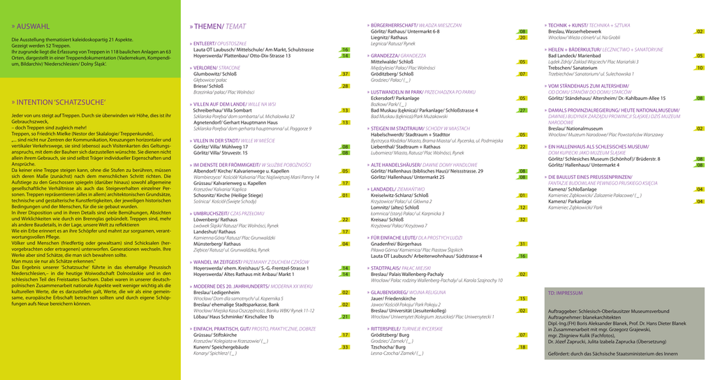 » Auswahl » THEMEN/ TEMAT Die Ausstellung thematisiert kaleidoskopartig 21 Aspekte. Gezeigt werden 52 Treppen. Ihr zugrunde liegt die Erfassung von Treppen in 118 baulichen Anlagen an 63 Orten, dargestellt in einer Treppendokumentation (Vademekum, Kompendium, Bildarchiv) ‘Niederschlesien/ Dolny Śląsk‘. » ENTLEERT/ opustoszałe Lauta OT Laubusch/ Mittelschule/ Am Markt, Schulstrasse Hoyerswerda/ Plattenbau/ Otto-Dix-Strasse 13 » Intention ‘Schatzsuche‘ Jeder von uns steigt auf Treppen. Durch sie überwinden wir Höhe, dies ist ihr Gebrauchszweck, – doch Treppen sind zugleich mehr! Treppen, so Friedrich Mielke (Nestor der Skalalogie/ Treppenkunde), „... sind nicht nur Zentren der Kommunikation, Kreuzungen horizontaler und vertikaler Verkehrswege, sie sind (ebenso) auch Visitenkarten des Geltungsanspruchs, mit dem der Bauherr sich darzustellen wünschte. Sie dienen nicht allein ihrem Gebrauch, sie sind selbst Träger individueller Eigenschaften und Ansprüche. Da keiner eine Treppe steigen kann, ohne die Stufen zu berühren, müssen sich deren Maße (zunächst) nach dem menschlichen Schritt richten. Die Aufstiege zu den Geschossen spiegeln (darüber hinaus) sowohl allgemeine gesellschaftliche Verhältnisse als auch das Steigeverhalten einzelner Personen. Treppen repräsentieren (alles in allem) architektonischen Grundsätze, technische und gestalterische Kunstfertigkeiten, der jeweiligen historischen Bedingungen und der Menschen, für die sie gebaut wurden. In ihrer Disposition und in ihren Details sind viele Bemühungen, Absichten und Wirklichkeiten wie durch ein Brennglas gebündelt. Treppen sind, mehr als andere Baudetails, in der Lage, unsere Welt zu reflektieren Wie ein Erbe erinnert es an ihre Schöpfer und mahnt zur sorgsamen, verantwortungsvollen Pflege. Völker und Menschen (friedfertig oder gewaltsam) sind Schicksalen (hervorgebrachten oder ertragenen) unterworfen. Generationen wechseln. Ihre Werke aber sind Schätze, die man sich bewahren sollte. Man muss sie nur als Schätze erkennen.“ Das Ergebnis unserer ‘Schatzsuche‘ führte in das ehemalige Preussisch Niederschlesien,– in die heutige Woiwodschaft Dolnoslaskie und in den schlesischen Teil des Freistaates Sachsen. Dabei waren in unserer deutschpolnischen Zusammenarbeit nationale Aspekte weit weniger wichtig als die kulturellen Werte, die es darzustellen galt, Werte, die wir als eine gemeinsame, europäische Erbschaft betrachten sollten und durch eigene Schöpfungen aufs Neue bereichern können. 16 14 » VERLOREN/ stracone Glumbowitz/ Schloß 37 Głębowice/ pałac Briese/ Schloß 28 Brzezinka/ pałac/ Plac Wolnósci » Villen AUF DEM LANDE/ wille na wsi Schreiberhau/ Villa Sombart Szklarska Poręba/ dom sombarta/ ul. Michalowka 32 Agnetendorf/ Gerhart Hauptmann Haus Szklarska Poręba/ dom gerharta hauptmanna/ ul. Poggorze 9 » VILLEN IN DER STADT/ wille w mieście Görlitz/ Villa/ Mühlweg 17 Görlitz/ Villa/ Struvestr. 15 »IM DIENSTE DER FRÖMMIGKEIT/ w służbie pobożności Albendorf/ Kirche/ Kalvarienwege u. Kapellen Wambierzyce/ Kościół/ Kalvaria/ Plac Najświętszej Marii Panny 14 Grüssau/ Kalvarienweg u. Kapellen Krzeszów/ Kalvaria/ Kaplica Schosnitz/ Kirche (Heilige Stiege) Sośnica/ Kościół (Święte Schody) » UMBRUCHSZEIT/ czas przełomu Löwenberg/ Rathaus Lwówek Śląski/ Ratusz/ Plac Wolnósci, Rynek Landeshut/ Rathaus Kamienna Góra/ Ratusz/ Plac Grunwaldzki Münsterberg/ Rathaus Ziębice/ Ratusz/ ul. Grunwaldzka, Rynek » WANDEL IM ZEITGEIST/ przemiany z duchem czaśow Hoyerswerda/ ehem. Kreishaus/ S.-G.-Frentzel-Strasse 1 Hoyerswerda/ Altes Rathaus mit Anbau/ Markt 1 » MODERNE DES 20. JAHRHUNDERTS/ moderna xx wieku Breslau/ Ledigenheim Wrocław/ Dom dla samotnych/ ul. Kopernika 5 Breslau/ ehemalige Stadtsparkasse, Bank Wrocław/ Miejska Kasa Oszczędności, Banku WBK/ Rynek 11-12 Löbau/ Haus Schminke/ Kirschallee 1b »EINFACH, PRAKTISCH, GUT/ prosto, praktycznie, dobrze Grüssau/ Stiftskirche Krzeszów/ Kolegiata w Krzeszowie/ ( _ ) Kunern/ Speichergebäude Konary/ Spichlerz/ ( _ ) 13 13 08 08 05 17 01 22 17 04 »BÜRGERHERRSCHAFT/ władza mieszczan Görlitz/ Rathaus/ Untermarkt 6-8 Liegnitz/ Rathaus Legnica/ Ratusz/ Rynek »GRANDEZZA/ grandezza Mittelwalde/ Schloß Międzylesie/ Pałac/ Plac Wolnósci Gröditzberg/ Schloß Grodziec/ Pałac/ ( _ ) »LUSTWANDELN IM PARK/ przechadzka po parku Eckersdorf/ Parkanlage Bożkow/ Park/ ( _ ) Bad Muskau (Łęknica)/ Parkanlage/ Schloßstrasse 4 Bad Muskau (Łęknica)/Park Mużakowski »STEIGEN IM STADTRAUM/ schody w miastach Habelschwerdt/ Stadtraum + Stadttor Bystrzyca Kłodzko/ Miasto, Brama Miasta/ ul. Rycerska, ul. Podmiejska Liebenthal/ Stadtraum + Rathaus Lubomierz/ Miasto, Ratusz/ Plac Wolnósci, Rynek »ALTE HANDELSHÄUSER/ dawne domy handlowe Görlitz/ Hallenhaus (biblisches Haus)/ Neissstrasse. 29 Görlitz/ Hallenhaus/ Untermarkt 25 »LANDADEL/ ziemiańtwo Kreiselwitz-Schlanz/ Schloß Krzyżowice/ Pałac/ ul. Główna 2 Lomnitz/ (altes) Schloß Łomnica/ (stary) Pałac/ ul. Karpnicka 3 Kreisau/ Schloß Krzyżowa/ Pałac/ Krzyżowa 7 »FÜR EINFACHE LEUTE/ dla prostych ludzi Gnadenfrei/ Bürgerhaus Piława Górna/ Kamienica/ Plac Piastow Śląskich Lauta OT Laubusch/ Arbeiterwohnhaus/ Südstrasse 4 14 14 »STADTPALAIS/ pałac miejski Breslau/ Palais Wallenberg-Pachaly Wrocław/ Pałac rodziny Wallenberg-Pachaly/ ul. Karola Szajnochy 10 02 »GLAUBENSKRIEG/ wojna religijna Jauer/ Friedenskirche Jawor/ Kościół Pokoju/ Park Pokoju 2 Breslau/ Universität (Jesuitenkolleg) Wrocław/ Uniwersytet (Kolegium Jezuickie)/ Plac Uniwersytecki 1 02 21 17 33 »RITTERSPIELE/ turnieje rycerskie Gröditzberg/ Burg Grodziec/ Zamek/ ( _ ) Tzschocha/ Burg Lesna-Czocha/ Zamek/ ( _ ) 07 »TECHNIK + KUNST/ technika + sztuka Breslau, Wasserhebewerk Wrocław/ Wieża ciśnień/ ul. Na Grobli »HEILEN + BÄDERKULTUR/ lecznictwo + sanatoryjne Bad Landeck/ Marienbad Lądek Zdrój/ Zaklad Wojciech/ Plac Mariański 3 Trebschen/ Sanatorium Trzebiechów/