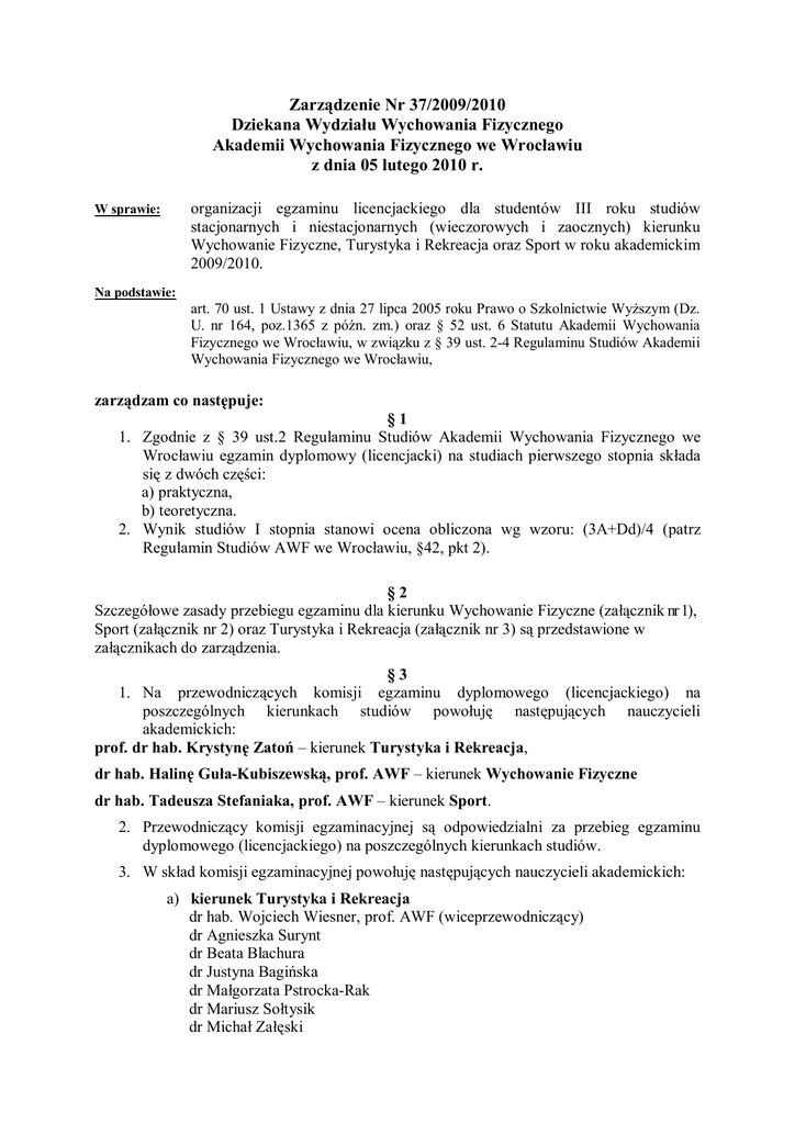 Zarządzenie Nr 37/2009/2010 Dziekana Wydziału Wychowania