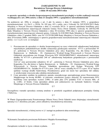 ZARZĄDZENIE Nr 645 Burmistrza Nowego Dworu Gdańskiego z dnia 10 stycznia 2014 roku w sprawie: sprzedaży w drodze bezprzetargowej nieruchomości przyległej w trybie realizacji roszczeń wynikających z art. 209a ustawy z dnia 21 sierpnia 1997r. o gospodarce nieruchomościami Na podstawie art. 209a w związku z art. 4 pkt 3a ustawy z dnia 21 sierpnia 1997r. o gospodarce nieruchomościami (j.t Dz.U. z 2010r. Nr 102 poz. 651 z późn. zm.), Uchwały Nr 245/XXIX/2013 Rady Miejskiej w Nowym Dworze Gdańskim z dnia 12 września 2013r. w sprawie udzielania bonifikaty przy sprzedaży nieruchomości stanowiących własność Gminy Nowy Dwór Gdański, Uchwały Nr 269/XLI/98 Rady Miejskiej w Nowym Dworze Gdańskim z dnia 30 kwietnia 1998 roku w sprawie gospodarowania nieruchomościami stanowiącymi własność gminy, Uchwały Nr 8/II/2002 Rady Miejskiej w Nowym Dworze Gdańskim z dnia 13 grudnia 2002r. oraz Nr 133/XVIII/2008 Rady Miejskiej w Nowym Dworze Gdańskim z dnia 29 kwietnia 2008r. zmieniającej w sprawie gospodarowania nieruchomościami stanowiącymi własność gminy z a r z ą d z a m co następuje: §1 1. Przeznaczam do sprzedaży w drodze bezprzetargowej na rzecz właścicieli zabudowanej budynkiem mieszkalnym jednolokalowym działki oznaczonej geodezyjnie numerem 477/3 o powierzchni 95 m2, położonej w Nowym Dworze Gdańskim przy ulicy Kopernika 15a, dla której w Sądzie Rejonowym w Malborku – IX Zamiejscowy Wydział Ksiąg Wieczystych w Nowym Dworze Gdańskim prowadzona jest Księga Wieczysta KW GD2M/00047049/2, nieruchomość stanowiącą działkę Nr 477/19 o powierzchni 248 m2 zabudowaną budynkiem gospodarczym o powierzchni użytkowej 32,8 m2 oraz powierzchni zabudowy 42 m2 , położoną w Nowym Dworze Gdańskim przy ulicy Kopernika 15a, dla której w Sądzie Rejonowym w Malborku – IX Zamiejscowy Wydział Ksiąg Wieczystych w Nowym Dworze Gdańskim prowadzona jest Księga Wieczysta KW GD2M/00054517/6. Działka Nr 477/19 o pow. 248 m2 wraz z działką Nr 477/3 o pow. 95 m2 będzie spełniać wymogi działki budowlanej. Przedmiotowy grunt nie może być sprzedany lub oddany w użytkowanie wieczyste jako odrębna nieruchomość. 2. Cenę sprzedaży ustalam na podstawie operatu szacunkowego sporządzonego przez Rzeczoznawcę Majątkowego na kwotę 40.000,- zł (słownie: czterdzieści tysięcy złotych). Po zastosowaniu 95% bonifikaty cena sprzedaży wynosi 2.000,- zł netto plus 23% podatku VAT w kwocie 460,- zł tj. 2.460,- zł brutto. Cena sprzedaży płatna jest jednorazowo na rachunek bankowy Urzędu Miejskiego w Nowym Dworze Gdańskim. §2 Szczegółowe warunki sprzedaży zostaną ustalone w protokole uzgodnień podpisanym pomiędzy Gminą i Nabywcą. §3 W Planie Zagospodarowania Przestrzennego Miasta Nowy Dwór Gdański teren obejmujący nieruchomość opisaną w § 1 określony jest jako „teren zabudowy mieszkaniowej mieszanej. §4 Sprzedaż nieruchomości, o której mowa w § 1 nastąpi na podstawie aktu notarialnego. §5 Wykonanie Zarządzenia powierzam Referatowi Majątku Komunalnego. §6 Zarządzenie wchodzi w życie z dniem wydania. UZASADNIENIE Gmina Nowy Dwór Gdański jest właścicielem nieruchomości stanowiącej działkę Nr 477/19 o powierzchni 248 m2 położonej w Nowym Dworze Gdańskim przy ulicy Kopernika 15a. Zgodnie z Planem Zagospodarowania Przestrzennego Miasta Nowy Dwór Gdański nieruchomość będąca przedmiotem zbycia położona jestw terenie zabudowy mieszkaniowej i usługowej lub usługowej i znajduje się w strefie ochrony konserwatorskiej A. W celu realizacji roszczeń wynikających z art. 209a ustawy z dnia 21 sierpnia 1997r. o gospodarce nieruchomościami (j.t Dz.U. z 2010r. Nr 102 poz. 651 z późn. zm.) nieruchomość przeznaczam do sprzedaży w drodze bezprzetargowej na poprawę warunków zagospodarowania nieruchomości przyległej. Wobec powyższego wydanie niniejszego Zarządzenia jest konieczne i uzasadnione. WYKAZ nieruchomości przeznaczonej do zbycia w drodze bezprzetargowej w celu realizacji roszczeń wynikających z art. 209a ustawy z dnia 21 sierpnia 1997r. o gospodarce nieruchomościami (j.t. Dz.U. z 2010r. Nr 102 poz. 651 z późn. zm.) na podstawie Zarządzenia Nr 645 Burmistrza Nowego Dworu Gdańskiego z dnia 10 stycznia 2014r. Lp KW Nr działki Pow. w m2 Opis nieruchomości Przeznaczenie nieruchomości i sposób zagospodarowania Termin zabudowy Cena gruntu z zastosowaniem 95% bonifikaty od ceny sprzedaży (zł) Forma zbycia 1. GD2M / 00054517 /6 477/19 248 Nieruchomość zabudowana budynkiem gospodarczym Teren zabudowy mieszkaniowej i usługowej lub usługowej Nie jest wymagany 2.000,+23% VAT = 2.460,- własność sprzedaż w trybie art. 209a ustawy o gospodarce nieruchomościami IB Wykaz wywiesza się na tablicy ogłoszeń Urzędu Miejskiego w Nowym Dworze Gdańskim na okres 21 dni od 10.01.2014r. do 30.01.2014r. Uwagi: Na podstawie Art. 34 ust. 1, pkt 1 i 2 Ustawy o gospodarce nieruchomościami (Dz.U. z 2010r. Nr 102 poz. 651 z późn. zm.) pierwszeństwo nabycia nieruchomości z zastrzeżeniem Art. 216a przysługuje osobie, która spełnia jeden z warunków: 1. przysługuje jej roszczenie o nabycie nieruchomości z mocy niniejszej ustawy lub odrębnych przepisów, 2. jest poprzednim właścicielem zbywanej nieruchomości pozbawionym prawa własności tej nieruchomości przed 5 grudnia 1990r. albo jego spadkobiercą, jeżeli złoży wniosek o nabycie tej nieruchomości do Burmistrza Nowego Dworu Gdańskiego ul. Wejhera 3 do dnia 20 lutego 2014 r. ZARZĄDZENIE Nr 644 Burmistrza Nowego Dworu Gdańskiego z dnia 10 stycznia 2014 roku zmieniające w sprawie sprzedaży nieruchomości w drodze bezprzetargowej. Na podstawie art. 37 ust. 2 pkt 1, art. 34 ust. 1 pkt 6 i 6a Ustawy z dnia 21 sierpnia 1997r. o gospodarce nieruchomościami (j.t Dz.U. z 2010r. Nr 102 poz. 651 z późn. zm.), Uchwały Nr 268/XLI/98 Rady Miejskiej w Nowym Dworze Gdańskim z dnia 30 kwietnia 1998 roku w sprawie przyznania pierwszeństwa w nabywaniu 