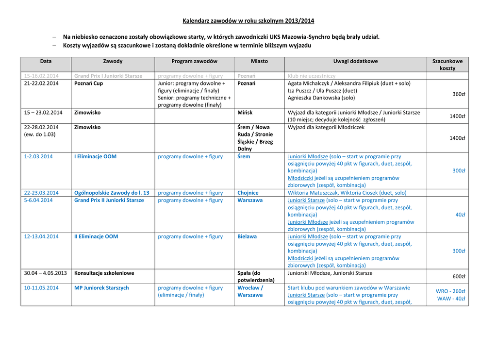 Kalendarz zawodów w roku szkolnym 2013/2014 Na niebiesko oznaczone zostały obowiązkowe starty, w których zawodniczki UKS Mazowia-Synchro będą brały udział. Koszty wyjazdów są szacunkowe i zostaną dokładnie określone w terminie bliższym wyjazdu Data 15-16.02.2014 21-22.02.2014 Zawody Grand Prix I Juniorki Starsze Poznań Cup Program zawodów programy dowolne + figury Junior: programy dowolne + figury (eliminacje / finały) Senior: programy techniczne + programy dowolne (finały) Miasto Poznań Poznań 15 – 23.02.2014 Zimowisko Mińsk 22-28.02.2014 (ew. do 1.03) Zimowisko 1-2.03.2014 I Eliminacje OOM Śrem / Nowa Ruda / Stronie Śląskie / Brzeg Dolny Śrem 22-23.03.2014 5-6.04.2014 12-13.04.2014 Ogólnopolskie Zawody do l. 13 Grand Prix II Juniorki Starsze II Eliminacje OOM 30.04 – 4.05.2013 Konsultacje szkoleniowe 10-11.05.2014 MP Juniorek Starszych programy dowolne + figury programy dowolne + figury programy dowolne + figury programy dowolne + figury programy dowolne + figury (eliminacje / finały) Chojnice Warszawa Bielawa Spała (do potwierdzenia) Wrocław / Warszawa Uwagi dodatkowe Klub nie uczestniczy Agata Michalczyk / Aleksandra Filipiuk (duet + solo) Iza Puszcz / Ula Puszcz (duet) Agnieszka Dankowska (solo) Wyjazd dla kategorii Juniorki Młodsze / Juniorki Starsze (10 miejsc; decyduje kolejność zgłoszeń) Wyjazd dla kategorii Młodziczek Szacunkowe koszty 360zł 1400zł 1400zł Juniorki Młodsze (solo – start w programie przy osiągnięciu powyżej 40 pkt w figurach, duet, zespół, kombinacja) Młodziczki jeżeli są uzupełnieniem programów zbiorowych (zespół, kombinacja) Wiktoria Matuszczak, Wiktoria Ciosek (duet, solo) Juniorki Starsze (solo – start w programie przy osiągnięciu powyżej 40 pkt w figurach, duet, zespół, kombinacja) Juniorki Młodsze jeżeli są uzupełnieniem programów zbiorowych (zespół, kombinacja) Juniorki Młodsze (solo – start w programie przy osiągnięciu powyżej 40 pkt w figurach, duet, zespół, kombinacja) Młodziczki jeżeli są uzupełnieniem programów zbiorowych (zespół, kombinacja) Juniorski Młodsze, Juniorski Starsze Start klubu pod warunkiem zawodów w Warszawie Juniorki Starsze (solo – start w programie przy osiągnięciu powyżej 40 pkt w figurach, duet, zespół, 300zł 40zł 300zł 600zł WRO - 260zł WAW - 40zł 24-25.05.2014 7-8.06.2014 14-15.06.2014 MP Seniorek OPEN Międzystrefowe MM MP Juniorek Młodszych Czerwiec / lipiec OOM 22.11.2014 Puchar Polski Programy techniczne; Programy dowolne Poznań programy dowolne + figury programy dowolne + figury (eliminacje / finały) Gdańsk / Leszno Poznań programy dowolne + figury (eliminacje / finały) Programy dowolne Ustala MSiT Poznań kombinacja) Juniorki Młodsze jeżeli są uzupełnieniem programów zbiorowych (zespół, kombinacja) Seniorki (solo, duet, zespół, kombinacja) Juniorki Starsze jeżeli są uzupełnieniem programów zbiorowych (zespół, kombinacja) Młodziczki (solo, duet, zespół, kombinacja) Juniorki Młodsze (solo – start w programie przy osiągnięciu powyżej 40 pkt w figurach, duet, zespół, kombinacja) Młodziczki jeżeli są uzupełnieniem programów zbiorowych (zespół, kombinacja) Zakwalifikowane zawodniczki 260zł 260zł 260zł Do potwierdzenia 1 solo, 1 duet, 1 zespół, 1 kombinacja (możliwość startu wszystkich kategorii wiekowych) Daty, kiecy NIE ODBYWAJĄ się treningi (trening planowo zostały odwołane): LISTOPAD GRUDZIEŃ STYCZEŃ LUTY MARZEC KWIECIEŃ MAJ CZERWIEC 2.11.2013 - po święcie zmarłych / 9.11.2012 - klinika dla sędziów i trenerów / 11.11.2013 - Święto Niepodległości / 23.11.2013 - Puchar Polski 23 - 31.2013 – przerwa Świąteczna 1 – 4.01.2014 – przerwa Świąteczna / 6.01.2014 – Święto Trzech Króli 17 – 28.02.2014 – ferie zimowe (w czasie ferii odbędą się zimowiska) 1.03.2014 – ferie zimowe 19.04 - Wieka Sobota / 21.04 – Wielkanoc / 30 – 31.04.2013 – planowane konsultacje klubowe 3.05.2013 – Święto 3-go maja xx