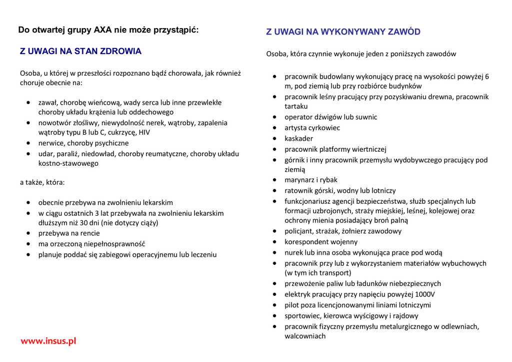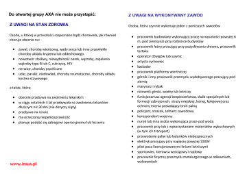 Do otwartej grupy AXA nie może przystąpić: Z UWAGI NA WYKONYWANY ZAWÓD Z UWAGI NA STAN ZDROWIA Osoba, która czynnie wykonuje jeden z poniższych zawodów Osoba, u której w przeszłości rozpoznano bądź chorowała, jak również choruje obecnie na: zawał, chorobę wieńcową, wady serca lub inne przewlekłe choroby układu krążenia lub oddechowego nowotwór złośliwy, niewydolność nerek, wątroby, zapalenia wątroby typu B lub C, cukrzycę, HIV nerwice, choroby psychiczne udar, paraliż, niedowład, choroby reumatyczne, choroby układu kostno-stawowego a także, która: obecnie przebywa na zwolnieniu lekarskim w ciągu ostatnich 3 lat przebywała na zwolnieniu lekarskim pracownik budowlany wykonujący pracę na wysokości powyżej 6 m, pod ziemią lub przy rozbiórce budynków pracownik leśny pracujący przy pozyskiwaniu drewna, pracownik dłuższym niż 30 dni (nie dotyczy ciąży) przebywa na rencie ma orzeczoną niepełnosprawność planuje poddać się zabiegowi operacyjnemu lub leczeniu www.insus.pl tartaku operator dźwigów lub suwnic artysta cyrkowiec kaskader pracownik platformy wiertniczej górnik i inny pracownik przemysłu wydobywczego pracujący pod ziemią marynarz i rybak ratownik górski, wodny lub lotniczy funkcjonariusz agencji bezpieczeństwa, służb specjalnych lub formacji uzbrojonych, straży miejskiej, leśnej, kolejowej oraz ochrony mienia posiadający broń palną policjant, strażak, żołnierz zawodowy korespondent wojenny nurek lub inna osoba wykonująca prace pod wodą pracownik przy lub z wykorzystaniem materiałów wybuchowych (w tym ich transport) przewożenie paliw lub ładunków niebezpiecznych elektryk pracujący przy napięciu powyżej 1000V pilot poza licencjonowanymi liniami lotniczymi sportowiec, kierowca wyścigowy i rajdowy pracownik fizyczny przemysłu metalurgicznego w odlewniach, walcowniach