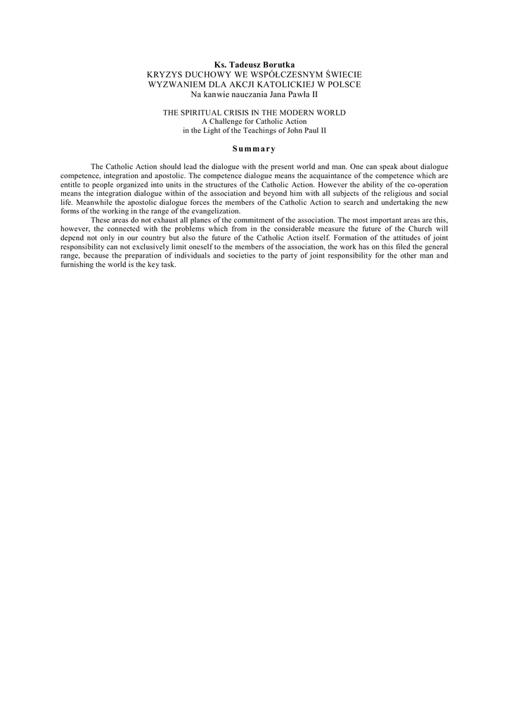 Ks. Tadeusz Borutka KRYZYS DUCHOWY WE WSPÓŁCZESNYM ŚWIECIE WYZWANIEM DLA AKCJI KATOLICKIEJ W POLSCE Na kanwie nauczania Jana Pawła II THE SPIRITUAL CRISIS IN THE MODERN WORLD A Challenge for Catholic Action in the Light of the Teachings of John Paul II Summary The Catholic Action should lead the dialogue with the present world and man. One can speak about dialogue competence, integration and apostolic. The competence dialogue means the acquaintance of the competence which are entitle to people organized into units in the structures of the Catholic Action. However the ability of the co-operation means the integration dialogue within of the association and beyond him with all subjects of the religious and social life. Meanwhile the apostolic dialogue forces the members of the Catholic Action to search and undertaking the new forms of the working in the range of the evangelization. These areas do not exhaust all planes of the commitment of the association. The most important areas are this, however, the connected with the problems which from in the considerable measure the future of the Church will depend not only in our country but also the future of the Catholic Action itself. Formation of the attitudes of joint responsibility can not exclusively limit oneself to the members of the association, the work has on this filed the general range, because the preparation of individuals and societies to the party of joint responsibility for the other man and furnishing the world is the key task.
