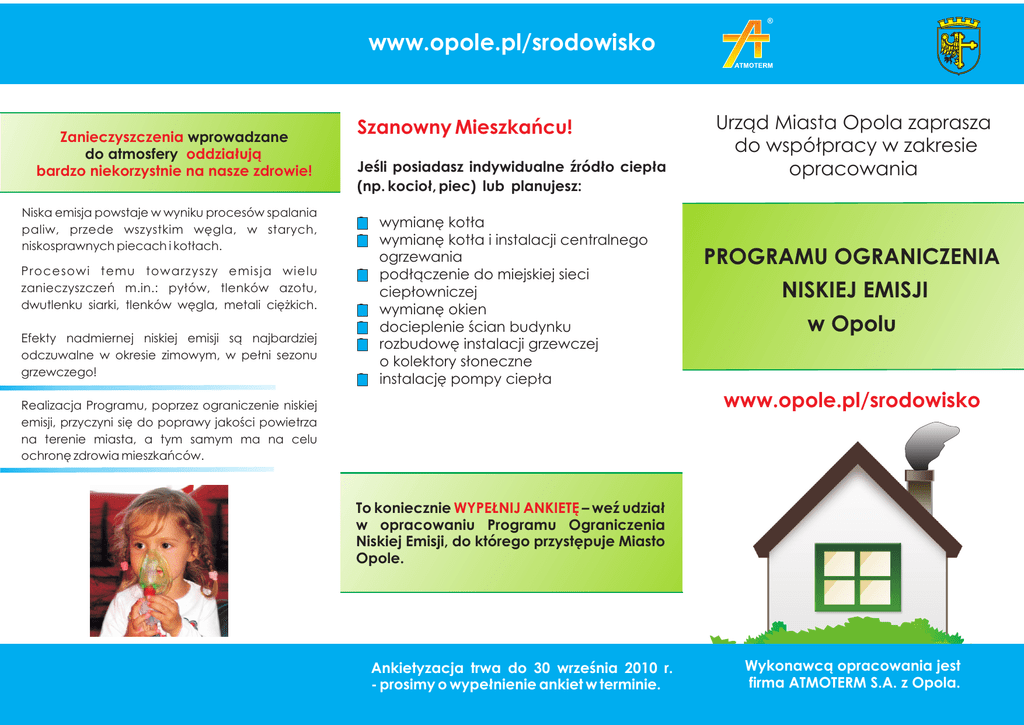 ® www.opole.pl/srodowisko Zanieczyszczenia wprowadzane do atmosfery oddzia³uj¹ bardzo niekorzystnie na nasze zdrowie! Niska emisja powstaje w wyniku procesów spalania paliw, przede wszystkim wêgla, w starych, niskosprawnych piecach i kot³ach. Procesowi temu towarzyszy emisja wielu zanieczyszczeñ m.in.: py³ów, tlenków azotu, dwutlenku siarki, tlenków wêgla, metali ciê¿kich. Efekty nadmiernej niskiej emisji s¹ najbardziej odczuwalne w okresie zimowym, w pe³ni sezonu grzewczego! Szanowny Mieszkañcu! Jeœli posiadasz indywidualne Ÿród³o ciep³a (np. kocio³, piec) lub planujesz: ? wymianê kot³a ? wymianê kot³a i instalacji centralnego ogrzewania ? pod³¹czenie do miejskiej sieci ciep³owniczej ? wymianê okien ? docieplenie œcian budynku ? rozbudowê instalacji grzewczej o kolektory s³oneczne ? instalacjê pompy ciep³a Urz¹d Miasta Opola zaprasza do wspó³pracy w zakresie opracowania PROGRAMU OGRANICZENIA NISKIEJ EMISJI w Opolu www.opole.pl/srodowisko Realizacja Programu, poprzez ograniczenie niskiej emisji, przyczyni siê do poprawy jakoœci powietrza na terenie miasta, a tym samym ma na celu ochronê zdrowia mieszkañców. To koniecznie WYPE£NIJ ANKIETÊ – weŸ udzia³ w opracowaniu Programu Ograniczenia Niskiej Emisji, do którego przystêpuje Miasto Opole. Ankietyzacja trwa do 30 wrzeœnia 2010 r. - prosimy o wype³nienie ankiet w terminie. Wykonawc¹ opracowania jest firma ATMOTERM S.A. z Opola. www.opole.pl/srodowisko Szanowny Mieszkañcu! Jeœli posiadasz indywidualne Ÿród³o ciep³a (np. kocio³, piec), WYPE£NIJ ANKIETÊ – weŸ udzia³ w opracowaniu PROGRAMU OGRANICZENIA NISKIEJ EMISJI, do którego przystêpuje Miasto Opole. Na stronie internetowej www.opole.pl, w zak³adce „Miasto”, a nastêpnie „Ekologia” lub bezpoœrednio na stronie www.opole.pl/srodowisko - mo¿na znaleŸæ odnoœnik do Programu i przeczytaæ wiêcej informacji na ten temat. Wype³nienie ankiety i realizacja Programu daj¹ szansê skorzystania z pomocy finansowej*, a jednoczeœnie wniesienia swojego wk³adu w poprawê stanu powietrza atmosferycznego w naszym mieœcie. Chroñ œrodowisko i nasze zdrowie! Wypeùnienie ankiety pomoýe opracowaã dobry Program dla miasta Opola, którego realizacja: · przyczyni siæ do poprawy jakoúci powietrza, którym oddychamy · poprawi jakoúã ýycia i zdrowia mieszkañców, w szczególnoúci dzieci i osób starszych, najbardziej wraýliwych na zanieczyszczenie powietrza · umoýliwi okreúlenie potrzebnego wsparcia finansowego* dla realizacji zadañ inwestycyjnych w ramach Programu (np. wymiany twojego kotùa, instalacji kolektorów sùonecznych) zainwestuj w likwidacjê starego kot³a i pod³¹cz siê do miejskiej sieci ciep³owniczej lub skorzystaj z innych bardziej ekologicznych Ÿróde³ ogrzewania (np. gaz, olej) oraz odnawialnych Ÿróde³ energii oszczêdzaj energiê i dbaj o dobry stan techniczny urz¹dzeñ grzewczych (kot³a, pieca) i instalacji kominowych, dziêki temu ograniczysz zu¿ycie paliw i emisjê zanieczyszczeñ stosuj paliwo dobrej jakoœci (z atestem) segreguj odpady i nie spalaj odpadów w piecach (szczególnie tworzyw sztucznych, gum, opon) nie wypalaj traw i nie spalaj odpadów na otwartych przestrzeniach (ogródkach przydomowych, dzia³kach) * mo¿liwoœæ skorzystania z dofinansowania w postaci dotacji Ankietyzacja trwa do 30 wrzeœnia 2010 r. - prosimy o wype³nienie ankiet w terminie. na zmianê sposobu ogrzewania na proekologiczne lub monta¿ odnawialnych Ÿróde³ energii uzale¿niona jest od wejœcia w ¿ycie zmian prawnych umo¿liwiaj¹cych udzielenie takich dotacji.