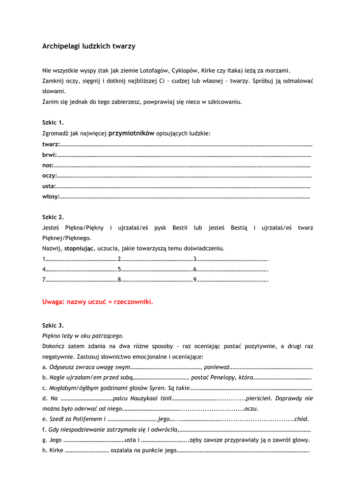 Archipelagi ludzkich twarzy Nie wszystkie wyspy (tak jak ziemie Lotofagów, Cyklopów, Kirke czy Itaka) leżą za morzami. Zamknij oczy, sięgnij i dotknij najbliższej Ci - cudzej lub własnej - twarzy. Spróbuj ją odmalować słowami. Zanim się jednak do tego zabierzesz, powprawiaj się nieco w szkicowaniu. Szkic 1. Zgromadź jak najwięcej przymiotników opisujących ludzkie: twarz:…………………………………………………………………………….………………………………………………………………………… brwi:………………………………………………………………………………………………………………………………………………………… nos:……………………………………………………………………………….………………………………………………………………………… oczy:………………………………………………………………………………………………………………………………………………………… usta:………………………………………………………………………………………………………………………………………………………… włosy:……………………………………………………………………………………………………………………………………………………… Szkic 2. Jesteś Piękna/Piękny i ujrzałaś/eś pysk Bestii lub jesteś Bestią i ujrzałaś/eś twarz Pięknej/Pięknego. Nazwij, stopniując, uczucia, jakie towarzyszą temu doświadczeniu. 1………………………………………….2………………………………………….3…………………………………………. 4………………………………………….5………………………………………….6…………………………………………. 7………………………………………….8………………………………………….9…………………………………………. Uwaga: nazwy uczuć = rzeczowniki. Szkic 3. Piękno leży w oku patrzącego. Dokończ zatem zdania na dwa różne sposoby - raz oceniając postać pozytywnie, a drugi raz negatywnie. Zastosuj słownictwo emocjonalne i oceniające: a. Odyseusz zwraca uwagę swym…………………………………………, ponieważ………………………………………………… b. Nagle ujrzałam/em przed sobą………………………………… postać Penelopy, która…………………………………. c. Mogłabym/ógłbym godzinami głosów Syren. Są takie………………………………………………………………………… d. Na ………………………………palcu Nauzykaai lśnił…………………………..............pierścień. Doprawdy nie można było oderwać od niego…………………………………..............................oczu. e. Szedł za Polifemem i …………………………….jego…...………………………..................................chód. f. Gdy niespodziewanie zatrzymała się i odwróciła,……………………………………………………………………………… g. Jego ……………………………………usta i …………………………..zęby zawsze przyprawiały ją o zawrót głowy. h. Kirke ………………………… oszalała na punkcie jego………………………………………………………………………………. Szkic 4. Posługując się frazeologizmami, sporządź 8-o zdaniowy zoomorfizujący twarz opis twarzy wybranego bohatera/ki „Odysei” uwzględniający kształt i wygląd: twarzy, czoła, brwi, rzęs, oczu, policzków, ust, brody lub włosów. 1…………………………………………………………………………………............................................................ 2…………………………………………………………………………………............................................................ 3…………………………………………………………………………………............................................................ 4…………………………………………………………………………………............................................................ 5…………………………………………………………………………………............................................................ 6…………………………………………………………………………………............................................................ 7…………………………………………………………………………………............................................................ 8…………………………………………………………………………………............................................................ Uwaga: Zdania mają być pojedyncze rozwinięte. Całość powinna stworzyć spójny opis. Przykłady frazeologizmów zoomorfizujących: żabie oczy, żabie usta, lwia grzywa, sokoli wzrok, rybie oczy, zjeżone włosy lub jeż. Szkic 5. A teraz wyobraź sobie, że masz przed sobą twarz niczym rumiane jabłuszko? dojrzałą brzoskwinię? Opisz ją w 10-u zdaniach, posługując się epitetami lub porównaniami żywnościowymi. 1…………………………………………………………………………………............................................................ 2…………………………………………………………………………………......................................................... 3…………………………………………………………………………………............................................................ 4………………………………