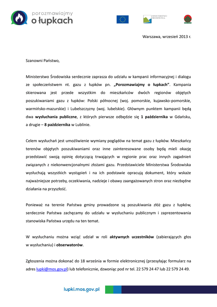 Warszawa, wrzesień 2013 r. Szanowni Państwo, Ministerstwo Środowiska serdecznie zaprasza do udziału w kampanii informacyjnej i dialogu ze społeczeństwem nt. gazu z łupków pn. „Porozmawiajmy o łupkach”. Kampania skierowana jest przede wszystkim do mieszkańców dwóch regionów objętych poszukiwaniami gazu z łupków: Polski północnej (woj. pomorskie, kujawsko-pomorskie, warmińsko-mazurskie) i Lubelszczyzny (woj. lubelskie). Głównym punktem kampanii będą dwa wysłuchania publiczne, z których pierwsze odbędzie się 1 października w Gdańsku, a drugie – 8 października w Lublinie. Celem wysłuchań jest umożliwienie wymiany poglądów na temat gazu z łupków. Mieszkańcy terenów objętych poszukiwaniami oraz inne zainteresowane osoby będą mieli okazję przedstawić swoją opinię dotyczącą trwających w regionie prac oraz innych zagadnień związanych z niekonwencjonalnymi złożami gazu. Przedstawiciele Ministerstwa Środowiska wysłuchają wszystkich wystąpień i na ich podstawie opracują dokument, który wskaże najważniejsze potrzeby, oczekiwania, nadzieje i obawy zaangażowanych stron oraz niezbędne działania na przyszłość. Ponieważ na terenie Państwa gminy prowadzone są poszukiwania złóż gazu z łupków, serdecznie Państwa zachęcamy do udziału w wysłuchaniu publicznym i zaprezentowania stanowiska Państwa urzędu na ten temat. W wysłuchaniu można wziąć udział w roli aktywnych uczestników (zabierających głos w wysłuchaniu) i obserwatorów. Zgłoszenia można dokonać do 18 września w formie elektronicznej (przesyłając formularz na adres [email protected]) lub telefonicznie, dzwoniąc pod nr tel. 22 579 24 47 lub 22 579 24 49. Wszystkim aktywnym uczestnikom przysługiwać będzie 5 minut na zaprezentowanie swojej opinii. W ramach wystąpienia aktywny uczestnik może przedstawić swoje stanowisko na temat gazu z łupków w Polsce oraz przekazać swoje uwagi i rekomendacje dotyczące prawodawstwa, współpracy z koncesjonariuszami, funkcjonowania administracji, ochrony środowiska, komunikacji społecznej itp. Ponieważ przewidziany czas wystąpienia jest bardzo krótki, wszyscy aktywni uczestnicy będą mieli możliwość przekazania Ministerstwu Środowiska uzupełniającej opinii pisemnej. Planujemy opublikować zebrane opinie pisemne na stronie internetowej kampanii. Regulamin wysłuchań znajduje się na stronie http://lupki.mos.gov.pl/wysluchania-publiczne. Udział w wysłuchaniu jest bezpłatny. Organizatorzy zapewniają przedstawicielom samorządów zwrot kosztów podróży i noclegu. Zachęcamy także do rozpowszechnienia informacji o stronie http://lupki.mos.gov.pl i o całej kampanii wśród mieszkańców Państwa gminy, a także do przekazania informacji o możliwości wzięcia przez nich udziału w wysłuchaniu publicznym (w załączeniu znajduje się ogłoszenie skierowane do mieszkańców – do ewentualnego wykorzystania). W razie jakichkolwiek pytań proszę o kontakt mailowy ([email protected]) lub telefoniczny (22 579 24 47 lub 22 579 24 49). Chętnie udzielimy wszelkich informacji. Z poważaniem Departament Geologii i Koncesji Geologicznych Ministerstwo Środowiska Załączniki: 1. Formularz zgłoszeniowy 2. Ogłoszenie dla mieszkańców