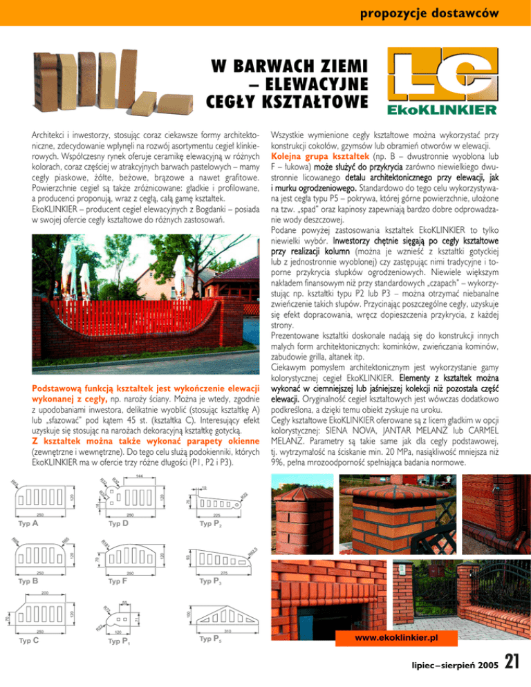 propozycje dostawców W BARWACH ZIEMI – ELEWACYJNE CEGŁY KSZTAŁTOWE Architekci i inwestorzy, stosując coraz ciekawsze formy architektoniczne, zdecydowanie wpłynęli na rozwój asortymentu cegieł klinkierowych. Współczesny rynek oferuje ceramikę elewacyjną w różnych kolorach, coraz częściej w atrakcyjnych barwach pastelowych – mamy cegły piaskowe, żółte, beżowe, brązowe a nawet grafitowe. Powierzchnie cegieł są także zróżnicowane: gładkie i profilowane, a producenci proponują, wraz z cegłą, całą gamę kształtek. EkoKLINKIER – producent cegieł elewacyjnych z Bogdanki – posiada w swojej ofercie cegły kształtowe do różnych zastosowań. Podstawową funkcją kształtek jest wykończenie elewacji wykonanej z cegły, np. naroży ściany. Można je wtedy, zgodnie z upodobaniami inwestora, delikatnie wyoblić (stosując kształtkę A) lub „sfazować” pod kątem 45 st. (kształtka C). Interesujący efekt uzyskuje się stosując na narożach dekoracyjną kształtkę gotycką. Z kształtek można także wykonać parapety okienne (zewnętrzne i wewnętrzne). Do tego celu służą podokienniki, których EkoKLINKIER ma w ofercie trzy różne długości (P1, P2 i P3). Wszystkie wymienione cegły kształtowe można wykorzystać przy konstrukcji cokołów, gzymsów lub obramień otworów w elewacji. Kolejna grupa kształtek (np. B – dwustronnie wyoblona lub F – łukowa) może służyć do przykrycia zarówno niewielkiego dwustronnie licowanego detalu architektonicznego przy elewacji, jak i murku ogrodzeniowego. Standardowo do tego celu wykorzystywana jest cegła typu P5 – pokrywa, której górne powierzchnie, ułożone na tzw. „spad” oraz kapinosy zapewniają bardzo dobre odprowadzanie wody deszczowej. Podane powyżej zastosowania kształtek EkoKLINKIER to tylko niewielki wybór. Inwestorzy chętnie sięgają po cegły kształtowe przy realizacji kolumn (można je wznieść z kształtki gotyckiej lub z jednostronnie wyoblonej) czy zastępując nimi tradycyjne i toporne przykrycia słupków ogrodzeniowych. Niewiele większym nakładem finansowym niż przy standardowych „czapach” – wykorzystując np. kształtki typu P2 lub P3 – można otrzymać niebanalne zwieńczenie takich słupów. Przycinając poszczególne cegły, uzyskuje się efekt dopracowania, wręcz dopieszczenia przykrycia, z każdej strony. Prezentowane kształtki doskonale nadają się do konstrukcji innych małych form architektonicznych: kominków, zwieńczania kominów, zabudowie grilla, altanek itp. Ciekawym pomysłem architektonicznym jest wykorzystanie gamy kolorystycznej cegieł EkoKLINKIER. Elementy z kształtek można wykonać w ciemniejszej lub jaśniejszej kolekcji niż pozostała część elewacji. Oryginalność cegieł kształtowych jest wówczas dodatkowo podkreślona, a dzięki temu obiekt zyskuje na uroku. Cegły kształtowe EkoKLINKIER oferowane są z licem gładkim w opcji kolorystycznej: SIENA NOVA, JANTAR MELANŻ lub CARMEL MELANŻ. Parametry są takie same jak dla cegły podstawowej, tj. wytrzymałość na ściskanie min. 20 MPa, nasiąkliwość mniejsza niż 9%, pełna mrozoodporność spełniająca badania normowe. www.ekoklinkier.pl lipiec – sierpień 2005 21