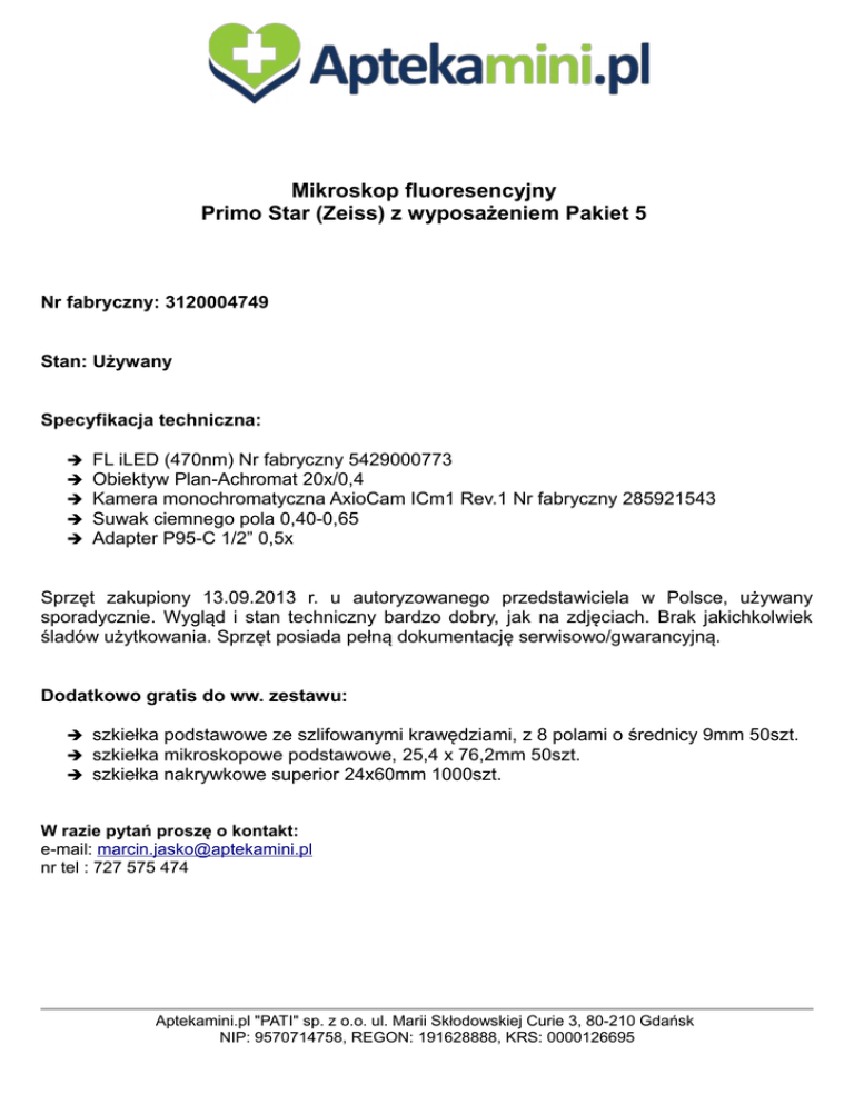 Mikroskop fluoresencyjny Primo Star (Zeiss) z wyposażeniem Pakiet 5 Nr fabryczny: 3120004749 Stan: Używany Specyfikacja techniczna: ➔ ➔ ➔ ➔ ➔ FL iLED (470nm) Nr fabryczny 5429000773 Obiektyw Plan-Achromat 20x/0,4 Kamera monochromatyczna AxioCam ICm1 Rev.1 Nr fabryczny 285921543 Suwak ciemnego pola 0,40-0,65 Adapter P95-C 1/2” 0,5x Sprzęt zakupiony 13.09.2013 r. u autoryzowanego przedstawiciela w Polsce, używany sporadycznie. Wygląd i stan techniczny bardzo dobry, jak na zdjęciach. Brak jakichkolwiek śladów użytkowania. Sprzęt posiada pełną dokumentację serwisowo/gwarancyjną. Dodatkowo gratis do ww. zestawu: ➔ szkiełka podstawowe ze szlifowanymi krawędziami, z 8 polami o średnicy 9mm 50szt. ➔ szkiełka mikroskopowe podstawowe, 25,4 x 76,2mm 50szt. ➔ szkiełka nakrywkowe superior 24x60mm 1000szt. W razie pytań proszę o kontakt: e-mail: [email protected] nr tel : 727 575 474 Aptekamini.pl "PATI" sp. z o.o. ul. Marii Skłodowskiej Curie 3, 80-210 Gdańsk NIP: 9570714758, REGON: 191628888, KRS: 0000126695 Aptekamini.pl "PATI" sp. z o.o. ul. Marii Skłodowskiej Curie 3, 80-210 Gdańsk NIP: 9570714758, REGON: 191628888, KRS: 0000126695 Aptekamini.pl "PATI" sp. z o.o. ul. Marii Skłodowskiej Curie 3, 80-210 Gdańsk NIP: 9570714758, REGON: 191628888, KRS: 0000126695 Aptekamini.pl "PATI" sp. z o.o. ul. Marii Skłodowskiej Curie 3, 80-210 Gdańsk NIP: 9570714758, REGON: 191628888, KRS: 0000126695 Aptekamini.pl "PATI" sp. z o.o. ul. Marii Skłodowskiej Curie 3, 80-210 Gdańsk NIP: 9570714758, REGON: 191628888, KRS: 0000126695 Aptekamini.pl "PATI" sp. z o.o. ul. Marii Skłodowskiej Curie 3, 80-210 Gdańsk NIP: 9570714758, REGON: 191628888, KRS: 0000126695 Aptekamini.pl "PATI" sp. z o.o. ul. Marii Skłodowskiej Curie 3, 80-210 Gdańsk NIP: 9570714758, REGON: 191628888, KRS: 0000126695 Aptekamini.pl "PATI" sp. z o.o. ul. Marii Skłodowskiej Curie 3, 80-210 Gdańsk NIP: 9570714758, REGON: 191628888, KRS: 0000126695 Aptekamini.pl "PATI" sp. z o.o. ul. Marii Skłodowskiej Curie 3, 80-210 Gdańsk NIP: 9570714758, REGON: 191628888, KRS: 0000126695