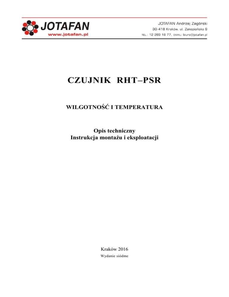 CZUJNIK RHT–PSR WILGOTNOŚĆ I TEMPERATURA Opis techniczny Instrukcja montażu i eksploatacji Kraków 2016 Wydanie siódme Instalacja elektryczna, do której jest dołączone urządzenie MUSI POSIADAĆ zgodne z aktual nymi przepisami, sprawne technicznie obwody ochrony przeciwporażeniowej. Musi posiadać także przynajmniej drugi stopień ochrony przeciwprzepięciowej. Urządzenie jest przeznaczone do pracy ciągłej i nie posiada wyłącznika zasilania. Jeżeli zachodzi potrzeba wyłączania urządzenia, należy zainstalować wyłącznik zewnętrzny. UWAGA !!! Wszelkie prace związanie z montażem i uruchomieniem urządzenia powinna wykonywać osoba posiadająca odpowiednie kwalifikacje i uprawnienia. Jakiekolwiek elektryczne czynności łączeniowe oraz prace mechaniczne (elektromechaniczne) przy urządzeniu Z DOŁĄCZONYM ZASILANIEM SĄ NIEDOPUSZCZALNE. GROŻĄ PORAŻENIEM PRĄDEM ELEKTRYCZNYM – ZAGROŻENIEM ZDROWIA LUB ŻYCIA Przed przystąpieniem do prac wyłączyć napięcie zasilania, wykonać widoczną przerwę w obwodzie elektrycznym zasilania urządzenia i upewnić się o braku napięcia. Instalacja elektryczna, do której jest dołączone urządzenie wymaga okresowych przeglądów i badań! UWAGA! Wskazuje na możliwość zagrożenia życia lub uszkodzenie urządzenia. Przed przystąpieniem do pracy należy zapoznać się z instrukcją. WAŻNE! Wskazują na ważną lub pożyteczną informację. Regulator jest urządzeniem elektronicznym, którego zadaniem jest wspomagać proces sterowania mikroklimatem w pomieszczeniu - jego zastosowanie i praca nie zapewniają stuprocentowego zabezpieczenia właściwego mikroklimatu w pomieszczeniu. Dlatego w celu zapewnienia maksimum bezpieczeństwa, szczególnie przy hodowli zwierząt należy niezależnie od regulatora i odpowiednio często kontrolować stan pomieszczenia (zasilanie, praca urządzeń wykonawczych, mikroklimat i inne parametry). OZNAKOWANIE WEEE Zużytego sprzętu elektrycznego i elektronicznego nie wolno wyrzucać razem ze zwykłymi odpadami. Według dyrektywy WEEE (Dyrektywy 2002/96/EC) obowiązującej w UE dla uży wanego sprzętu elektrycznego i elektronicznego należy stosować oddzielne sposoby utylizacji. W Polsce zgodnie z przepisami ustawy z dnia 1 lipca 2005r. o zużytym sprzęcie elektrycznym i elektronicznym zabronione jest umieszczanie łącznie z innymi odpadami sprzętu oznakowanego symbolem przekreślonego kosza. Użytkownik, który zamierza się pozbyć tego produktu, jest obowiązany do oddania ww. do punktu zbierania zużytego sprzętu. Punkty zbierania prowadzone są m.in. przez sprzedawców hurtowych i detalicznych tego sprzętu oraz gminne jednostki organizacyjne prowadzące działalność w zakresie odbierania odpadów. Prawidłowa realizacja tych obowiązków ma znaczenie zwłaszcza w przypadku, gdy w zużytym sprzęcie znajdują się składniki niebezpieczne, które mają negatywny wpływ na środowisko i zdrowie ludzi. Spis treści 1. OPIS OGÓLNY ......................................................................................................4 2. DANE TECHNICZNE I WYMAGANIA SPRZĘTOWE ..................................4 3. MONTAŻ I DOŁĄCZENIE CZUJNIKA DO SIECI KOMUNIKACYJNEJ ..5 4. USTAWIANIE ADRESU CZUJNIKA .................................................................6 Czujnik RHT–PSR 1. Opis ogólny Czujnik RHT–PSR jest urządzeniem do pomiaru temperatury i wilgotności względnej powietrza metodą psychrometryczną. Urządzenie jest przystosowane do komunikacji w sieci RS485 z protokołem umożliwiającym połączenie do 32 czujników. Wyboru adresu czujnika (jednego z 64 adresów ustawianych sześcioma mikroprzełącznikami) dokonuje się za pomocą mikroprzełączników umieszczonych wewnątrz obudowy czujnika. Wybór ustawień w każdym przypadku jest ściśle związany z architekturą zestawianego systemu pomiarowego i stanowi każdorazowo przedmiot właściwej dokumentacji systemu. Informacja o mierzonej temperaturze i wilgotności jest przesyłana do urządzenia nadrzędnego (rejestrator, komputer PC, itp.). Czujniki temperatury wyprowadzone są na zewnątrz obudowy przez przepusty. Stopień szczelności czujnika wynosi IP 55. Czujnik jest zasilany napięciem stałym 12 V. Wymaga się, aby zasilanie było dostarczane tym samym kablem, co sygnały magistrali RS485 (kabel co najmniej czterożyłowy, np. podwójna „skrętka” w ekranie). 2. Dane techniczne i wymagania sprzętowe Napięcie zasilania (mierzone na zaciskach czujnika) Pobór prądu Zakres temperatur pracy Wilgotność względna otoczenia Dokładność pomiaru temperatury 12 VDC 30% max. 16 mA 0 65 °C 40 100 % 0.5 °C (w zakresie 5 ÷ 40 °C) Dokładność pomiaru wilgotności względnej 2% (w zakresie 50 ÷ 98 %) Stopień szczelności obudowy (z wyj. obudowy przetwornika) Wymiary obudowy (szer. x wys. x grub.) Całkowita wysokość Przewód do sieci komunikacyjnej 4 IP 55 120 x 80 x 55 mm ok. 270 mm 4 x min. 0.14mm2 w ekranie JOTAFAN Czujnik Wilgotności i Temperatury JOTAFAN – RHT–PSR 3. Montaż i dołączenie czujnika do sieci komunikacyjnej Czujnik jest zabudowany w obudowie elektrotechnicznej z tworzywa sztucznego do zawieszenia lub mocowania naściennego na płaszczyźnie pionowej. Wprowadzić ekranowany przewód czterożyłowy o przekroju żył od 4x0,12mm2 do 4x0,75mm2 (dla zasilania czujnika i wyprowadzenia sygnałów NET- i NET+) poprzez przepust kablowy we wtyku hermetycznym i wykonać połączenia elektryczne zgodnie z zamieszczonym rysunkiem (rys.1) oraz opisem. Połączyć wtyk hermetyczny z gniazdem tak, aby zachować szczelność. Po rozłączeniu wtyku i gniazda czujnika zabezpieczyć je stosownymi nakrętkami ochronnymi Numer zacisku 0V NET– +12V NET+ 1 2 3 Opis +12V (czerwony) NET+ (zielony) NET– (biały) GND (niebieski + EKRAN) Rysunek 1 Rozmieszczenie zacisków w gnieździe przyłączeniowym Aby zamocować czujnik na ścianie (płaszczyźnie) należy: Otworzyć pokrywę obudowy