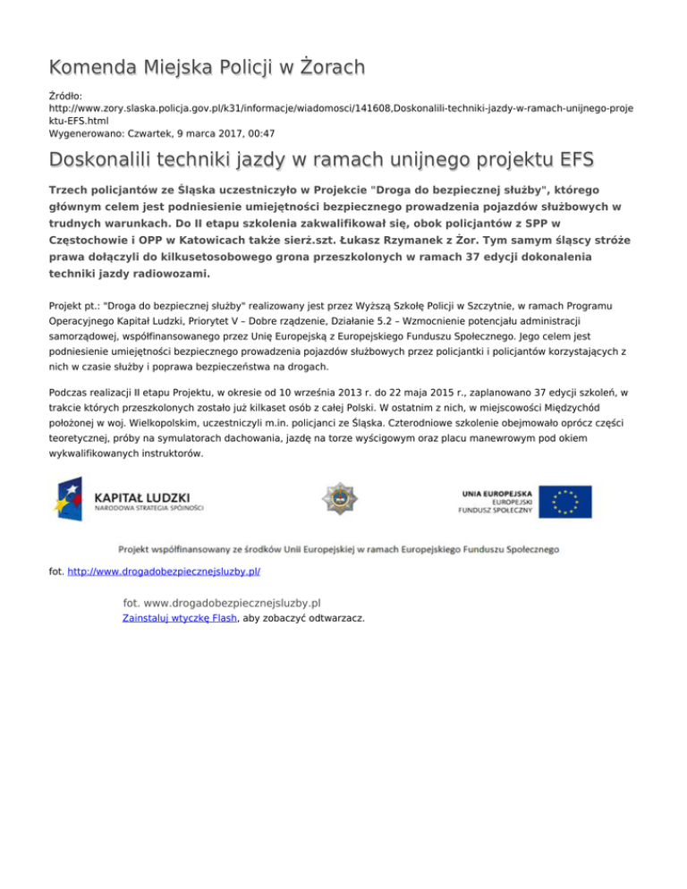 Komenda Miejska Policji w Żorach Źródło: http://www.zory.slaska.policja.gov.pl/k31/informacje/wiadomosci/141608,Doskonalili-techniki-jazdy-w-ramach-unijnego-proje ktu-EFS.html Wygenerowano: Czwartek, 9 marca 2017, 00:47 Doskonalili techniki jazdy w ramach unijnego projektu EFS Trzech policjantów ze Śląska uczestniczyło w Projekcie "Droga do bezpiecznej służby", którego głównym celem jest podniesienie umiejętności bezpiecznego prowadzenia pojazdów służbowych w trudnych warunkach. Do II etapu szkolenia zakwalifikował się, obok policjantów z SPP w Częstochowie i OPP w Katowicach także sierż.szt. Łukasz Rzymanek z Żor. Tym samym śląscy stróże prawa dołączyli do kilkusetosobowego grona przeszkolonych w ramach 37 edycji dokonalenia techniki jazdy radiowozami. Projekt pt.: "Droga do bezpiecznej służby" realizowany jest przez Wyższą Szkołę Policji w Szczytnie, w ramach Programu Operacyjnego Kapitał Ludzki, Priorytet V – Dobre rządzenie, Działanie 5.2 – Wzmocnienie potencjału administracji samorządowej, współfinansowanego przez Unię Europejską z Europejskiego Funduszu Społecznego. Jego celem jest podniesienie umiejętności bezpiecznego prowadzenia pojazdów służbowych przez policjantki i policjantów korzystających z nich w czasie służby i poprawa bezpieczeństwa na drogach. Podczas realizacji II etapu Projektu, w okresie od 10 września 2013 r. do 22 maja 2015 r., zaplanowano 37 edycji szkoleń, w trakcie których przeszkolonych zostało już kilkaset osób z całej Polski. W ostatnim z nich, w miejscowości Międzychód położonej w woj. Wielkopolskim, uczestniczyli m.in. policjanci ze Śląska. Czterodniowe szkolenie obejmowało oprócz części teoretycznej, próby na symulatorach dachowania, jazdę na torze wyścigowym oraz placu manewrowym pod okiem wykwalifikowanych instruktorów. fot. http://www.drogadobezpiecznejsluzby.pl/ fot. www.drogadobezpiecznejsluzby.pl Zainstaluj wtyczkę Flash, aby zobaczyć odtwarzacz. pobierz film - 17.39 MB Ocena: 5/5 (1) Tweetnij