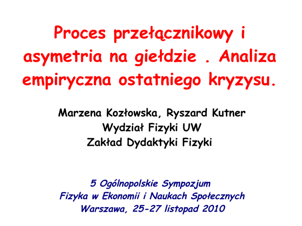 Proces przełącznikowy i asymetria na giełdzie . Analiza empiryczna ostatniego kryzysu. Marzena Kozłowska, Ryszard Kutner Wydział Fizyki UW Zakład Dydaktyki Fizyki 5 Ogólnopolskie Sympozjum Fizyka w Ekonomii i Naukach Społecznych Warszawa, 25-27 listopad 2010 Plan prezentacji: 1. Reologiczny Model Fraktalnej Dynamiki Rynku Finansowego- uzyskanie trendu opisującego dynamikę zboczy dobrze ukształtowanych maksimów wybranych indeksów giełdowych. 2. Proces przełącznikowy- analiza empirycznej wariancji szumu. 3. Asymetria na giełdzie- badanie empirycznego rozkładu skumulowanego. 5. Wnioski i zamierzenia. WIG: 06.02.2004 - 18.05.2009 06.07.2007 L=0,57 , P =1,56 Reologiczny Model Fraktalnej Dynamiki Rynku Finansowego Założenia modelu: W obszarach narastających i pękających spekulacyjnych bąbli giełdowych, dominującą rolę odgrywają gracze giełdowi bazujący na analizie technicznej (a nie fundamentalnej). Zależność chwilowej nadwyżki zleceń U(t) od chwilowej, względnej wielkości danego indeksu X(t) i chwilowego, względnego wolumenu obrotów V(t) na nim jest biliniowa: U t =a o X t b o V t U t = D t− S t , V t =min [ D t , S t] D(t) - chwilowy popyt na akcje tworzące dany indeks, S(t) - chwilowa podaż, ao , bo - niezależne od czasu współczynniki. Zakładam również: V t t eX t t =c o V t d o X t Stąd w przybliżeniu: dV t dX t =C o V t D o X t E dt dt U t =a o X t b o V t Z obu równań (w ramkach) otrzymuję: U t o dU t dX t =G o o G e X t dt dt Szczególnym przypadkiem jest równanie powszechnie używane w ekonomii ( λ – głębokość rynku): dX t 1 = U t dt Uproszczona hipoteza rynku plastycznego Uproszczone równanie dynamiki indeksu giełdowego: dU t dX t U t o =G o o G e X t dt dt o =−1/C o G o=a o 1−B o E , B o =−bo / a o G e =a o 1B o D o /C o Podstawowe równanie reologiczne Standardowego Modelu Zenera Ciała Plastycznego: d t d t t o =G o o G e t dt dt Analogie między reologią i giełdą papierów wartościowych Hipoteza rynku plastycznego Fraktalne, całkowe, niejednorodne równanie relaksacji: − X y − X 0=−1 − 0 D y X y 1 − − 1 o 0 D y U y [U y −U 0] , Go Go 0, y=∣t−t c∣, 1 =0 G 0 / G e Rozwiązanie zagadnienia początkowego U 0 Zakładam: U y= [ expi − yexpi y ] 2 Rozwiązanie: X y≈ X 0 X 1 E gdzie: X 1= 1 1 G o o y − 1 − X 1 cos y cos y Funkcja Mittag-Lefflera: U 0 E y − ∞ =∑ n=0 n − y / 1 n WIG: 06.02.2004 - 18.05.2009 06.07.2007 L=0,57 , P =1,56 Lewe zbocze maksimum C dla indeksu WIG: 09.02.2004-06.07.2007 07.07.2006 27.03.2006 Lewe zbocze maksimum C dla indeksu WIG20: 09.02.2004-29.10.2007 07.07.2006 15.12.2005 Wolumen obrotu dla maksimum C indeksu WIG: 09.02.2004-18.05.2009 Lewe zbocze: Prawe zbocze: Wolumen obrotu dla maksimum C indeksu WIG20: 09.02.2004-22.06.2009 Lewe zbocze: Prawe zbocze: Stopa procentowa FED Prawe zbocze maksimum C dla indeksu WIG: 10.04.2007-18.05.2009 Prawe zbocze maksimum C dla indeksu WIG20: 29.10.2007-22.06.2009 Kurtozy dla prawych zboczy maksimum C dla indeksu WIG ( po lewej) i WIG20 ( po prawej) Asymetria na giełdzie Lewe zbocze ostatniego piku DJIA Prawe zbocze ostatniego piku WIG Prawe zbocze ostatniego piku DJIA Prawe zbocze ostatniego piku NASDAQ Wnioski: 1. Istnieje możliwość detrendowania danych giełdowych funkcją Mittag-Lefflera i badania szumu. 2. Analiza wariancji szumu wykazała istnienie procesu przełącznikowego na giełdzie. 3. Istnieje możliwość wykorzystania Modelu Rynku Plastycznego oraz trójstanowego modelu Isinga do zbadania asymetrii rozkładu szumu. Zamierzenia: 1. Zbadanie uniwersalnego skoku wariancji. 2. Analiza hipotezy o asymetrii rozkładu szumów dużych giełd i symetrii małych. Dziękuję za uwagę.