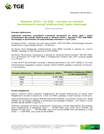 Warszawa, 05.09.2016 r. Sierpień 2016 r. na TGE – wzrosty na rynkach terminowych energii elektrycznej i gazu ziemnego Informacja prasowa Energia elektryczna Całkowity wolumen wszystkich transakcji zawartych na rynku spot i rynku terminowym dla energii elektrycznej w sierpniu 2016 r. wyniósł 9 437 406 MWh, wzrastając w porównaniu do poprzedniego miesiąca o 12,07 proc. W sierpniu 2016 r. wolumen na rynku spot wyniósł 1 955 575 MWh, przewyższając wolumen zeszłoroczny z tego samego okresu o 13,98 proc. Na Rynku Dnia Następnego średnioważona cena BASE wyniosła w sierpniu br. 142,31 zł/MWh, spadając w skali miesięcznej o 4,94 zł/MWh. Na Rynku Terminowym Towarowym w sierpniu br. wolumen obrotu wyniósł 7 481 831 MWh, co w porównaniu do 9 562 973 MWh w analogicznym okresie roku 2015 oznacza spadek o 21,76 proc. Z kolei na RTT dla kontraktu rocznego z dostawą pasmową w roku 2017 (BASE_Y-17) cena średnioważona osiągnęła w sierpniu wartość 158,93 zł/MWh (spadek w stosunku do lipca br. o 2,49 zł/MWh). Energia elektryczna Wolumen miesięczny (MWh) razem Wolumen miesięczny (MWh) w roku poprzednim 9 437 406 11 278 632 RDB 4 777 4 530 RDN 1 950 798 1 711 129 RTT 7 481 831 9 562 973 Prawa majątkowe Łączny wolumen obrotu prawami majątkowymi dla energii elektrycznej na Rynku Praw Majątkowych wyniósł w sierpniu br. 2 915 121 MWh, spadając w skali rocznej o 10,05 proc. Cena średnioważona na sesjach RPM dla instrumentu PMOZE_A wyniosła w sierpniu br. 48,08 zł/MWh, po raz kolejny spadając w porównaniu do ubiegłego miesiąca – tym razem o 12,91 zł/MWh (60,99 zł/MWh w lipcu br.). Wolumen transakcji na Rynku Terminowym Towarowym wyniósł odpowiednio dla dostawy praw majątkowych w listopadzie 2016 r. – 30 000 MWh, przy cenie 42,47 zł/MWh, dla dostawy w maju 2017 r. – 56 000 MWh, przy cenie 45,28 zł/MWh oraz dla dostawy w maju 2018 r. – 1 000 MWh, przy cenie 42,00 zł/MWh. Towarowa Giełda Energii S.A. zarejestrowana przez Sąd Rejonowy dla m. st. Warszawy w Warszawie, pod numerem KRS 0000030144, NIP 527-22-66-714. Kapitał zakładowy w wysokości 14.500.000 złotych – w całości opłacony ul. Poleczki 23 bud. H, 02-822 Warszawa T: (+48) 22 341 99 12, F: (+48) 22 341 99 10 E: [email protected] Prawa Majątkowe dla energii elektrycznej razem Wolumen miesięczny (MWh) Wolumen miesięczny (MWh) w roku poprzednim 2 915 121 3 240 870 zielone certyfikaty 1 773 948 1 205 070 obrót sesyjny RPM 535 240 433 307 obrót pozasesyjny RPM 1 238 708 771 763 150 894 737 632 obrót sesyjny RPM 42 071 57 282 obrót pozasesyjny RPM 108 823 680 349 żółte certyfikaty czerwone certyfikaty 981 409 1 280 882 obrót sesyjny RPM 142 059 715 181 obrót pozasesyjny RPM 839 350 565 701 fioletowe certyfikaty 8 871 17 285 obrót sesyjny RPM 8 871 9 691 obrót pozasesyjny RPM 0 7 594 Praw Majątkowe dla efektywności energetycznej razem (białe Wolumen miesięczny (toe) certyfikaty) obrót sesyjny RPM obrót pozasesyjny RPM Wolumen miesięczny (toe) w roku poprzednim 33 546 4 566 33 546 0 3 294 1 272 Gaz ziemny Całkowity wolumen wszystkich transakcji zawartych w sierpniu 2016 r. na rynkach gazu ziemnego wyniósł 7 585 295 MWh. Wolumen obrotów na rynku spot gazu ziemnego wyniósł w sierpniu br. 924 560 MWh, wzrastając w skali rocznej o 96,96 proc. Na Rynku Dnia Następnego gazu wolumen obrotu wyniósł 677 256 MWh, wzrastając w skali rocznej o 76,36 proc. Na Rynku Dnia Bieżącego wolumen obrotu osiągnął wartość 247 304 MWh, prawie trzykrotnie przewyższając wolumen zeszłoroczny z tego samego okresu. Na Rynku Terminowym Towarowym obroty ukształtowały się na poziomie 6 660 735 MWh, spadając w porównaniu do sierpnia ubiegłego roku o 8,94 proc. Średnioważona cena na RDNiBg w sierpniu 2016 r. wyniosła 60,77 zł/MWh (spadek w stosunku do lipca br. o 6,86 zł). Z kolei na RTT dla kontraktu rocznego z dostawą w roku 2017 (GAS_BASE_Y-17) w sierpniu 2016 r. cena średnioważona osiągnęła wartość 73,61 zł/MWh (spadek w stosunku do lipca br. o 4,88 zł/MWh). Towarowa Giełda Energii S.A. zarejestrowana przez Sąd Rejonowy dla m. st. Warszawy w Warszawie, pod numerem KRS 0000030144, NIP 527-22-66-714. Kapitał zakładowy w wysokości 14.500.000 złotych – w całości opłacony ul. Poleczki 23 bud. H, 02-822 Warszawa T: (+48) 22 341 99 12, F: (+48) 22 341 99 10 E: [email protected] Gaz ziemny Wolumen miesięczny (MWh) Wolumen miesięczny (MWh) w roku poprzednim 7 585 295 7 784 144 RDBg 247 304 85 395 RDNg 677 256 384 024 RTTg 6 660 735 7 314 725 razem Rejestr Gwarancji Pochodzenia W sierpniu br. w Rejestrze Gwarancji Pochodzenia zawarto transakcje o wolumenie 70 553 MWh, dla których średnia cena ważona wolumenem wyniosła 0,48 zł/MWh. Gwarancje Pochodzenia energii elektrycznej Wolumen miesięczny (MWh) Wolumen miesięczny (MWh) w roku poprzednim 70 553 0 Nowi uczestnicy Obecnie status członka Rynku Towarów Giełdowych (RTG) ma 67 spółek. W Rejestrze Świadectw Pochodzenia prowadzonym przez Towarową Giełdę Energii znajduje się obecnie 2808 członków rejestru. W sierpniu 2016 r. przybyło 23 kolejnych. *** Fakty o TGE: 16 lat na rynku, jedyna licencjonowana giełda towarowa w Polsce (licencja od 2003 r.) Silny i stabilny właściciel – Giełda Papierów Wartościowych (od lutego 2012 r.) Członek europejskiego rynku Multi-Regional Coupling (MRC) oraz inicjatywy Price Coupling of Regions (PCR) Nominowany Operator Rynku Energii (NEMO) wyznaczony przez Prezesa URE TGE gwarantuje pewność i bezpieczeństwo transakcji na wszystkich prowadzonych rynkach: o Rynek Towarów Giełdowych – energia elektryczna, gaz ziemny, prawa majątkowe, uprawnienia do emisji CO2 o Rynek Instrumentów Finansowych – energia elektryczna o Rejestr Świadectw Pochodzenia dla energii elektrycznej wyprodukowanej w odnawialnych źródłach energii o Rejestr Gwarancji Pochodzenia Aktywny członek międzynarodowych organizacji: o EUROPEX - Europejskiego Stowarzyszenia Giełd E
