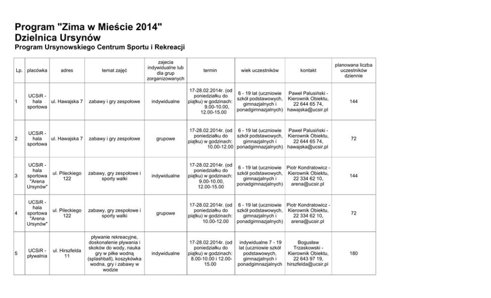 Program "Zima w Mieście 2014" Dzielnica Ursynów Program Ursynowskiego Centrum Sportu i Rekreacji Lp. placówka adres temat zajęć 1 UCSiR hala ul. Hawajska 7 sportowa 2 UCSiR hala ul. Hawajska 7 sportowa 3 UCSiR hala sportowa "Arena Ursynów" ul. Pileckiego 122 zabawy, gry zespołowe i sporty walki 4 UCSiR hala sportowa "Arena Ursynów" ul. Pileckiego 122 zabawy, gry zespołowe i sporty walki ul. Hirszfelda 11 pływanie rekreacyjne, doskonalenie pływania i skoków do wody, nauka gry w piłke wodną (splashball), koszykówka wodna, gry i zabawy w wodzie 5 UCSiR pływalnia zabawy i gry zespołowe zabawy i gry zespołowe zajecia indywidualne lub dla grup zorganizowanych termin wiek uczestników kontakt planowana liczba uczestników dziennie indywidualne 17-28.02.2014r. (od 6 - 19 lat (uczniowie Paweł Palusiński poniedziałku do szkół podstawowych, Kierownik Obiektu, piątku) w godzinach: gimnazjalnych i 22 644 65 74, 9.00-10.00, ponadgimnazjalnych) [email protected] 12.00-15.00 144 grupowe 17-28.02.2014r. (od 6 - 19 lat (uczniowie Paweł Palusiński poniedziałku do szkół podstawowych, Kierownik Obiektu, piątku) w godzinach: gimnazjalnych i 22 644 65 74, 10.00-12.00 ponadgimnazjalnych) [email protected] 72 indywidualne 17-28.02.2014r. (od 6 - 19 lat (uczniowie Piotr Kondratowicz poniedziałku do szkół podstawowych, Kierownik Obiektu, piątku) w godzinach: gimnazjalnych i 22 334 62 10, 9.00-10.00, ponadgimnazjalnych) [email protected] 12.00-15.00 144 grupowe 17-28.02.2014r. (od 6 - 19 lat (uczniowie Piotr Kondratowicz poniedziałku do szkół podstawowych, Kierownik Obiektu, piątku) w godzinach: gimnazjalnych i 22 334 62 10, 10.00-12.00 ponadgimnazjalnych) [email protected] 72 17-28.02.2014r. (od poniedziałku do piątku) w godzinach: 8.00-10.00 i 12.0015.00 180 indywidualne indywidualne 7 - 19 lat (uczniowie szkół podstawowych, gimnazjalnych i ponadgimnazjalnych Bogusław Trzaskowski Kierownik Obiektu, 22 643 97 19, [email protected] ul. Hirszfelda 11 pływanie rekreacyjne, doskonalenie pływania i skoków do wody, nauka gry w piłke wodną (splashball), koszykówka wodna, gry i zabawy w wodzie 6 UCSiR pływalnia 7 pływanie rekreacyjne, doskonalenie pływania i skoków do wody, nauka UCSiR - ul. Koncertowa gry w piłke wodną pływalnia 4 (splashball), koszykówka wodna, gry i zabawy w wodzie 8 pływanie rekreacyjne, doskonalenie pływania i skoków do wody, nauka UCSiR - ul. Koncertowa gry w piłke wodną pływalnia 4 (splashball), koszykówka wodna, gry i zabawy w wodzie UCSiR pływalnia pływanie rekreacyjne, doskonalenie pływania i skoków do wody, nauka ul. Wilczy Dół gry w piłke wodną 4 (splashball), koszykówka wodna, gry i zabawy w wodzie 10 UCSiR pływalnia pływanie rekreacyjne, doskonalenie pływania i skoków do wody, nauka ul. Wilczy Dół gry w piłke wodną 4 (Splashball), koszykówka wodna, gry i zabawy w wodzie 11 UCSiR siłownia ul. Wilczy Dół 4 9 ćwiczenia siłowe Bogusław Trzaskowski Kierownik Obiektu, 22 643 97 19, [email protected] grupowe 17-28.02.2014r. (od poniedziałku do piątku) w godzinach: 10.00-12.00 indywidualne 17-28.02.2014r. (od poniedziałku do piątku) w godzinach: 8.00-10.00 i 12.0015.00 Monika indywidualne 7 - 19 Widermańska lat (uczniowie szkół Kierownik Obiektu, podstawowych, 22 664 48 82, gimnazjalnych i [email protected] ponadgimnazjalnych l 180 grupowe 17-28.02.2014r. (od poniedziałku do piątku) w godzinach: 10.00-12.00 Monika Widermańska Kierownik Obiektu, 22 664 48 82, [email protected] l 60 indywidualne 17-28.02.2014r. (od 7 - 19 lat (uczniowie Mariusz Kowalski poniedziałku do szkół podstawowych, Kierownik Obiektu, piątku) w godz. 8.00gimnazjalnych i 22 648 54 71, 10.00 i 12.00-15.00 ponadgimnazjalnych) [email protected] 240 grupowe 17-28.02.2014r. (od 7 - 19 lat (uczniowie Mariusz Kowalski poniedziałku do szkół podstawowych, Kierownik Obiektu, piątku) w godz. gimnazjalnych i 22 648 54 71, 10.00-12.00 ponadgimnazjalnych) [email protected] 84 indywidualne 17-28.02.2014r. (od 16 - 19 lat Agnieszka Chrobak, poniedziałku do ( uczniowie szkół 22 334 62 52, piątku) w godz. ponadgimnazjalnych) [email protected] 12.00 - 15.00 30 Grupy dzieci z placówek "Zima w Mieście" Grupy dzieci z placówek "Zima w Mieście" 60 12 "Arena Active Club" kręgielnia ul. Pileckiego 122 13 "Arena Active Club" siłownia ul. Pileckiego 122 gra w kręgle ćwiczenia siłowe indywidualne Wiesław 17-28.02.2014r. (od 7 - 19 lat (uczniowie Krzemiński, 22 334 poniedziałku do szkół podstawowych, 62 32, piątku) w godz. gimnazjalnych i w.krzeminski@ucsir. 13.00 - 15.00 ponadgimnazjalnych) pl 64 indywidualne 17-28.02.2014r. (od 16 - 19 lat Agnieszka Chrobak, poniedziałku do ( uczniowie szkół 22 334 62 52, piątku) w godz. ponadgimnazjalnych) [email protected] 12.00 - 15.00, 30 UWAGA - w zajęciach grupowych mogą uczestniczyć tylko grupy wyposażone w identyfikatory przekazane przez koordynatorów "Zimy w Mieście"