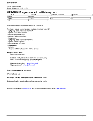 OPTGROUP Dodał Administrator środa, 06 styczeń 2010 14:29 OPTGROUP - grupa opcji na liście wyboru HTML Opera 4.x-5 7.0 XHTML Chrome 1.0-1.1 2 Internet Explorer 6.0 Firefox 1.0 Polecenie grupuje opcje na liście wyboru formularza. Przykład: <select name="owoce" multiple="multiple" size="8"> <optgroup label="Owoce miękkie"> <option>Truskawki</option> <option>Maliny</option> <option>Poziomki</option> </optgroup> <optgroup label="Owoce twarde"> <option>Jabłka</option> <option>Gruszki</option> </optgroup> </select> Truskawki Maliny Poziomki Jabłka Gruszki Atrybuty grupy opcji: - Specyficzne atrybuty - disabled - wyłącza działanie elementu (niewymagany) - label - określa nazwę grupy opcji (wymagany) - Atrybuty standardowe - więcej informacji - Atrybuty zdarzeń - więcej informacji Znacznik zamykający: wymagany Wyświetlanie: n.d. Może być zawarty wewnątrz innych elementów: select Może zawierać w swoim obrębie inne elementy: option Więcej o formularzach: Formularze Porównawcza tabela znaczników - Więcej… 1/1