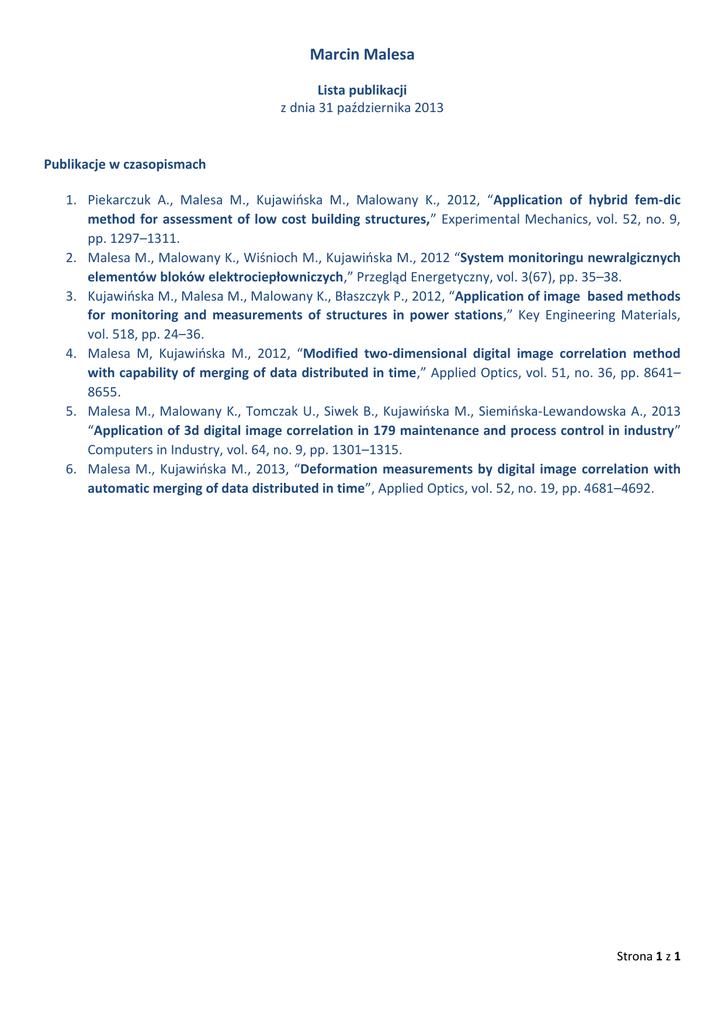 Marcin Malesa Lista publikacji z dnia 31 października 2013 Publikacje w czasopismach 1. Piekarczuk A., Malesa M., Kujawińska M., Malowany K., 2012, “Application of hybrid fem-dic method for assessment of low cost building structures,” Experimental Mechanics, vol. 52, no. 9, pp. 1297–1311. 2. Malesa M., Malowany K., Wiśnioch M., Kujawińska M., 2012 “System monitoringu newralgicznych elementów bloków elektrociepłowniczych,” Przegląd Energetyczny, vol. 3(67), pp. 35–38. 3. Kujawińska M., Malesa M., Malowany K., Błaszczyk P., 2012, “Application of image based methods for monitoring and measurements of structures in power stations,” Key Engineering Materials, vol. 518, pp. 24–36. 4. Malesa M, Kujawińska M., 2012, “Modified two-dimensional digital image correlation method with capability of merging of data distributed in time,” Applied Optics, vol. 51, no. 36, pp. 8641– 8655. 5. Malesa M., Malowany K., Tomczak U., Siwek B., Kujawińska M., Siemińska-Lewandowska A., 2013 “Application of 3d digital image correlation in 179 maintenance and process control in industry” Computers in Industry, vol. 64, no. 9, pp. 1301–1315. 6. Malesa M., Kujawińska M., 2013, “Deformation measurements by digital image correlation with automatic merging of data distributed in time”, Applied Optics, vol. 52, no. 19, pp. 4681–4692. Strona 1 z 1