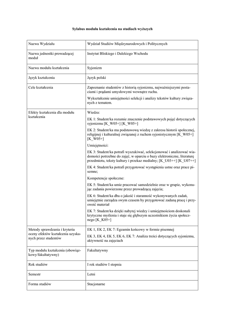 Sylabus modułu kształcenia na studiach wyższych Nazwa Wydziału Wydział Studiów Międzynarodowych i Politycznych Nazwa jednostki prowadzącej moduł Instytut Bliskiego i Dalekiego Wschodu Nazwa modułu kształcenia Syjonizm Język kształcenia Język polski Cele kształcenia Zapoznanie studentów z historią syjonizmu, najważniejszymi postaciami i prądami umysłowymi wewnątrz ruchu. Wykształcenie umiejętności selekcji i analizy tekstów kultury związanych z tematem. Efekty kształcenia dla modułu kształcenia Wiedza: EK 1: Student/ka rozumie znaczenie podstawowych pojęć dotyczących syjonizmu [K_W05+] [K_W05+] EK 2: Student/ka ma podstawową wiedzę z zakresu historii społecznej, religijnej i kulturalnej związanej z ruchem syjonistycznym [K_W05+] [K_W05+] Umiejętności: EK 3: Student/ka potrafi wyszukiwać, selekcjonować i analizować wiadomości potrzebne do zajęć, w oparciu o bazy elektroniczne, literaturę przedmiotu, teksty kultury i przekaz medialny; [K_U03++] [K_U07++] EK 4: Student/ka potrafi przygotować wystąpienia ustne oraz prace pisemne; Kompetencje społeczne: EK 5: Student/ka umie pracować samodzielnie oraz w grupie, wykonując zadania powierzone przez prowadzącą zajęcia; EK 6: Student/ka dba o jakość i staranność wykonywanych zadań, umiejętnie zarządza swym czasem by przygotować zadaną pracę i przyswoić materiał EK 7: Student/ka dzięki nabytej wiedzy i umiejętnościom doskonali krytyczne myślenia i staje się głębszym uczestnikiem życia społecznego [K_K05+] Metody sprawdzania i kryteria oceny efektów kształcenia uzyskanych przez studentów EK 1, EK 2, EK 7: Egzamin końcowy w formie pisemnej Typ modułu kształcenia (obowiązkowy/fakultatywny) Fakultatywny Rok studiów I rok studiów I stopnia Semestr Letni Forma studiów Stacjonarne EK 3, EK 4, EK 5, EK 6, EK 7: Analiza treści dotyczących syjonizmu, aktywność na zajęciach Imię i nazwisko koordynatora moMagdalena Kozłowska dułu i/lub osoby/osób prowadzących moduł Imię i nazwisko osoby/osób egzami- Nie dotyczy nującej/egzaminujących bądź udzielającej zaliczenia, w przypadku gdy nie jest to osoba prowadząca dany moduł Sposób realizacji Wykład Wymagania wstępne i dodatkowe Brak Rodzaj i liczba godzin zajęć dydaktycznych wymagających bezpośredniego udziału nauczyciela akademickiego i studentów, gdy w danym module przewidziane są takie zajęcia 30 godz. Liczba punktów ECTS przypisana modułowi 3 ECTS Bilans punktów ECTS Udział w zajęciach, 30 godz. Przygotowanie do zajęć: lektura artykułów, fragmentów monografii, 20 godz. Przygotowanie do egzaminu końcowego, 40 godz. Razem 90 godz. (3 ECTS) Stosowane metody dydaktyczne E-learning; Metody podające – objaśnienie lub wyjaśnienie; Metody podające – opis; Metody podające – prezentacja multimedialna; Metody podające – wykład informacyjny; Metody aktywizujące – wykład konwersatoryjny; Metody praktyczne – metoda projektów Forma i warunki zaliczenia modułu, Warunkiem zaliczenia kursu jest udział w zajęciach oraz złożenie egw tym zasady dopuszczenia do egzaminu końcowego zaminu, zaliczenia, a także forma i warunki zaliczenia poszczególnych zajęć wchodzących w zakres danego modułu Treści modułu kształcenia (z podziałem na formy realizacji zajęć) W trakcie kursu uczestnicy zapoznają się z materiałem źródłowym i krytycznym dotyczącym narodzin i rozwoju syjonizmu w jego różnych aspektach. Studenci poznają główne teksty kultury i założenia syjonizmu politycznego, socjalistycznego, kulturowego i religijnego. Wszystkie zagadnienia będą przedstawiane w odniesieniu do odpowiedniego kontekstu kulturowego i politycznego. Wybrane zagadnienia: Syjonizm czy syjonizmy - ideologia/e, projekt(y), ruch(y); kontekst europejski: Żydzi w Europie Środkowo-Wschodniej w XIX wieku; wcześni myśliciele syjonistyczni: antysemityzm i nacjonalizm żydowski; Theodor Herzl i pojawienie się syjonizmu politycznego; Ahad Ha'am: syjonizm jako projekt kulturowego przebudzenia; syjonizm socjalistyczny; syjonizm rewizjonistyczny; syjonizm i stosunek do arabskiej Palestyny; wizje radykalne: bi-nacjonalizm Brit Szalom i ruch Kananejczyków; syjonizm i płeć: męskość i kobiecość żydowska; syjonizm w sztukach plastycznych i architekturze; syjonizm chrześcijański; neosyjonizm: religijny ruch osadniczy po 1967; postsyjonizm - krytyczne podejście do syjonizmu w latach 90. XX w. i w późniejszej perspektywie Wykaz literatury podstawowej i uzupełniającej obowiązującej do zaliczenia danego modułu Literatura podstawowa: Avineri, S., The making of modern Zionism : intellectual origins of the Jewish state, New York: Basic Books 1981. Shimoni, G., The Zionist Ideology Hanover: Brandeis University Press 1997. Hertzberg, A., The Zionist idea : a historical analysis and reader, Philadelphia: Jewish Publication Society 1997. Laqueur, W., A History of Zionism 3rd ed., London: Tauris Parke 2003. Tomaszewski J., Chojnowski A., Izrael, Warszawa: TRIO 2001. materiały dostarczone przez prowadzącą zajęcia. Literatura dodatkowa: Ravitzky, A., Messianism, Zionism, and Jewish religious radicalism, Chicago: University of Chicago Press 1996. Campos, M., Ottoman Brothers: Muslims, Christians, and Jews in Early Twentieth-Century Palestine, Stanford University Press 2010. Goldman, S., Zeal for Zion: Christians, Jews, & the idea of the Promised Land, UNC Press Books 2009. Shafir, G., Land, labor, and the origins of the Israeli-Palestinian conflict, 1882-1914, Cambridge [England];;New York: Cambridge University Press 1989. Gorni, Y., Zionism and the Arabs 1882-1948: A Study of Ideology, Oxford: Clarendon 1987. Eyal, G., The disenchantment of the Orient: expertise in Arab affairs and the Israeli state, Stanford University Press 2006. Manor, D., Art in Zion: the genesis of modern national art in Jewish Palestine, Routledge 2005. Bernstein, D., Pioneers and homemakers: Jewish women in pre-state Isr