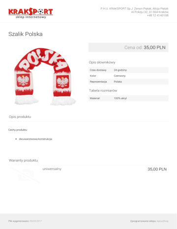 P.H.U. KRAKSPORT Sp.J. Zenon Piętak, Alicja Piętak Al.Pokoju 32, 31-564 Kraków +48 12 4140108 Szalik Polska Cena od: 35,00 PLN Opis słownikowy Czas dostawy 24 godziny Kolor Czerwony Reprezentacja Polska Tabela rozmiarów Materiał: 100% akryl Opis produktu Cechy produktu: dwuwarstwowa konstrukcja Warianty produktu uniwersalny Plik wygenerowano: 09-03-2017 Powered by TCPDF (www.tcpdf.org) 35,00 PLN Oprogramowanie sklepu: AptusShop