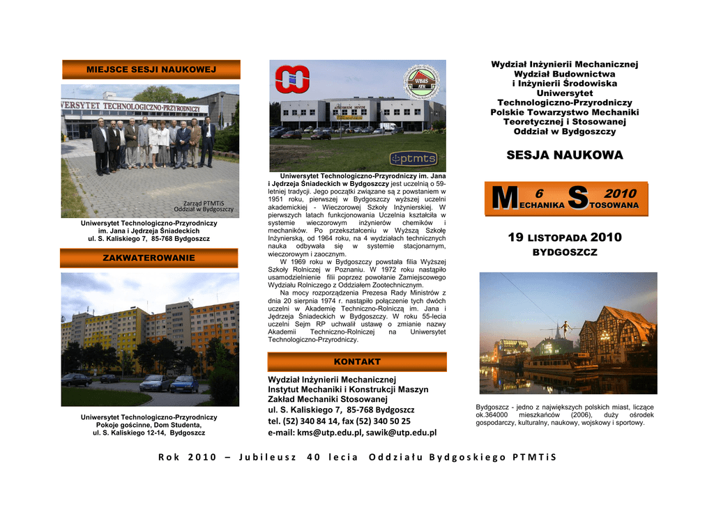 Wydział Inżynierii Mechanicznej Wydział Budownictwa i Inżynierii Środowiska Uniwersytet Technologiczno-Przyrodniczy Polskie Towarzystwo Mechaniki Teoretycznej i Stosowanej Oddział w Bydgoszczy MIEJSCE SESJI NAUKOWEJ SESJA NAUKOWA Zarząd PTMTiS Oddział w Bydgoszczy Uniwersytet Technologiczno-Przyrodniczy im. Jana i Jędrzeja Śniadeckich ul. S. Kaliskiego 7, 85-768 Bydgoszcz ZAKWATEROWANIE Uniwersytet Technologiczno-Przyrodniczy im. Jana i Jędrzeja Śniadeckich w Bydgoszczy jest uczelnią o 59letniej tradycji. Jego początki związane są z powstaniem w 1951 roku, pierwszej w Bydgoszczy wyższej uczelni akademickiej - Wieczorowej Szkoły Inżynierskiej. W pierwszych latach funkcjonowania Uczelnia kształciła w systemie wieczorowym inżynierów chemików i mechaników. Po przekształceniu w Wyższą Szkołę Inżynierską, od 1964 roku, na 4 wydziałach technicznych nauka odbywała się w systemie stacjonarnym, wieczorowym i zaocznym. W 1969 roku w Bydgoszczy powstała filia Wyższej Szkoły Rolniczej w Poznaniu. W 1972 roku nastąpiło usamodzielnienie filii poprzez powołanie Zamiejscowego Wydziału Rolniczego z Oddziałem Zootechnicznym. Na mocy rozporządzenia Prezesa Rady Ministrów z dnia 20 sierpnia 1974 r. nastąpiło połączenie tych dwóch uczelni w Akademię Techniczno-Rolniczą im. Jana i Jędrzeja Śniadeckich w Bydgoszczy. W roku 55-lecia uczelni Sejm RP uchwalił ustawę o zmianie nazwy Akademii Techniczno-Rolniczej na Uniwersytet Technologiczno-Przyrodniczy. M 6 ECHANIKA 19 S 2010 TOSOWANA LISTOPADA 2010 BYDGOSZCZ KONTAKT Uniwersytet Technologiczno-Przyrodniczy Pokoje gościnne, Dom Studenta, ul. S. Kaliskiego 12-14, Bydgoszcz Wydział Inżynierii Mechanicznej Instytut Mechaniki i Konstrukcji Maszyn Zakład Mechaniki Stosowanej ul. S. Kaliskiego 7, 85-768 Bydgoszcz tel. (52) 340 84 14, fax (52) 340 50 25 e-mail: [email protected], [email protected] Rok 2010 – Jubileusz 40 lecia Bydgoszcz - jedno z największych polskich miast, liczące ok.364000 mieszkańców (2006), duży ośrodek gospodarczy, kulturalny, naukowy, wojskowy i sportowy. Oddziału Bydgoskiego PTMTiS O SESJI NAUKOWEJ Potrzeba rozwoju techniki, a w szczególności mechaniki jako dziedziny naukowej o szerokich zastosowaniach praktycznych była i jest motorem obywającej się cyklicznie sesji naukowej „Mechanika Stosowana” organizowanej przez Wydział Inżynierii Mechanicznej, Wydział Budownictwa i Inżynierii Środowiska Uniwersytetu Technologiczno-Przyrodniczego w Bydgoszczy oraz Oddział bydgoski PTMTiS. Zagadnienia mechaniki stosowanej właściwie sformułowane, a następnie poprawnie rozwiązane są podstawą dobrze zaprojektowanych licznych urządzeń technicznych. Mechanika stosowana jest więc istotnym narzędziem w ogólnie pojętej działalności człowieka, w szczególności inżyniera mechanika. Obecnie jest to już szósta edycja organizowanej sesji naukowej „Mechanika Stosowana”. Do rąk uczestników Seminarium zostanie oddany zeszyt zawierający jednostronicowe streszczenia w językach polskim i angielskim. Decyzją komitetu Naukowego wybrane referaty złożone w formie artykułu będą opublikowane w monografii pt. Zagadnienia Mechaniki Stosowanej t.3 wydanej przez Wydawnictwo UTP, Bydgoszcz. TEMATYKA SESJI Mechanika budowli Mechanika gruntów Mechanika ciał sypkich Mechanika płynów Mechanika ustrojów okrętowych i lotniczych Mechanika pękania Mechanika ośrodków niejednorodnych Mechanika ośrodków porowatych Mechanika eksperymentalna Teoria mechanizmów i maszyn Wytrzymałość zmęczeniowa Biomechanika Metody numeryczne w mechanice REFERATY PLENARNE ZAMAWIANE Andrzej Tylikowski, Politechnika Warszawska, Zastosowanie nielokalnej teorii sprężystości do analizy dynamiki nanokompozytów Józef Szala, UTP, Bydgoszcz, Wybrane zagadnienia programowanych badań zmęczeniowych elementów konstrukcyjnych Mieczysław Cieszko, UKW, Bydgoszcz, Kontynualne modelowanie transportu kapilarnego w nienasyconych materiałach porowatych STRESZCZENIA REFERATÓW Streszczenie referatu należy przygotować w edytorze Word, czcionka Times New Roman. Ustawienia strony: margines górny – 5cm, dolny – 5 cm, lewy 4,25 cm, prawy 4,25 cm. Streszczenie nie może przekraczać dwóch stron. Pierwsza strona w języku polskim, druga jest jej dokładnym tłumaczeniem w języku angielskim. Rozmiar czcionki w tytule 12, pogrubiona, efekt wersaliki. Akapit wyśrodkowany, odstęp przed 12 pkt. Imiona i nazwiska autorów pisane czcionką o rozmiarze 10 pkt., pogrubione, z zamieszczonymi odnośnikami do adresu w postaci indeksu górnego. Akapit wyrównany do lewej, odstęp przed 12 pkt., odstęp miedzy wierszami pojedynczy. Adresy pisane czcionką o rozmiarze 9 pkt, kursywa, odstęp przed pierwszą linią adresu 3 pkt. Adres powinien się zmieścić w dwóch liniach, dane autora: nazwa instytucji, adres pocztowy, poczta elektroniczna. Słowo „Streszczenie” pisane tak jak nazwisko i imię. Tekst podstawowy pisany jest czcionką o rozmiarze 10 pkt., odstęp przed akapitem 3 pkt., brak wcięcia, wyrównany do lewej i prawej. Podpis pod rysunkiem. Rozmiar czcionki 9 pkt. Rysunki zakotwiczone do podpisu. Jeżeli podpis przekracza jedną linijkę należy zmienić wyrównanie z wyśrodkowanego na wyrównanie do lewej i prawej z wysunięciem pierwszego wiersza 1 cm. Akapit podpisu posiada odstępy przed jak i po o wartości 3 pkt. Streszczenie referatu prosimy przesłać pocztą elektroniczną do dnia 31.10.2010 r. Rok 2010 – Jubileusz 40 lecia KOMITET NAUKOWY J. Awrejcewicz Cz. Cempel M. Cieszko M. Delyavskyy J. Gołaś H. Holka J. Kołodziej J. Kubik J. Nizioł W.Ostachowicz A. Podhorecki J. Sempruch B. Siołkowski J. Szala Cz. Szymczak T. Topoliński A. Tylikowski K. Wernerowski A. Wilczyński B. Żółtowski KOMITET ORGANIZACYJNY J. Sawicki - przewodniczący M. Olejniczak – sekretarz J. Jackiewicz T. Jarzyna S. Mroziński J. Sadowski J. Żołnierczyk K. Łaz C.Sarbinowska OPŁATA ZA UDZIAŁ W SESJI 