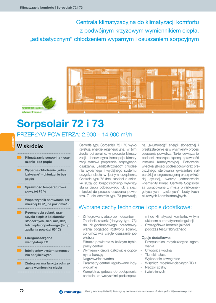 Klimatyzacja komfortu | Sorpsolair 72 i 73 Centrala klimatyzacyjna do klimatyzacji komfortu z podwójnym krzyżowym wymiennikiem ciepła, „adiabatycznym“ chłodzeniem wyparnym i osuszaniem sorpcyjnym Automatycznie wybiera optymalny tryb pracy! Sorpsolair 72 i 73 Sorpsolair Przepływ powietrza: 2.900 – 14.900 m3/h W skrócie: Klimatyzacja sorpcyjna - osuszanie bez prądu Wyparne chłodzenie „adiabatyczne“ - chłodzenie bez prądu Sprawność temperaturowa powyżej 75 % Współczynnik sprawności termicznej COPth na poziomie1,5 Regeneracja solanki przy użyciu ciepła z kolektorów słonecznych, sieci miejskiej lub ciepła odpadowego (temp. zasilania powyżej 65° C) Energooszczędne wentylatory EC Inteligentny system przepustnic obejściowych Zintegrowana funkcja odmrażania wymiennika ciepła 70 Centrale typu Sorpsolair 72 i 73 wykorzystują energię regeneracyjną, w tym źródła odnawialne, w procesie klimatyzacji. Innowacyjna koncepcja klimatyzacji stanowi połączenie sorpcyjnego osuszania, „adiabatycznego“ chłodzenia wyparnego i wydajnego systemu odzysku ciepła w jednym urządzeniu. Centrale typu 72 (bez zasobnika solanki) służą do bezpośredniego wykorzystania ciepła odpadowego lub z sieci miejskiej do procesu osuszania powietrza. Z kolei centrale typu 73 pozwalają na „akumulację” energii słonecznej i przekształcenie jej w wyśmienity proces osuszania powietrza. Takie rozwiązanie podnosi znacząco łączną sprawność instalacji klimatyzacyjnej. Połączenie wysokiej jakości podzespołów oraz precyzyjnego sterowania gwarantuje najbardziej energooszczędną pracę w każdej sytuacji, tworząc jednocześnie wyśmienity klimat. Centrale Sorpsolair są opracowane z myślą o niskoenergetycznych, „zielonych“ budynkach biurowych i administracyjnych. Wybrane cechy techniczne i opcje dodatkowe: - Zintegrowany absorber i desorber - Zasobnik solanki (dotyczy typu 73) do długookresowego przechowywania bogatego roztworu solanki, co umożliwia ciągłe osuszanie powietrza - Filtracja powietrza w każdym trybie pracy centrali -Wymiennik ciepła całkowicie odporny na korozję - Nagrzewnica wodna - Parametry centrali regulowane indywidualnie - Kompletna, gotowa do podłączenia centrala, ze wszystkimi podzespoła- mi do klimatyzacji komfortu, w tym układem automatycznej regulacji - Szczegółowa kontrola jakości podczas testu fabrycznego Opcje dodatkowe: - Przepustnica recyrkulacyjna ogrzewania - Chłodnica wodna -Tłumiki hałasu -Wykonanie zewnętrzne -Współcz. mostków cieplnych TB 1 - Nadzór zdalny - i wiele innych Katalog techniczny 03/2013 | Zastrzega się możliwość zmian technicznych. © Menerga GmbH | www.menerga.com Klimatyzacja komfortu | Sorpsolair 72 i 73 Opis funkcji zapewnia pokrycie strat wentylacyjnych i strat przez przegrody pomieszczeń. W razie potrzeby strumień powietrza może być zwiększony poprzez zastosowanie częściowej recyrkulacji (wyposażenie dodatkowe). Dzięki pracy w recyrkulacji centrala może posłużyć do rozgrzewania obsługiwanych pomieszczeń Pośrednie „adiabatyczne“ chłodzenie wyparne W centralach typu Adsolair wykorzystano zalety pośredniego „adiabatycznego“ chłodzenia wyparnego, unikając jednocześnie niekorzystnego nawilżania powietrza nawiewanego. Istotnym elementem rozwiązania Adsolair jest podwójny krzyżowy wymiennik ciepła, w których powietrze wywiewane chłodzone jest „adiabatyczne“. Po drugiej stronie wymiennika powietrze zewnętrz- ne odbiera chłód od schłodzonego nawilżonego powietrza wywiewanego. Wysoka efektywność procesu chłodzenia wynika z faktu, że obydwa procesy („adiabatyczne“ chłodzenie wyparne oraz schładzanie powietrza zewnętrznego) odbywają się w tym samym miejscu. Dzięki wysokiej sprawności odzysku ciepła, powietrze zewnętrzne może schłodzić się nawet o 12K. Free cooling Wraz z dalszym wzrostem temperatury zewnętrznej, przepustnice obejściowe otwierają się całkowicie i odzysk ciepła ustaje. Zastosowanie przepustnic obejściowych po obu stronach wymien- nika ciepła gwarantuje obniżenie oporów przepływu przez centralę, a co za tymidzie niskie zużycie energii elektrycznej przez wentylatory. Klimatyzacja sorpcyjna Klimatyzacja sorpcyjna odbywa się w dwóch krokach: osuszanie powietrza i chłodzenie powietrza. Osuszanie odbywa się dzięki kontaktowi powietrza nawiewanego z higroskopijną substancją (sorbent - stężony roztwór soli). Następnie osuszone powietrze przepływa przez podwójny krzyżowy wymiennik ciepła, gdzie jest silnie chłodzone w procesie pośredniego chłodzenia wyparnego. Rozcieńczony roztwór solanki podlega regeneracji przy wykorzystaniu ciepła. Źródłem ciepła do regeneracji może być ciepło z kolekto- rów słonecznych, ciepło z sieci miejskiej lub też ciepło odpadowe np. z ciepłowni lub procesów przemysłowych. Osuszanie powietrza i regeneracja solanki odbywają się w oddzielnych obiegach. W ten sposób ciepło może być nieograniczenie i bez strat akumulowane w ciekłym medium i wykorzystywane w czasie przerwy w dostawie ciepła. Klimatyzacja sorpcyjna umożliwia osuszanie i chłodzenie powietrza bez konieczności zastosowania sprężarkowego układu chłodniczego. Obniża się również szczytowy letni pobór energii elekrycznej. Tryb rozmrażania Z wysokim odzyskiem ciepła wiąże się konieczność zabezpieczenia wymiennika ciepła przed zamarzaniem. W trybie rozmrażania otwiera się bypass powietrza zewnętrznego, a strumień powietrza zewnętrznego płynący przez wymiennik jest chwilowo zredukowany. Wymiennik jest rozmrażany dzięki ciepłu pochodzącemu z powietrza zewnętrznego. Proces rozmrażania jest regulowany zmienną ilością powietrza zewnętrznego omijającego wymiennik. POW. USUW. WYWIEW POW. ZEWN. NAWIEW POW. USUW. WYWIEW POW. ZEWN. NAWIEW Sorpsolair Praca w zimie W okresie niskich temperatur zewnętrznych powietrze wywiewne przekazuje ciepło jawne i utajone do stru
