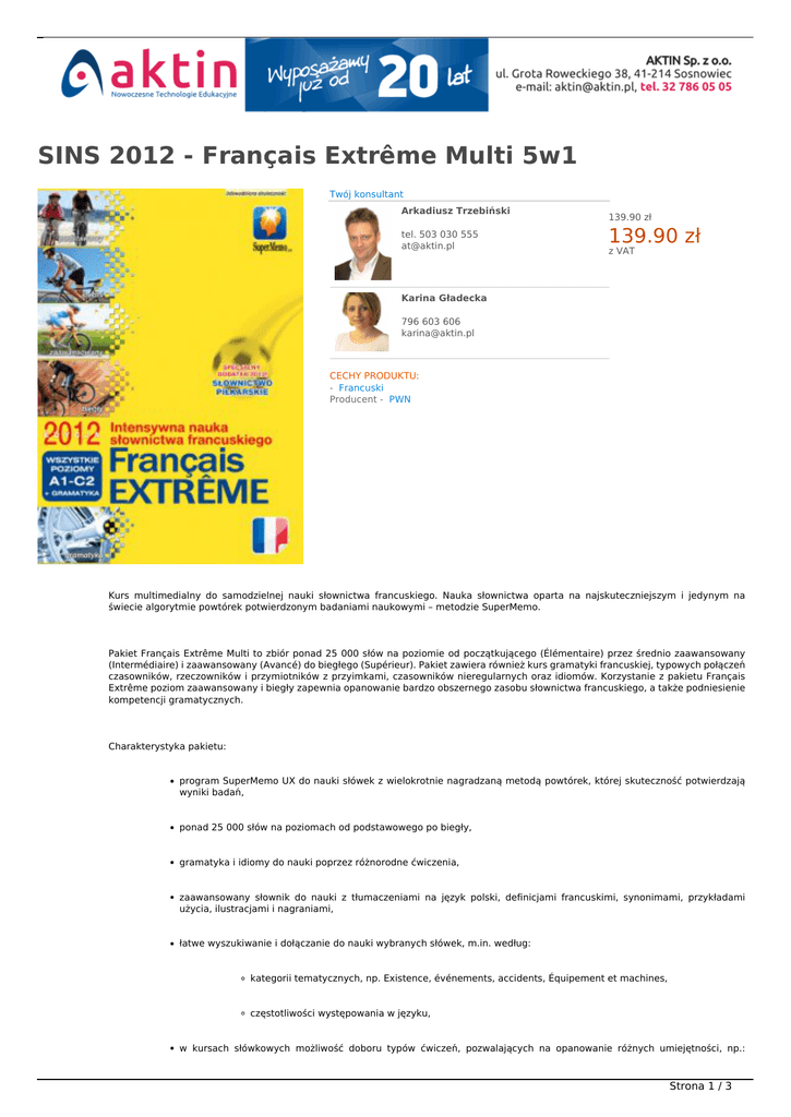 SINS 2012 - Français Extrême Multi 5w1 Twój konsultant Arkadiusz Trzebiński tel. 503 030 555 [email protected] NOWOŚĆ W OFERCIE 139.90 zł 139.90 zł z VAT Karina Gładecka 796 603 606 [email protected] CECHY PRODUKTU: - Francuski Producent - PWN Kurs multimedialny do samodzielnej nauki słownictwa francuskiego. Nauka słownictwa oparta na najskuteczniejszym i jedynym na świecie algorytmie powtórek potwierdzonym badaniami naukowymi – metodzie SuperMemo. Pakiet Français Extrême Multi to zbiór ponad 25 000 słów na poziomie od początkującego (Élémentaire) przez średnio zaawansowany (Intermédiaire) i zaawansowany (Avancé) do biegłego (Supérieur). Pakiet zawiera również kurs gramatyki francuskiej, typowych połączeń czasowników, rzeczowników i przymiotników z przyimkami, czasowników nieregularnych oraz idiomów. Korzystanie z pakietu Français Extrême poziom zaawansowany i biegły zapewnia opanowanie bardzo obszernego zasobu słownictwa francuskiego, a także podniesienie kompetencji gramatycznych. Charakterystyka pakietu: program SuperMemo UX do nauki słówek z wielokrotnie nagradzaną metodą powtórek, której skuteczność potwierdzają wyniki badań, ponad 25 000 słów na poziomach od podstawowego po biegły, gramatyka i idiomy do nauki poprzez różnorodne ćwiczenia, zaawansowany słownik do nauki z tłumaczeniami na język polski, definicjami francuskimi, synonimami, przykładami użycia, ilustracjami i nagraniami, łatwe wyszukiwanie i dołączanie do nauki wybranych słówek, m.in. według: kategorii tematycznych, np. Existence, événements, accidents, Équipement et machines, częstotliwości występowania w języku, w kursach słówkowych możliwość doboru typów ćwiczeń, pozwalających na opanowanie różnych umiejętności, np.: Strona 1 / 3 wykorzystania w wypowiedzi, poprawnej pisowni, rozumienia ze słuchu, możliwość doboru typów ćwiczeń, pozwalających na opanowanie różnych umiejętności, np.: wykorzystania w wypowiedzi, poprawnej pisowni, rozumienia ze słuchu, trener wymowy, który analizuje i ocenia akcent, intonację oraz inne ważne parametry wymowy, gratis – aplikacja na komórki, dzięki której słownik masz zawsze pod ręką, tłumaczenie z menu kontekstowego wszystkich wyrazów w kursie, synchronizacja nauki: możliwość nauki na komputerze lub na iPhonie, online lub offline, i przenoszenia swoich postępów pomiędzy tymi platformami, polecenia w języku polskim na poziomie podstawowym, polskie odpowiedniki szukanych słów na poziomie podstawowym, Nowości w edycji 2012: specjalny dodatek w postaci kursu słownictwa piłkarskiego, 300 słów, zdjęcia wszystkich haseł na poziomie podstawowym i średnim, nagrania i tłumaczenia dwóch zdań przykładowych na poziomie podstawowym, możliwość dodawania własnych notatek w kursach. W skład pakietu wchodzi 8 kursów: Élémentaire Intermédiaire Avancé Supérieur Grammaire française Verbe et prepositions Verbes irréguliers Expressions idiomatiques Wymagania systemowe: Windows® XP SP2 PL/EN, Windows Vista® PL/EN, Windows® 7 PL/EN Internet Explorer 7.0 lub nowszy 512 MB RAM napęd DVD-ROM karta dźwiękowa 4,9 GB miejsca na dysku Strona 2 / 3 kurs wymaga aktywacji, podczas której konieczne jest połączenie z Internetem. Strona 3 / 3 Powered by TCPDF (www.tcpdf.org)