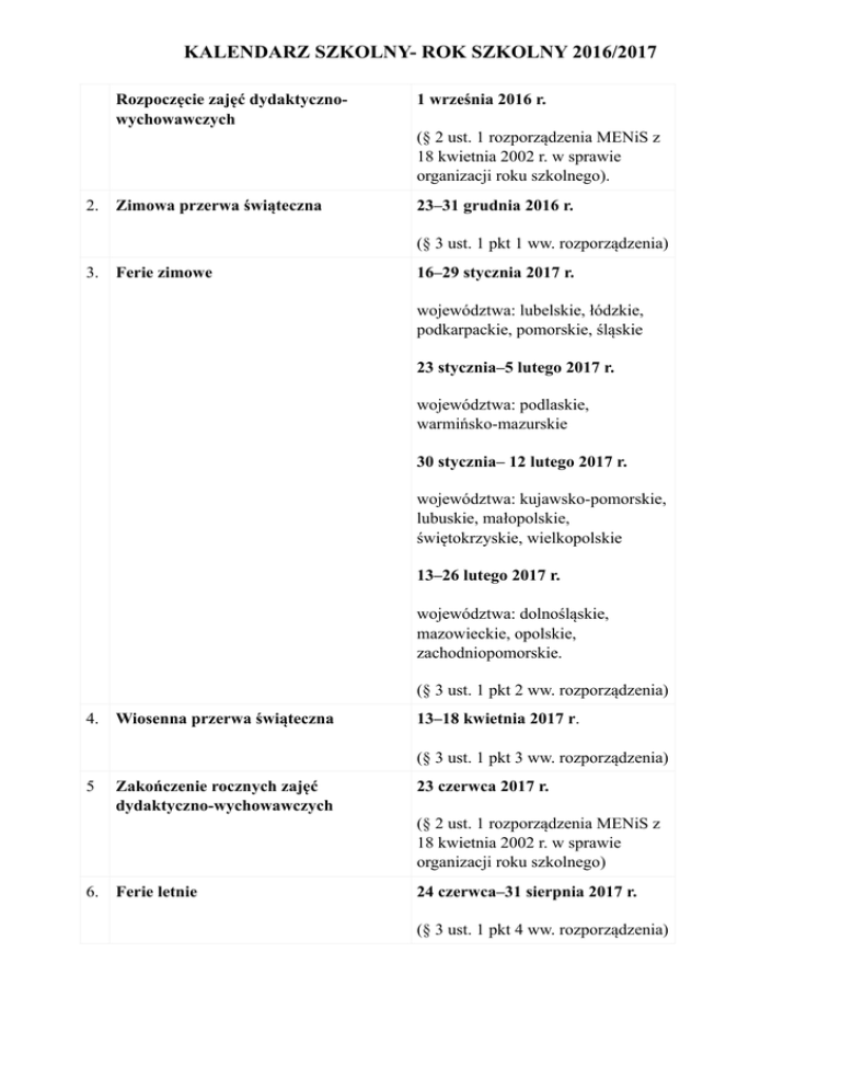 KALENDARZ SZKOLNY- ROK SZKOLNY 2016/2017 Rozpoczęcie zajęć dydaktycznowychowawczych 1 września 2016 r. (§ 2 ust. 1 rozporządzenia MENiS z 18 kwietnia 2002 r. w sprawie organizacji roku szkolnego). 2. Zimowa przerwa świąteczna 23–31 grudnia 2016 r. (§ 3 ust. 1 pkt 1 ww. rozporządzenia) 3. Ferie zimowe 16–29 stycznia 2017 r. województwa: lubelskie, łódzkie, podkarpackie, pomorskie, śląskie 23 stycznia–5 lutego 2017 r. województwa: podlaskie, warmińsko-mazurskie 30 stycznia– 12 lutego 2017 r. województwa: kujawsko-pomorskie, lubuskie, małopolskie, świętokrzyskie, wielkopolskie 13–26 lutego 2017 r. województwa: dolnośląskie, mazowieckie, opolskie, zachodniopomorskie. (§ 3 ust. 1 pkt 2 ww. rozporządzenia) 4. Wiosenna przerwa świąteczna 13–18 kwietnia 2017 r. (§ 3 ust. 1 pkt 3 ww. rozporządzenia) 5 Zakończenie rocznych zajęć dydaktyczno-wychowawczych 23 czerwca 2017 r. (§ 2 ust. 1 rozporządzenia MENiS z 18 kwietnia 2002 r. w sprawie organizacji roku szkolnego) 6. Ferie letnie 24 czerwca–31 sierpnia 2017 r. (§ 3 ust. 1 pkt 4 ww. rozporządzenia)