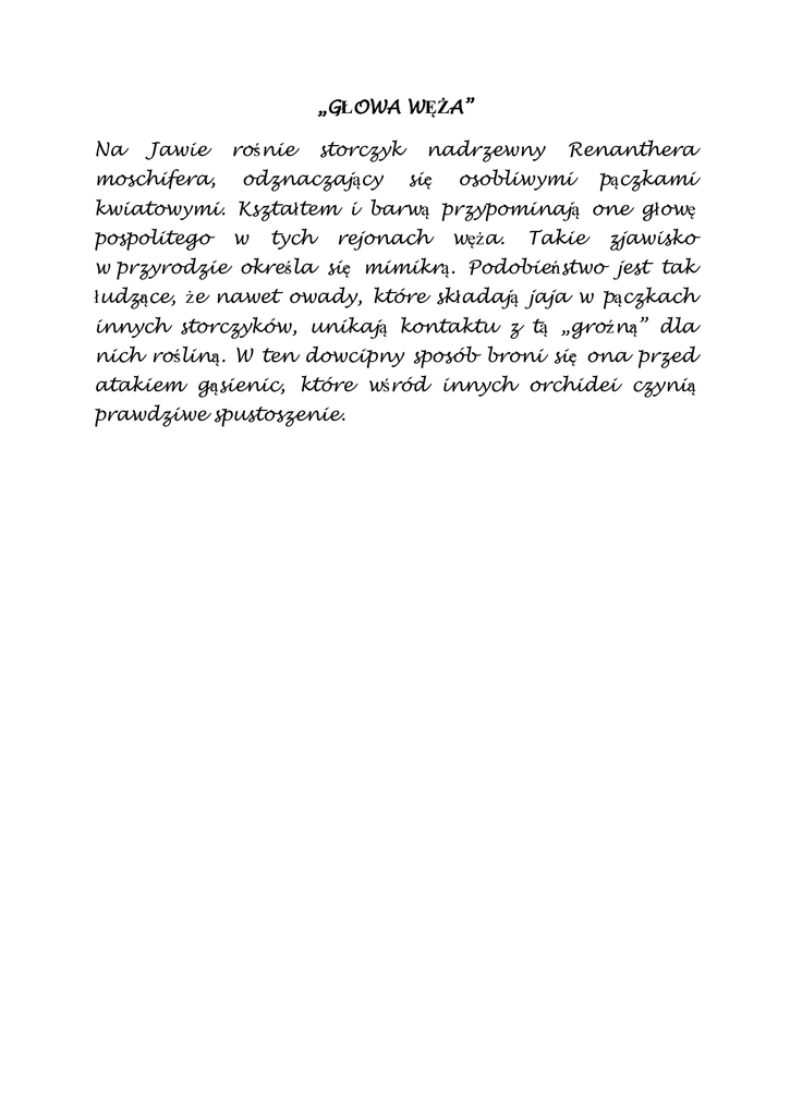 „GŁOWA WĘŻA” Na Jawie moschifera, rośnie storczyk odznaczający nadrzewny się Renanthera osobliwymi pączkami kwiatowymi. Kształtem i barwą przypominają one głowę pospolitego w tych rejonach węża. Takie zjawisko w przyrodzie określa się mimikrą. Podobieństwo jest tak łudzące, że nawet owady, które składają jaja w pączkach innych storczyków, unikają kontaktu z tą „groźną” dla nich rośliną. W ten dowcipny sposób broni się ona przed atakiem gąsienic, które wśród innych orchidei czynią prawdziwe spustoszenie.