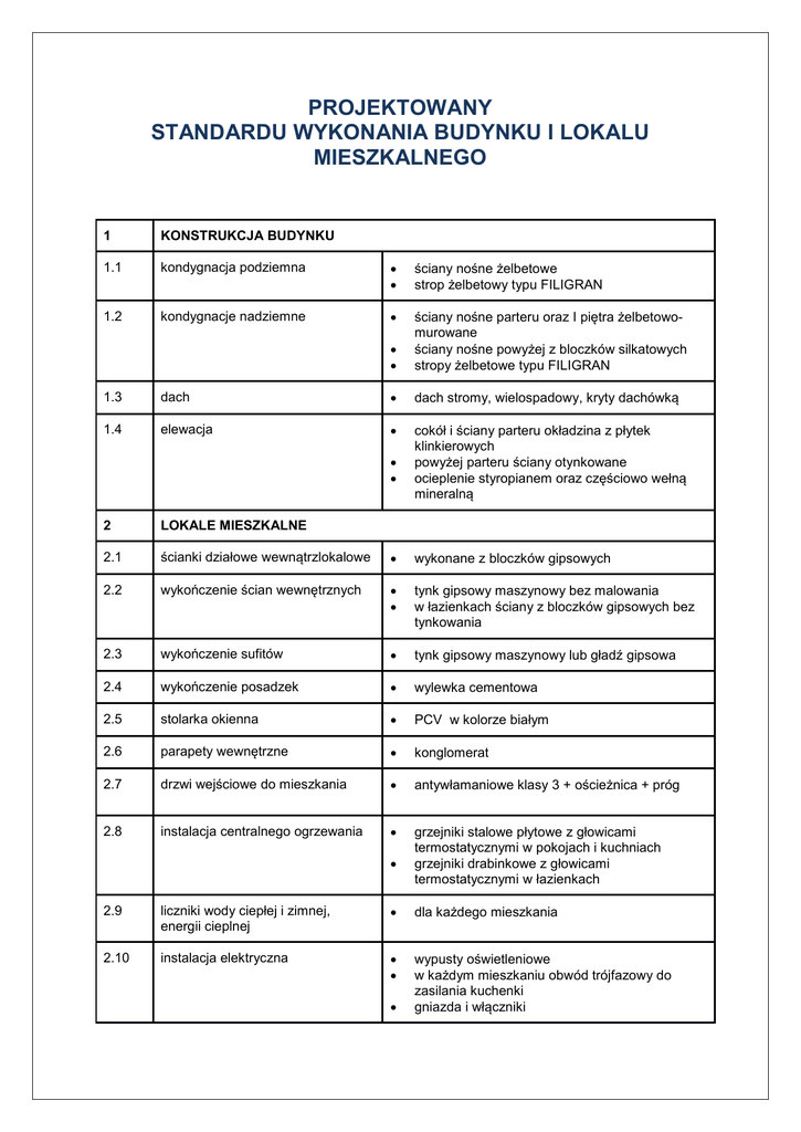 PROJEKTOWANY STANDARDU WYKONANIA BUDYNKU I LOKALU MIESZKALNEGO 1 KONSTRUKCJA BUDYNKU 1.1 kondygnacja podziemna ściany nośne żelbetowe strop żelbetowy typu FILIGRAN 1.2 kondygnacje nadziemne ściany nośne parteru oraz I piętra żelbetowomurowane ściany nośne powyżej z bloczków silkatowych stropy żelbetowe typu FILIGRAN 1.3 dach dach stromy, wielospadowy, kryty dachówką 1.4 elewacja cokół i ściany parteru okładzina z płytek klinkierowych powyżej parteru ściany otynkowane ocieplenie styropianem oraz częściowo wełną mineralną 2 LOKALE MIESZKALNE 2.1 ścianki działowe wewnątrzlokalowe wykonane z bloczków gipsowych 2.2 wykończenie ścian wewnętrznych tynk gipsowy maszynowy bez malowania w łazienkach ściany z bloczków gipsowych bez tynkowania 2.3 wykończenie sufitów tynk gipsowy maszynowy lub gładź gipsowa 2.4 wykończenie posadzek wylewka cementowa 2.5 stolarka okienna PCV w kolorze białym 2.6 parapety wewnętrzne konglomerat 2.7 drzwi wejściowe do mieszkania antywłamaniowe klasy 3 + ościeżnica + próg 2.8 instalacja centralnego ogrzewania grzejniki stalowe płytowe z głowicami termostatycznymi w pokojach i kuchniach grzejniki drabinkowe z głowicami termostatycznymi w łazienkach 2.9 liczniki wody ciepłej i zimnej, energii cieplnej dla każdego mieszkania 2.10 instalacja elektryczna wypusty oświetleniowe w każdym mieszkaniu obwód trójfazowy do zasilania kuchenki gniazda i włączniki 2.11 instalacja telewizyjna, internetowa i telefoniczna jedno gniazdo TV w każdym pokoju jedno gniazdo telefoniczno-internetowe każdym w pokoju 2.12 instalacja domofonowa odbiornik umieszczony w przedpokoju 2.13 instalacja wodno-kanalizacyjna podejścia i odpływy brak armatury sanitarnej i białego montażu 3 BALKONY, TARASY 3.1 balkony, tarasy płytki klinkierowe lub płytki gresowe mrozoodporne 4 KLATKI SCHODOWE 4.1 wykończenie ścian i sufitów ściany tynk gipsowy malowany sufity tynk gipsowy malowany lub gładź gipsowa malowana 4.2 parapety konglomerat 4.3 posadzki płytki gresowe techniczne 4.4 schody płytki gresowe techniczne 4.5 winda obsługująca wszystkie kondygnacje od poziomu piwnic do poddasza 5 GARAŻ PODZIEMNY WIELOSTANOWISKOWY 5.1 posadzka betonowa, zatarta na gładko 5.2 wykończenie ścian beton surowy 5.3 brama wjazdowa brama otwierana automatycznie sterowana pilotem 5.4 oświetlenie kompletna instalacja z oprawami oświetleniowymi sterowanie przy pomocy czujników ruchu oznakowane 5.5 miejsca postojowe 6 KOMÓRKI LOKATORSKIE 6.1 posadzka betonowa, zatarta na gładko 6.2 ścianki działowe murowane, ściana częściowo ażurowa bez tynkowania lub systemowe stalowe 6.3. instalacje instalacja oświetleniowa z oprawą i włącznikiem 6.4 drzwi drzwi stalowe ocynkowane 7 MAŁA ARCHITEKTURA 7.1 drogi i chodnik wewnętrzne kostka betonowa szara 7.2 ogrodzenie siatka stalowa systemowa na cokole betonowym 7.3. komora śmietnikowa wiata śmietnikowa 7.4 pozostała przestrzeń zewnętrzna zieleń wysoka i niska