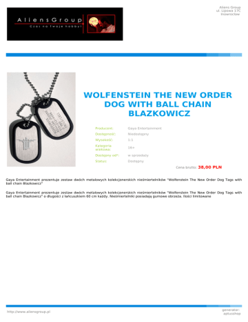 Aliens Group ul. Lipowa 17C Inowrocław WOLFENSTEIN THE NEW ORDER DOG WITH BALL CHAIN BLAZKOWICZ Producent: Gaya Entertainment Dostępność: Niedostępny Wysokość: 1:1 Kategoria wiekowa: 16+ Dostępny od*: w sprzedaży Status: Dostępny Cena brutto: 38,00 PLN Gaya Entertainment prezentuje zestaw dwóch metalowych kolekcjonerskich nieśmiertelników "Wolfenstein The New Order Dog Tags with ball chain Blazkowicz" Gaya Entertainment prezentuje zestaw dwóch metalowych kolekcjonerskich nieśmiertelników "Wolfenstein The New Order Dog Tags with ball chain Blazkowicz" o długości z łańcuszkiem 60 cm każdy. Nieśmiertelniki posiadają gumowe obrzeża. Ilości limitowane http://www.aliensgroup.pl generator: aptusshop