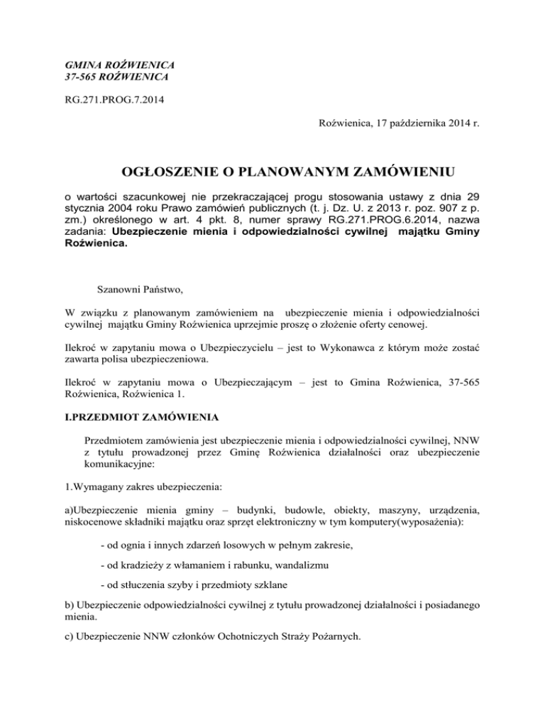 GMINA ROŹWIENICA 37-565 ROŹWIENICA RG.271.PROG.7.2014 Roźwienica, 17 października 2014 r. OGŁOSZENIE O PLANOWANYM ZAMÓWIENIU o wartości szacunkowej nie przekraczającej progu stosowania ustawy z dnia 29 stycznia 2004 roku Prawo zamówień publicznych (t. j. Dz. U. z 2013 r. poz. 907 z p. zm.) określonego w art. 4 pkt. 8, numer sprawy RG.271.PROG.6.2014, nazwa zadania: Ubezpieczenie mienia i odpowiedzialności cywilnej majątku Gminy Roźwienica. Szanowni Państwo, W związku z planowanym zamówieniem na ubezpieczenie mienia i odpowiedzialności cywilnej majątku Gminy Roźwienica uprzejmie proszę o złożenie oferty cenowej. Ilekroć w zapytaniu mowa o Ubezpieczycielu – jest to Wykonawca z którym może zostać zawarta polisa ubezpieczeniowa. Ilekroć w zapytaniu mowa o Ubezpieczającym – jest to Gmina Roźwienica, 37-565 Roźwienica, Roźwienica 1. I.PRZEDMIOT ZAMÓWIENIA Przedmiotem zamówienia jest ubezpieczenie mienia i odpowiedzialności cywilnej, NNW z tytułu prowadzonej przez Gminę Roźwienica działalności oraz ubezpieczenie komunikacyjne: 1.Wymagany zakres ubezpieczenia: a)Ubezpieczenie mienia gminy – budynki, budowle, obiekty, maszyny, urządzenia, niskocenowe składniki majątku oraz sprzęt elektroniczny w tym komputery(wyposażenia): - od ognia i innych zdarzeń losowych w pełnym zakresie, - od kradzieży z włamaniem i rabunku, wandalizmu - od stłuczenia szyby i przedmioty szklane b) Ubezpieczenie odpowiedzialności cywilnej z tytułu prowadzonej działalności i posiadanego mienia. c) Ubezpieczenie NNW członków Ochotniczych Straży Pożarnych. d) Ubezpieczenie komunikacyjne OC, AC (wybrane pojazdy).NNW. 2.Wymagany okres ochrony ubezpieczeniowej: Podany jest w załączniku nr 3 do niniejszego zapytania. Płatność po wystawieniu polisy w ciągu 14 dni od pierwszego dnia okresu ubezpieczenia. Polisy należy wystawiać zgodnie z terminami przedstawionymi w załączniku nr 3 oraz w uzgodnieniu Ubezpieczającym w rozbiciu na ubezpieczenia majątku wodociągów i kanalizacji, komunikacyjne i pozostałe. II.WARUNKI UDZIAŁU W POSTĘPOWANIU W postępowaniu mogą wziąć udział oferenci, którzy posiadają zezwolenia na wykonywanie działalności ubezpieczeniowej na terytorium Rzeczpospolitej Polskiej zgodnie z Ustawą z dnia 22 maja 2003 r. o działalności ubezpieczeniowej (tekst jednolity Dz.U. 2013, poz.950 z późn. zm.) 1. O udzielenie zamówienia mogą ubiegać się Oferenci, którzy wyrażą zgodę na: a. zawarcie polis ubezpieczeniowych na warunkach wskazanych w niniejszym postępowaniu. b. objęcie ochroną ubezpieczeniową mienia we wskazanych lokalizacjach. c. niezmienność stawek rocznych wynikających ze złożonej oferty przez cały okres obowiązywania umowy-polisy i we wszystkich rodzajach ubezpieczeń, d. przyjęcie warunków wymaganych dla poszczególnych rodzajów ubezpieczeń 2. Składający oferty muszą również załączyć wypełniony i podpisany przez osoby upoważnione do reprezentowania Ubezpieczyciela oświadczenie potwierdzające posiadanie pełnomocnictwa do wykonywania działalności w zakresie ubezpieczeń oraz potwierdzające przyjęcie warunków stawianych przez Ubezpieczającego – bez zastrzeżeń.(Załącznik nr 1) III.KRYTERIA WYBORU WYKONAWCY Do realizacji zamówienia zostanie wybrany Ubezpieczyciel, który zaoferuje najniższą cenę za kompleksowe ubezpieczenie majątku oraz podpisze umowę – wzór załącznik nr 11. Ubezpieczający nie dopuszcza składania ofert częściowych. IV.ZAMAWIAJĄCY Gmina Roźwienica, 37-565 Roźwienica, Roźwienica 1. NIP 792-200-33-879 Regon: 650900387 Osobą upoważnioną do kontaktów jest Pan Franciszek Liszka – tel 16 6225822 wew. 22 lub Pan Marian Gdula – tel. 16 6225822 wew. 33 od poniedziałku do piątku w godzinach 8,0015,00. V.SZCZEGÓŁOWE WARUNKI UBEZPIECZENIA A. 1. Od ognia i innych zdarzeń losowych. Zakres: pożar, bezpośrednie i pośrednie uderzenia pioruna, wybuch, upadek statku powietrznego, huragan, deszcz nawalny, zalanie, grad, dym, huk ponaddźwiękowy, powódź, śnieg, uderzenia drzew, konarów oraz innych przedmiotów, uderzenie pojazdu lądowego, trzęsienie ziemi. Szkody wodno-kanalizacyjne powstałe w skutek bezpośredniego działania wody lub innych cieczy jeżeli przyczyną szkód było wydostanie się ich z przewodów i urządzeń wodociągowych, kanalizacyjnych, centralnego ogrzewania znajdujących się w budynku jak też na terenie posesji objętej ubezpieczeniem. Szkody powstałe poprzez: cofnięcie się wody, ścieków z urządzeń kanalizacyjnych, nieumyślne pozostawienie otwartych kranów i zaworów, powstałe podczas awarii urządzeń i instalacji wod-kan i c.o., powstałe na skutek przepięcia – prądu elektrycznego w tym też powstałe w czasie wyładowań atmosferycznych. 1. Ubezpieczenie mienia gminy – budynki, budowle, obiekty, maszyny, urządzenia, niskocenowe składniki majątku oraz sprzęt elektroniczny w tym komputery. Wartości ubezpieczenia podane są w. tabelach - załącznikach nr 4, nr 5, Stan techniczny budynków podany jest w załączniku nr 7 Rozszerzenie zakresu ubezpieczenia a. O szkody wyrządzone przez: drzewa znajdujące się w sąsiedztwie wskutek ich przewrócenia, opadnięcia bądź oderwania: limit 50 000,00 zł na jedno zdarzenie limit 50 000,00 zł na wszystkie zdarzenia, b. O szkody wyrządzone przez mróz oraz pęknięcie ułożonych poza budynkiem rur doprowadzających media wodnokanalizacyjne bądź grzewcze: limit 50 000,00 zł na jedno zdarzenie limit 50 000,00 zł na wszystkie zdarzenia, 1. FRANSZYZA integralna : 300 PLN, 2. FRANSZYZA redukcyjna: zniesiona 3. UDZIAŁ własny: zniesiony Klauzule do ubezpieczenia od ognia i innych zdarzeń losowych: Klauzula Reprezentantów. Ubezpieczyciel nie ponosi odpowiedzialności za szkody powstałe wyłącznie wskutek winy umyślnej lub rażącego niedbalstwa reprezentantów Ubezpieczającego. Za reprezentantów Ubezpieczającego uważa się osoby, które uprawnio