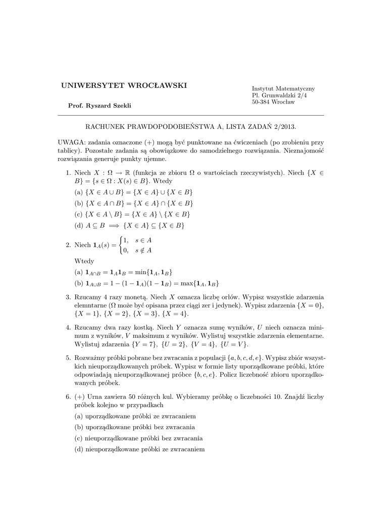 RACHUNEK PRAWDOPODOBIEŃSTWA A, LISTA ZADAŃ 2/2013.
